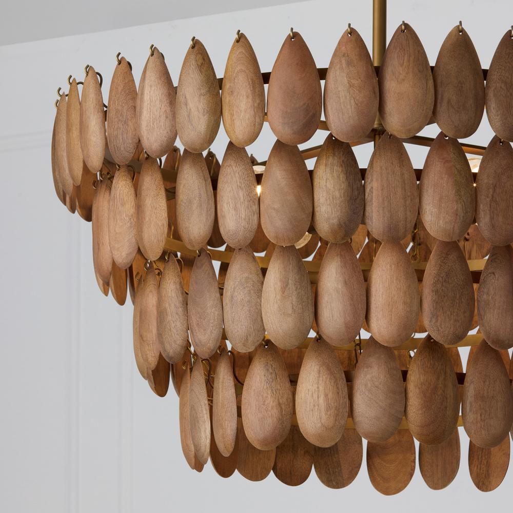 DETAILS: Handcrafted mango wood teardrops in a cascading silhouette create artisan elegance, paired with a Patinaed Brass finish for added shine. Natural variation will occur.
