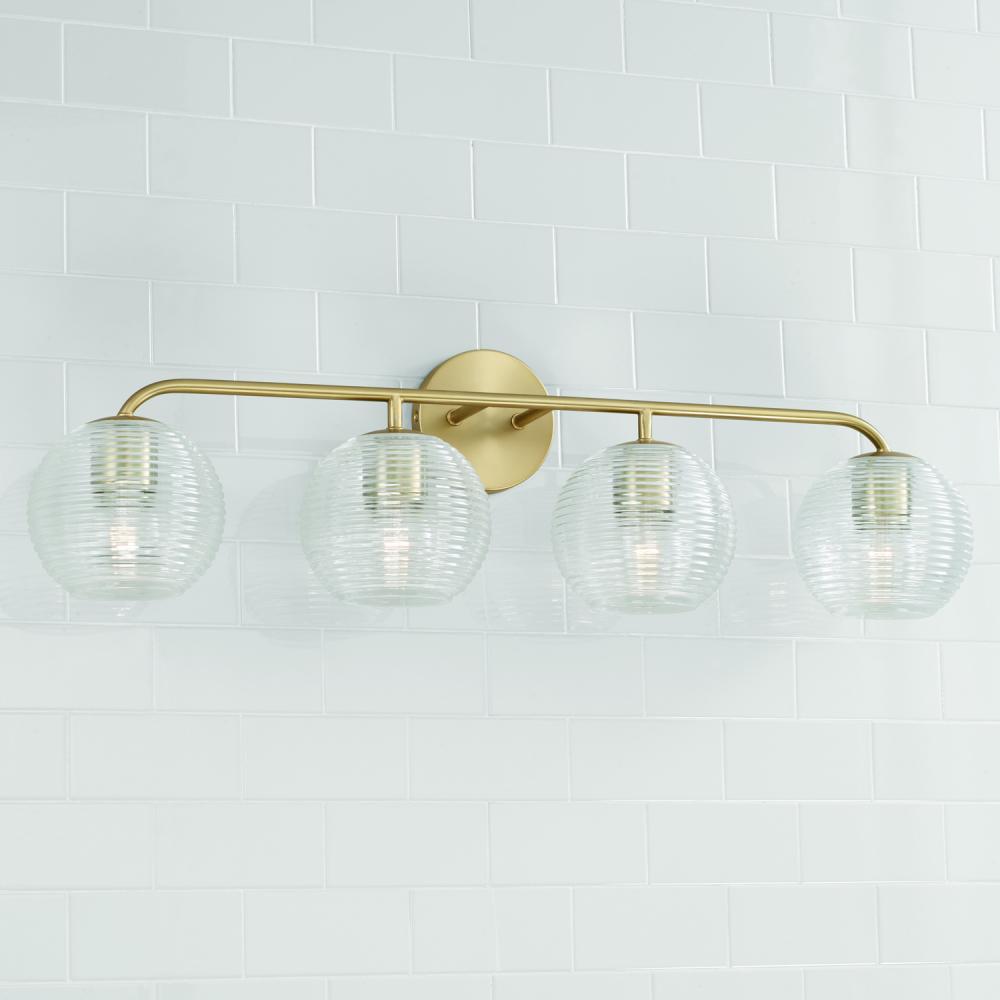 33.5"W x 9.5"H 4-Light Vanity in Matte Brass with Clear Ribbed Glass