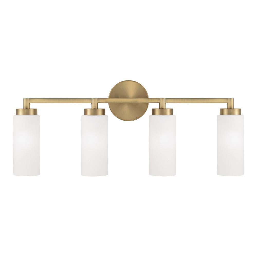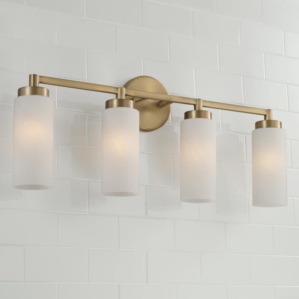 Sleek forms and modern contours create the Alyssa 4-Light Vanity. The Aged Brass finish adds warmth to the earthy, elegant Faux Alabaster glass shades, while the elongated lines deliver sophisticated style. Hang socket facing up or down to seamlessly suit any space.