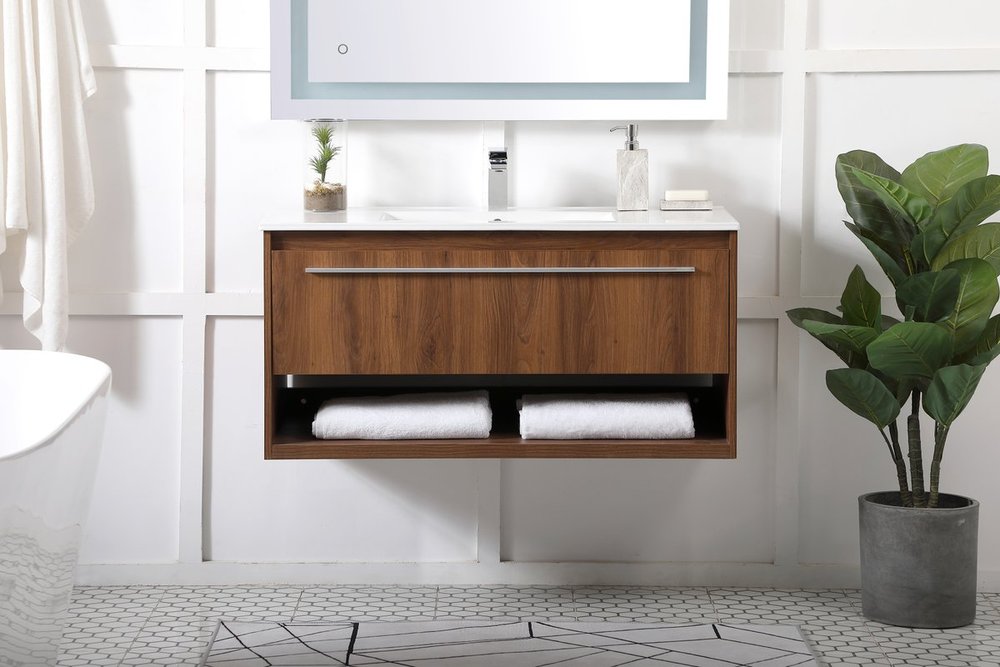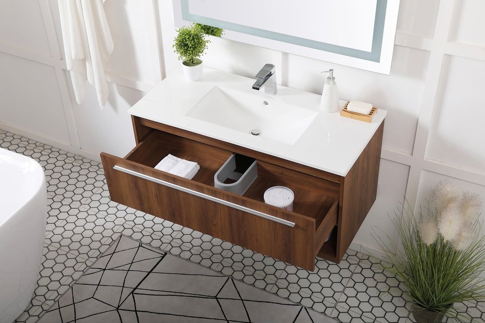 Save space and make your bathroom appear bigger with this 40" floating vanity in a walnut brown finish. Its minimal design will have you in awe, while its clean lines will leave your room feeling fresh and uncluttered. The Single u-drawer pulls out for storage while the open space below allows you to place extra towels or various other essentials.