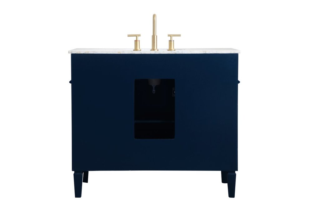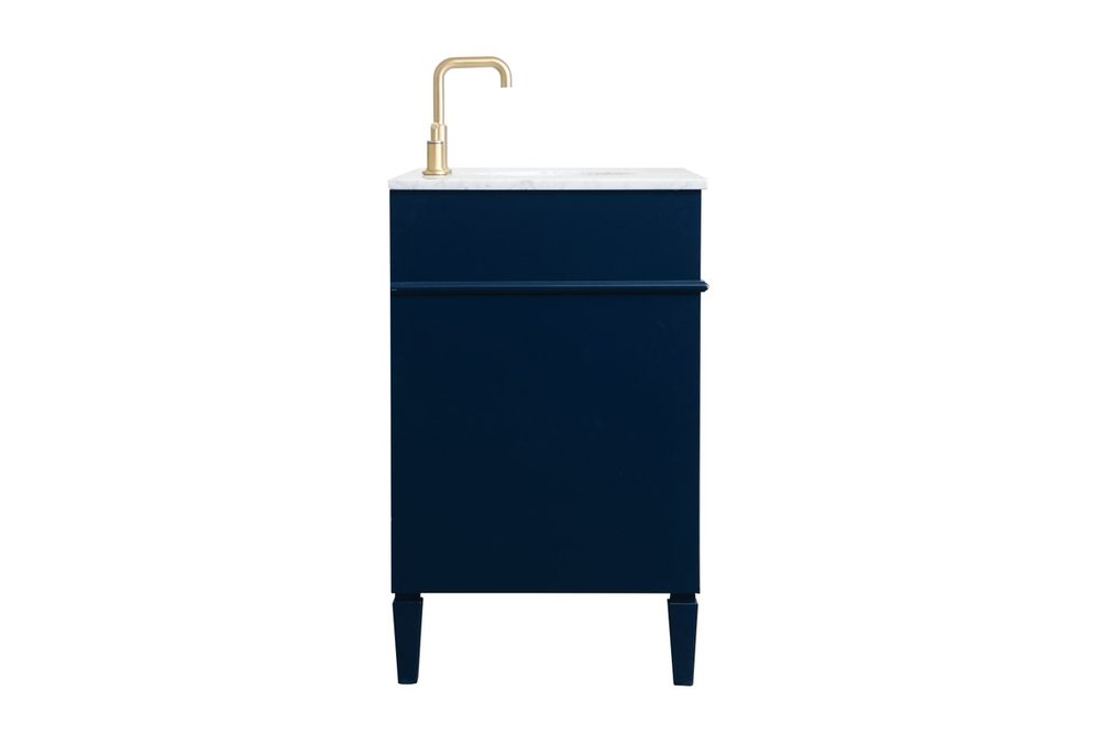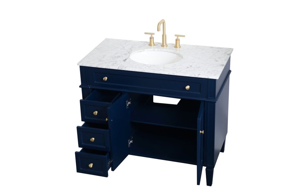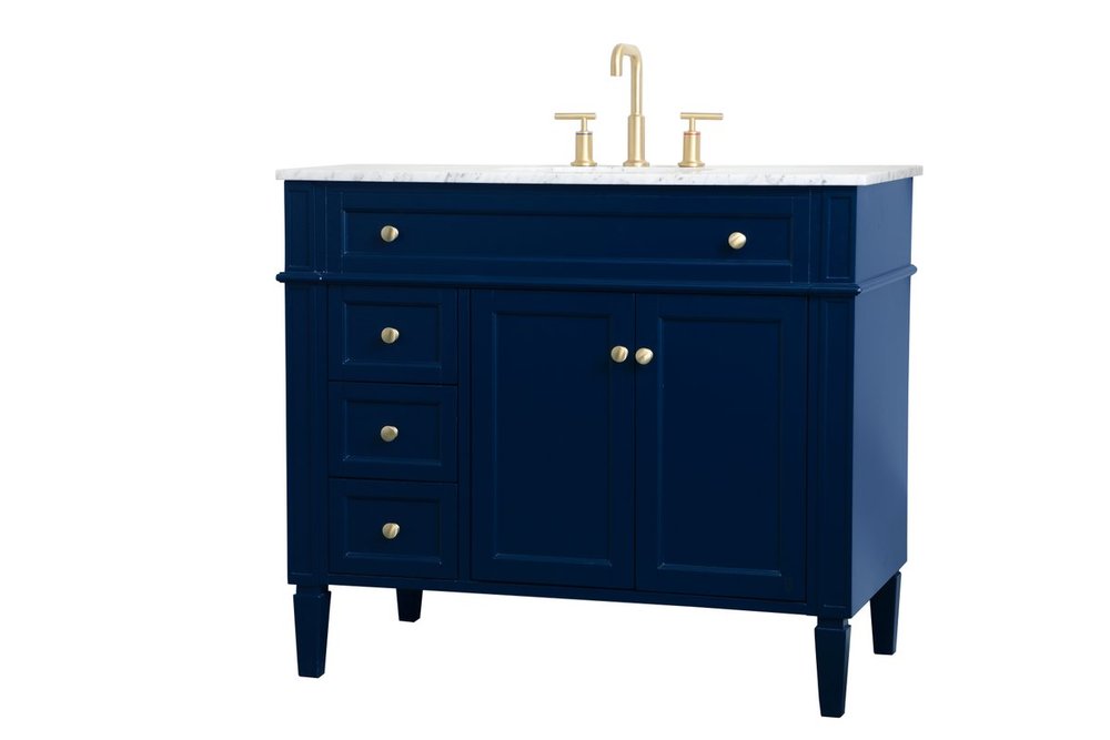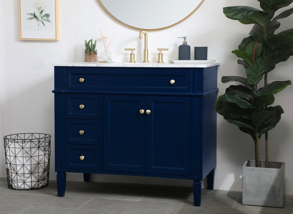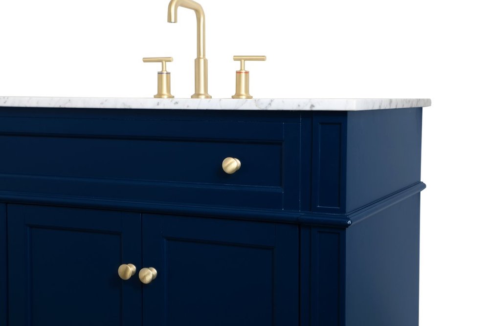 Modern sophistication is defined within the urbane blue finish and brushed gold knobs of this vanity. Its charming style it the perfect addition to any home, and saves space with its storage area hidden behind the double cabinet doors and 3 side drawers. Topped with a Carrara white marble counter top and a porcelain sink, this design will add everlasting class to your bathroom and powder room.