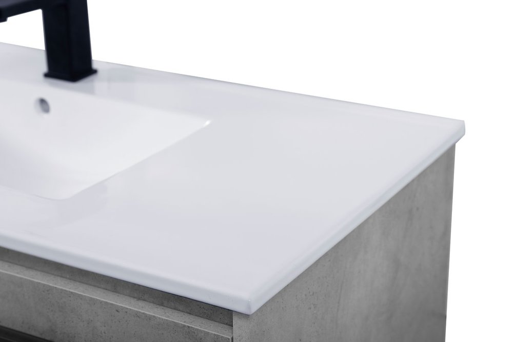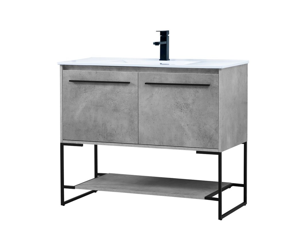 Live in modern comfort with this 40" concrete grey finish vanity. Dressed in a concrete grey and sleek black metal hardware, its contemporary style will have your bathroom or powder room elevated in industrial sophistication. The open shelf at the base and two doors reveal ample storage space for your bathroom essentials and miscellany. Clean lines create its own visual interest, adding trendy looks to your already chic room.