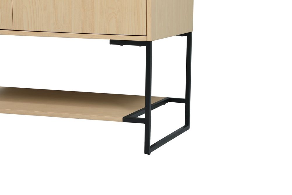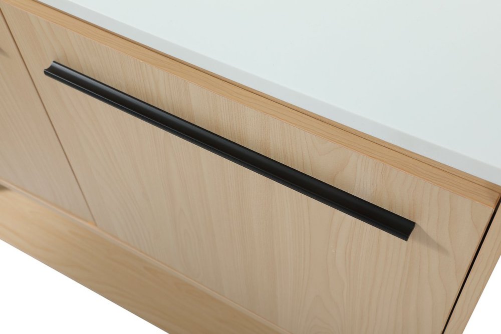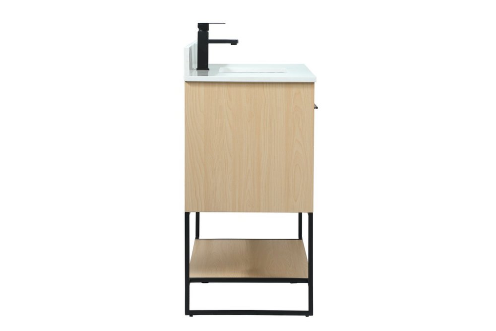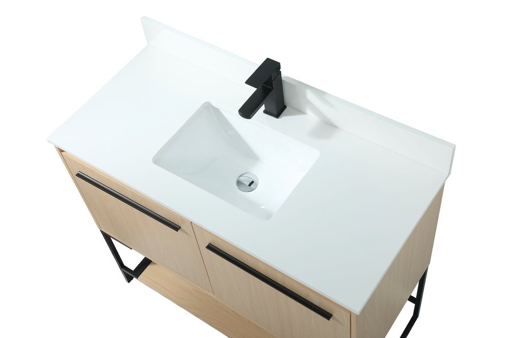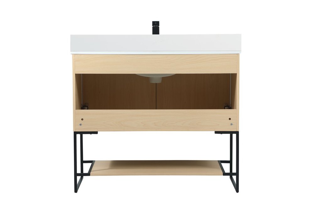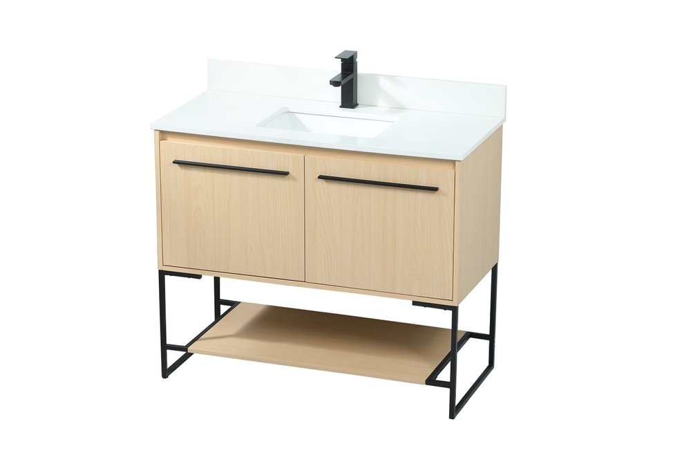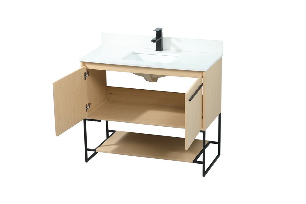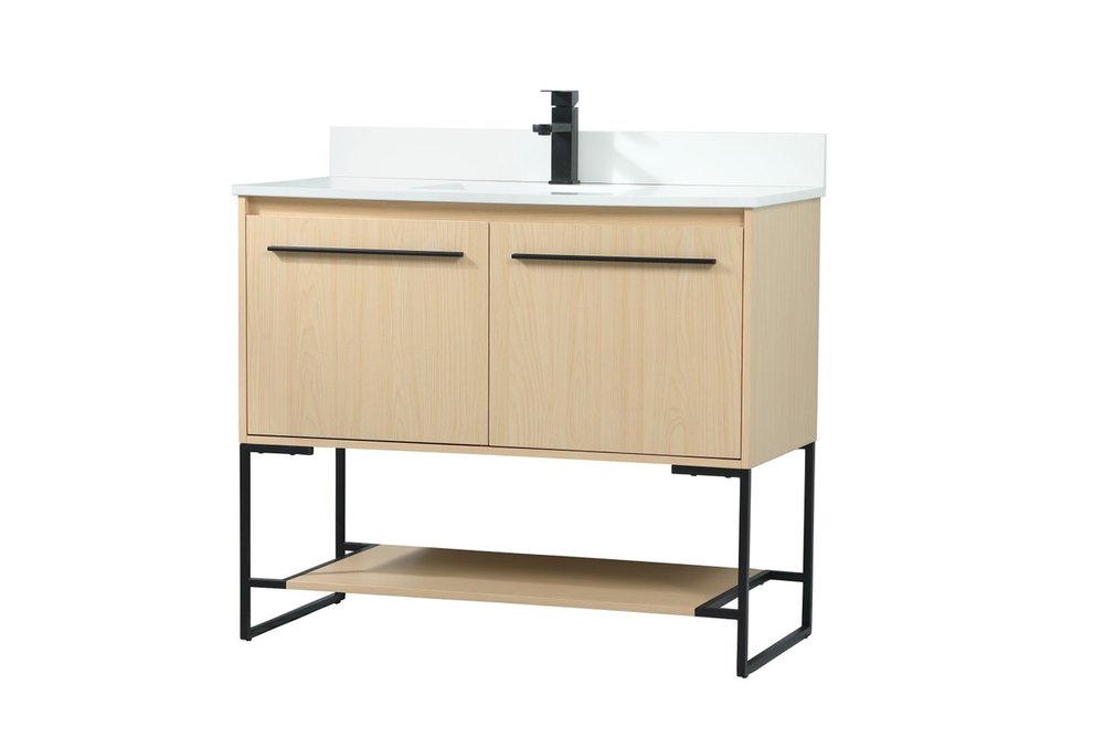 Live in modern comfort with this 40" maple finish vanity. Dressed in a maple and sleek black metal hardware, its contemporary style will have your bathroom or powder room elevated in industrial sophistication. The open shelf at the base and two doors reveal ample storage space for your bathroom essentials and miscellany. Clean lines create its own visual interest, adding trendy looks to your already chic room. Comes with a matching backsplash to complete the look and protects your wall.