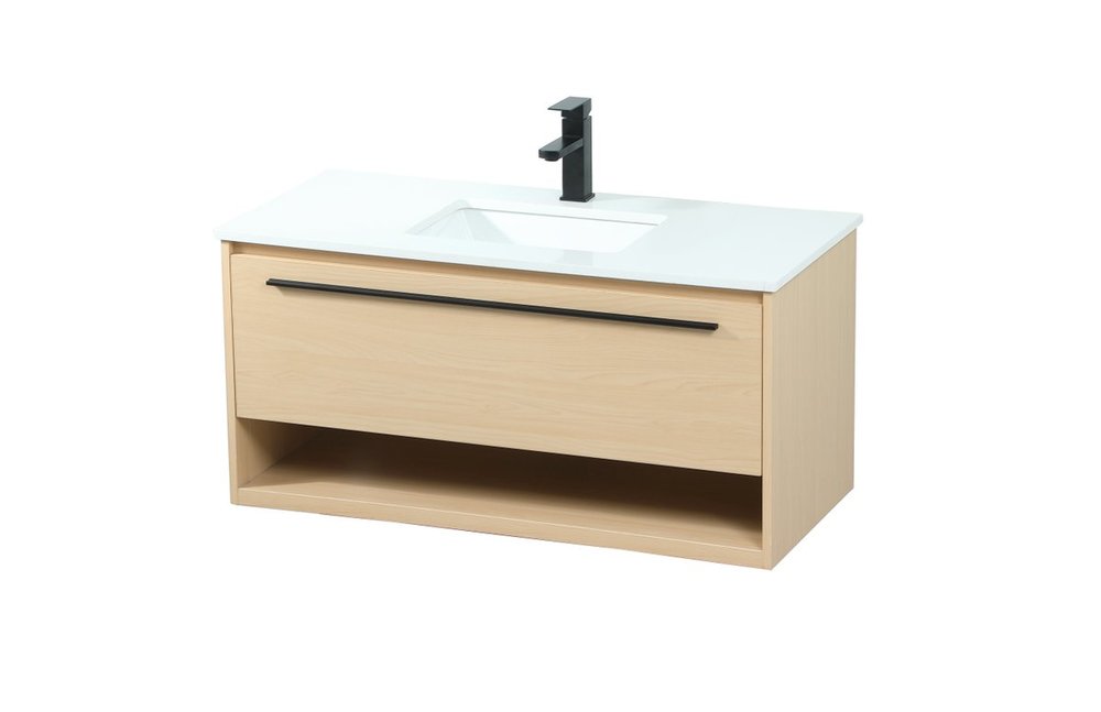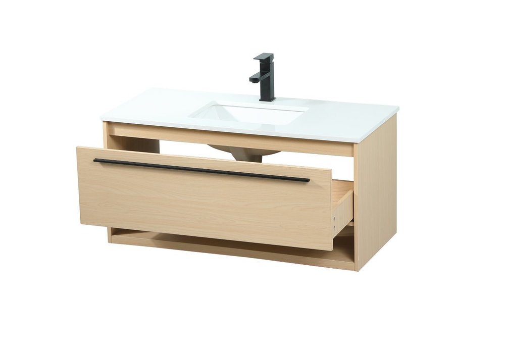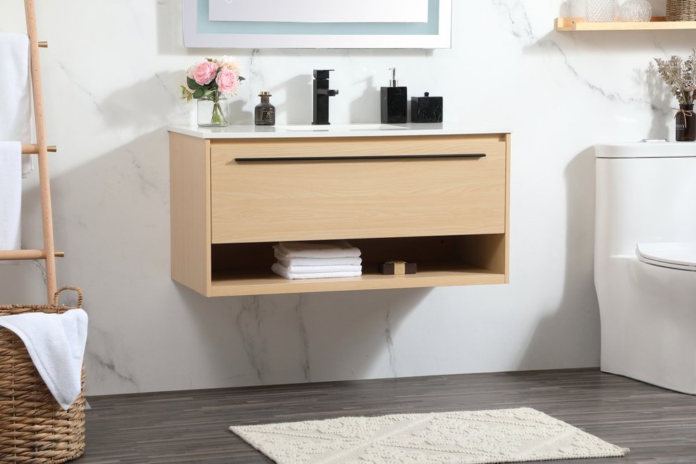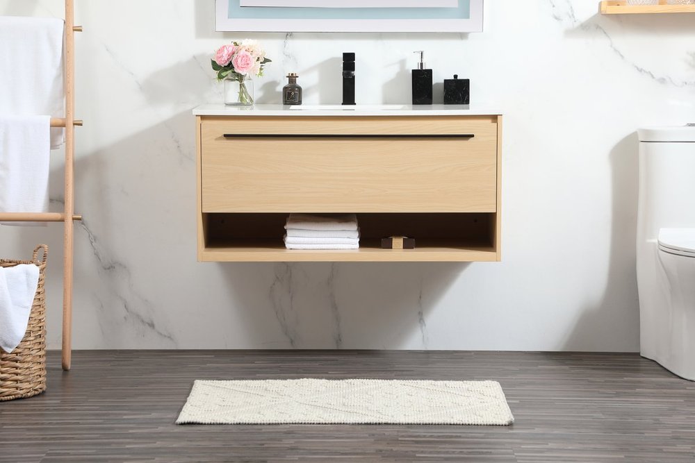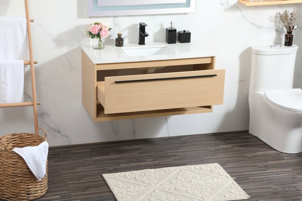 Save space and make your bathroom appear bigger with this floating vanity. Its minimal design will have you in awe, while its clean lines will leave your room feeling fresh and uncluttered. The Single u-drawer pulls out for storage while the open space below allows you to place extra towels or various other essentials. The ivory white engineered marble counter top with porcelain sink adds refined luxe while the aluminum barpull style handle adorn the vanity face.