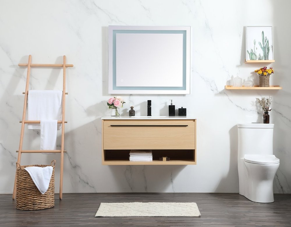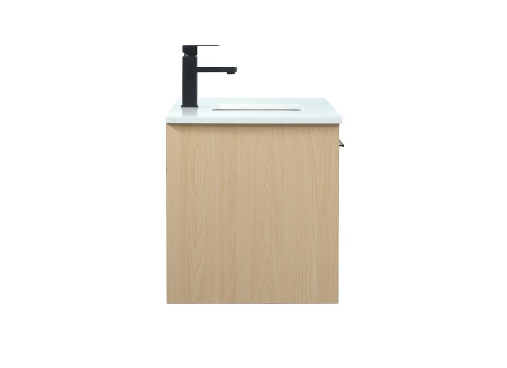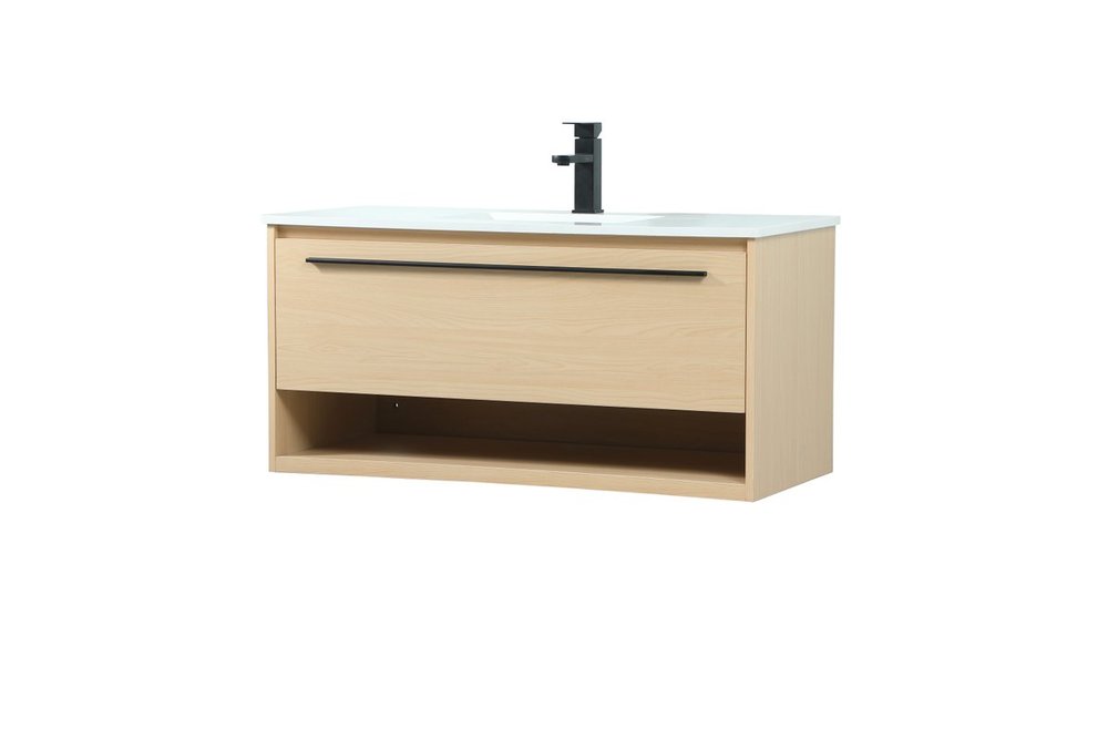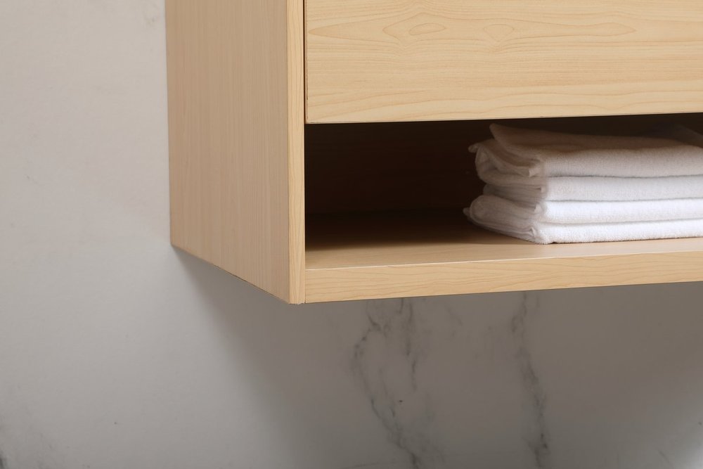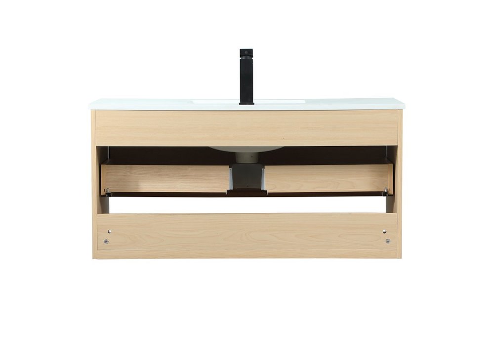 Save space and make your bathroom appear bigger with this floating vanity. Its minimal design will have you in awe, while its clean lines will leave your room feeling fresh and uncluttered. The Single u-drawer pulls out for storage while the open space below allows you to place extra towels or various other essentials. The ivory white engineered marble counter top with porcelain sink adds refined luxe while the aluminum barpull style handle adorn the vanity face.