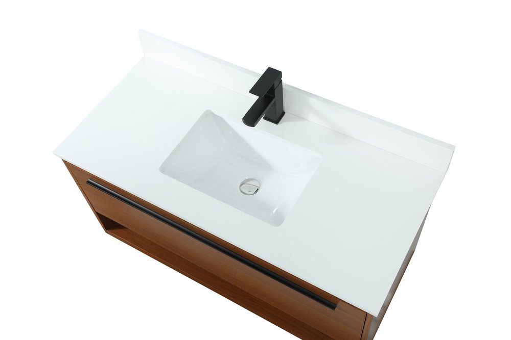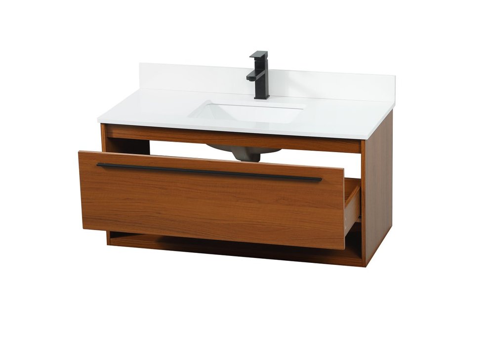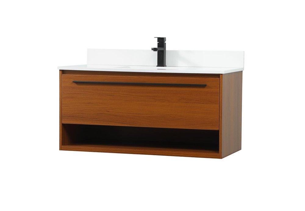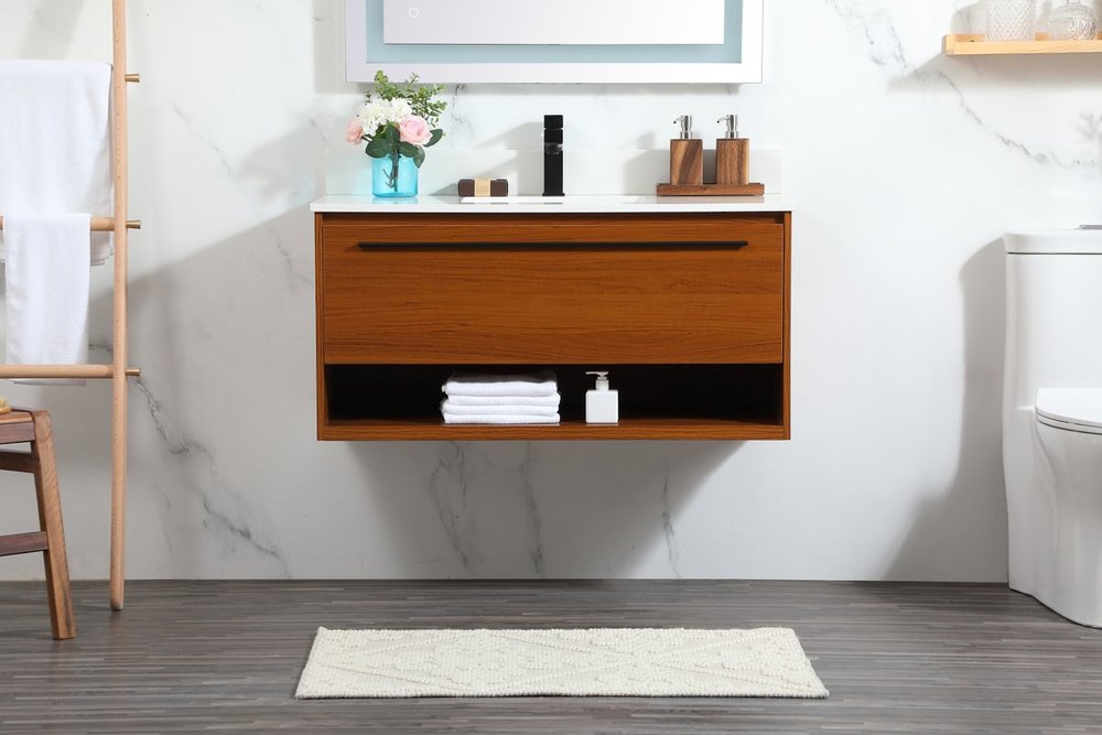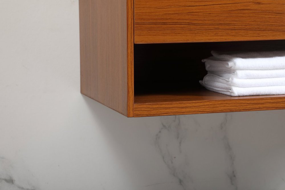 Save space and make your bathroom appear bigger with this floating vanity. Its minimal design will have you in awe, while its clean lines will leave your room feeling fresh and uncluttered. The Single u-drawer pulls out for storage while the open space below allows you to place extra towels or various other essentials. The ivory white engineered marble counter top with porcelain sink adds refined luxe while the aluminum barpull style handle adorn the vanity face. Comes with a matching backsplash to protect your walls.