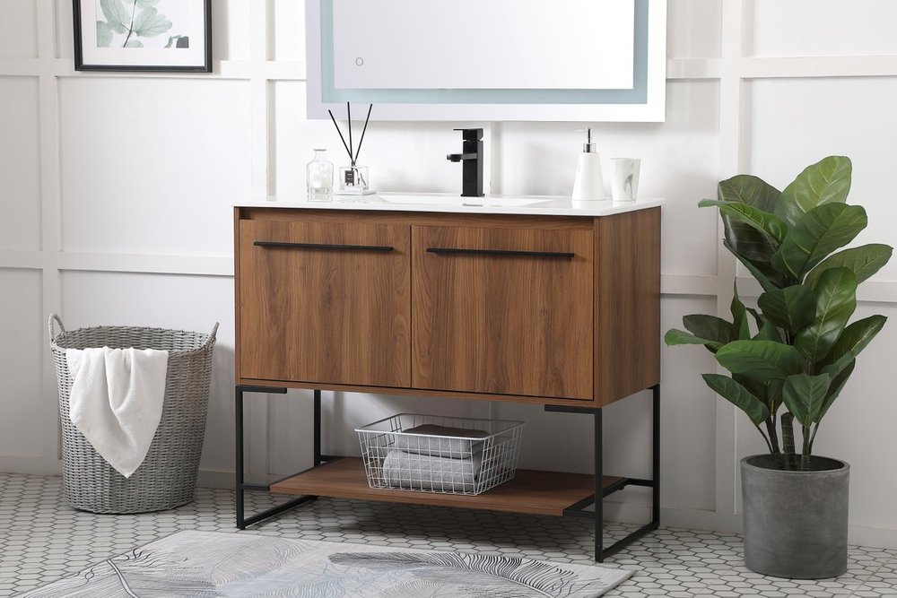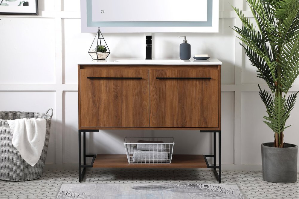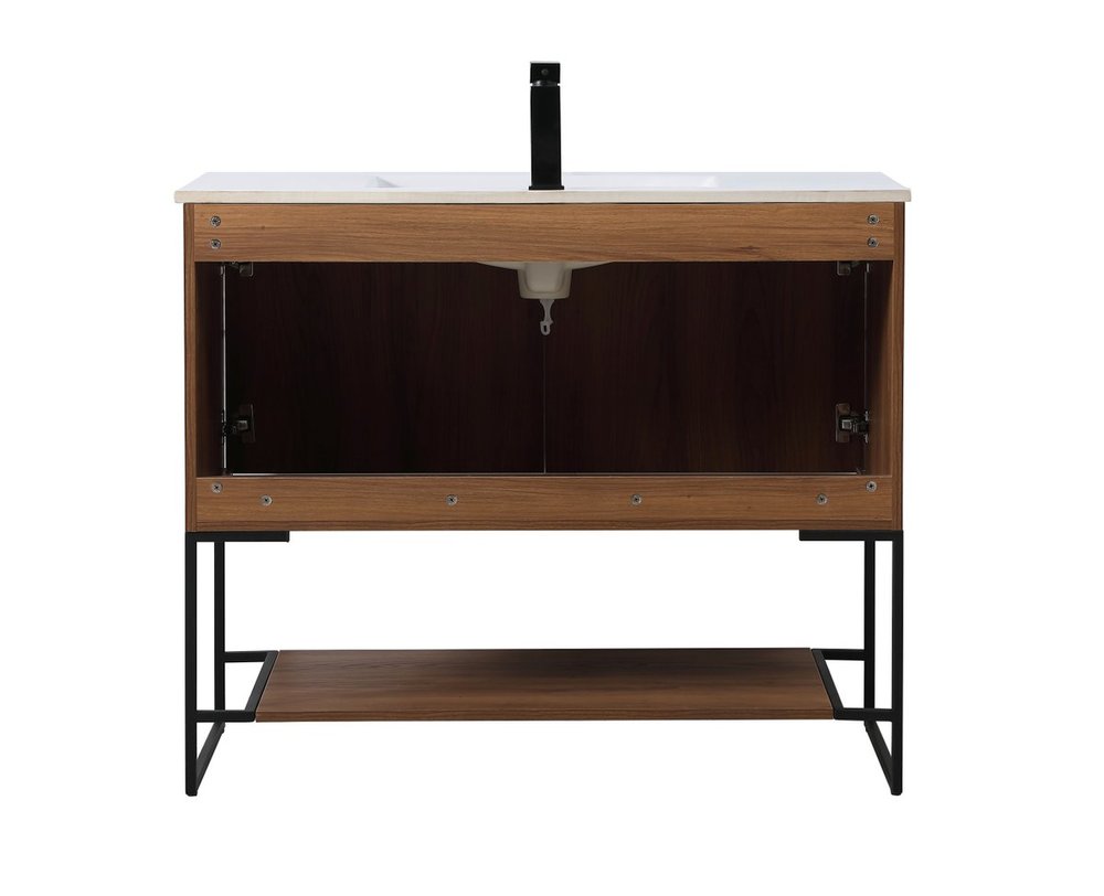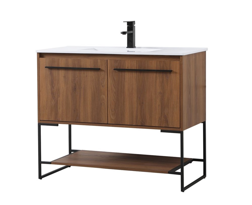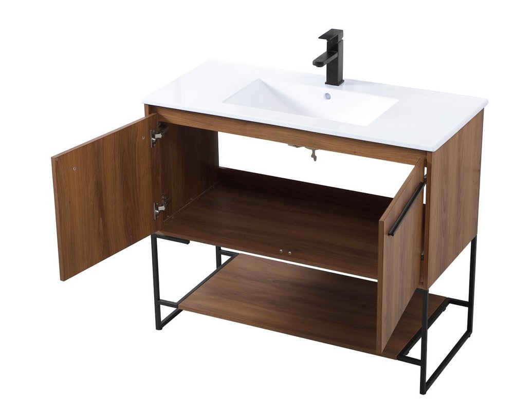 Live in modern comfort with this 40" walnut brown finish vanity. Dressed in a concrete grey and sleek black metal hardware, its contemporary style will have your bathroom or powder room elevated in industrial sophistication. The open shelf at the base and two doors reveal ample storage space for your bathroom essentials and miscellany. Clean lines create its own visual interest, adding trendy looks to your already chic room.