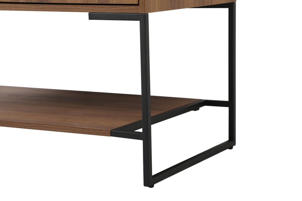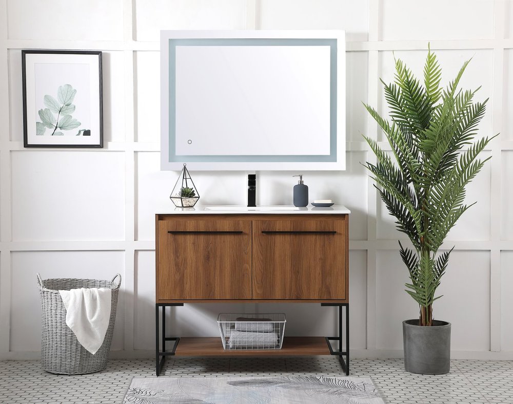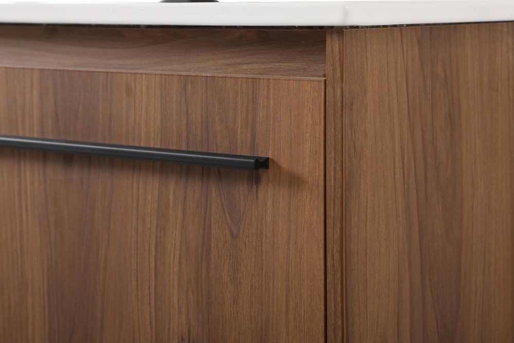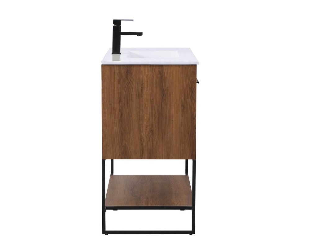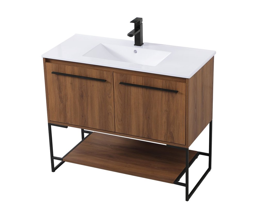 Live in modern comfort with this 40" walnut brown finish vanity. Dressed in a concrete grey and sleek black metal hardware, its contemporary style will have your bathroom or powder room elevated in industrial sophistication. The open shelf at the base and two doors reveal ample storage space for your bathroom essentials and miscellany. Clean lines create its own visual interest, adding trendy looks to your already chic room.