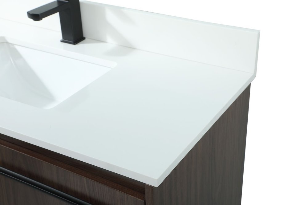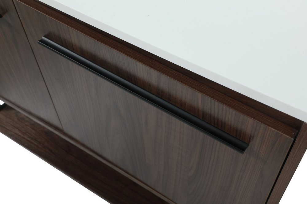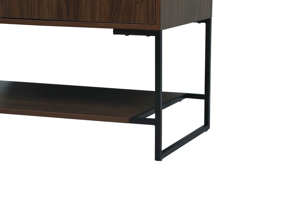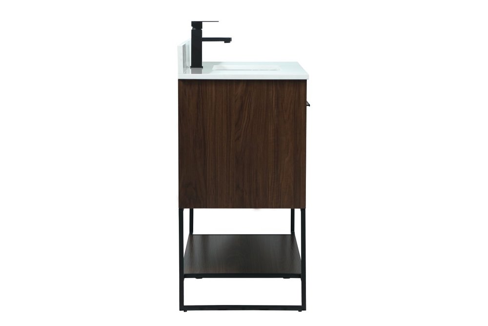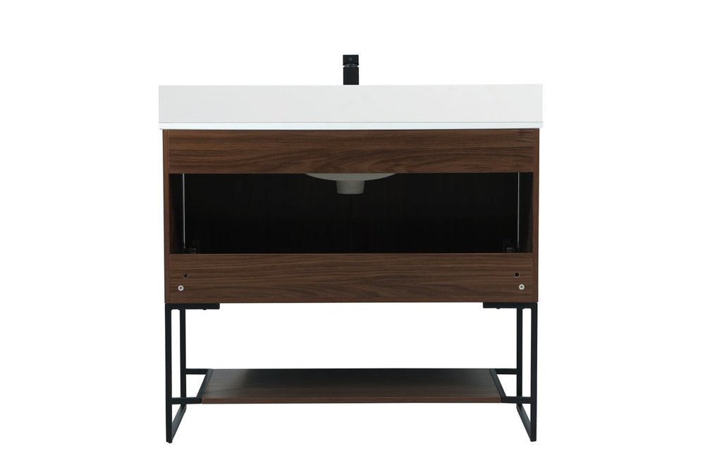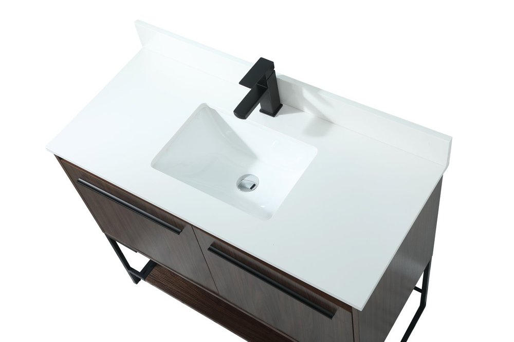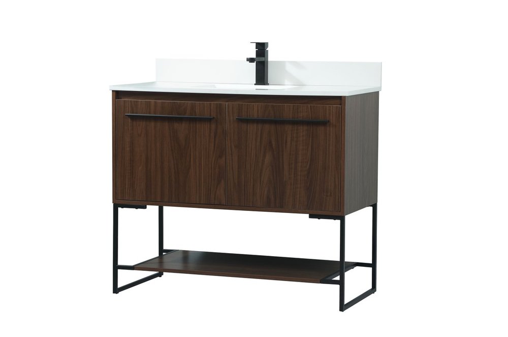 Live in modern comfort with this 40" walnut finish vanity. Dressed in a walnut and sleek black metal hardware, its contemporary style will have your bathroom or powder room elevated in industrial sophistication. The open shelf at the base and two doors reveal ample storage space for your bathroom essentials and miscellany. Clean lines create its own visual interest, adding trendy looks to your already chic room. Comes with a matching backsplash to complete the look and protects your wall.