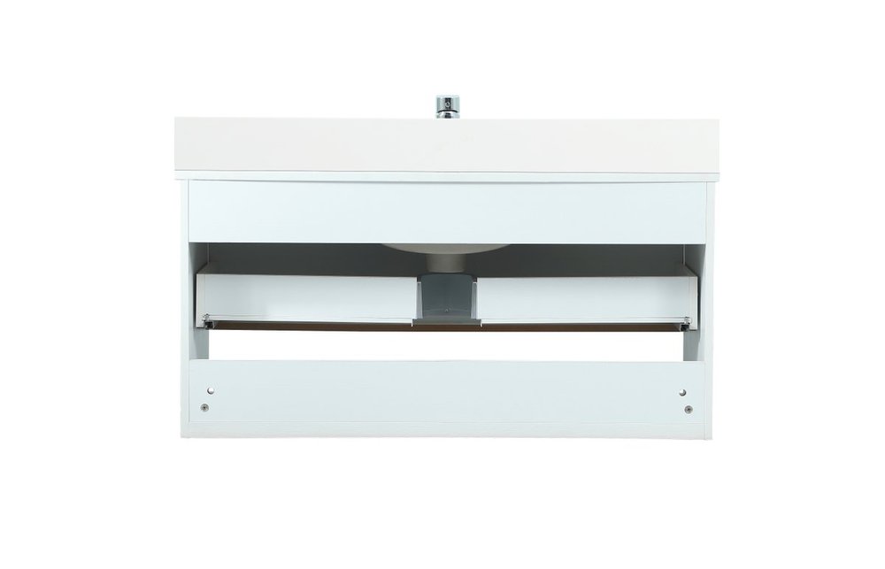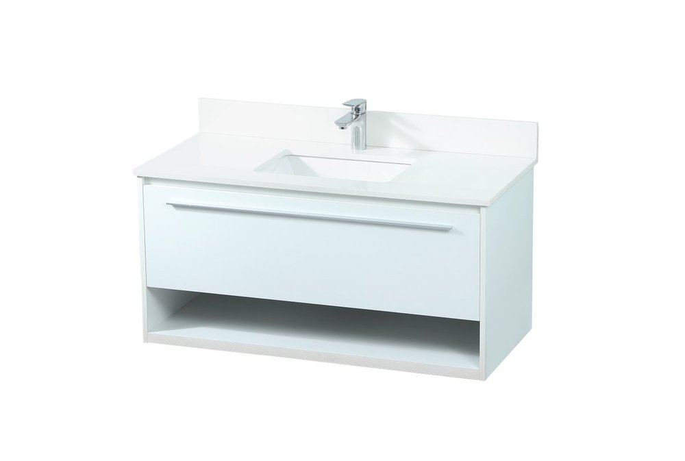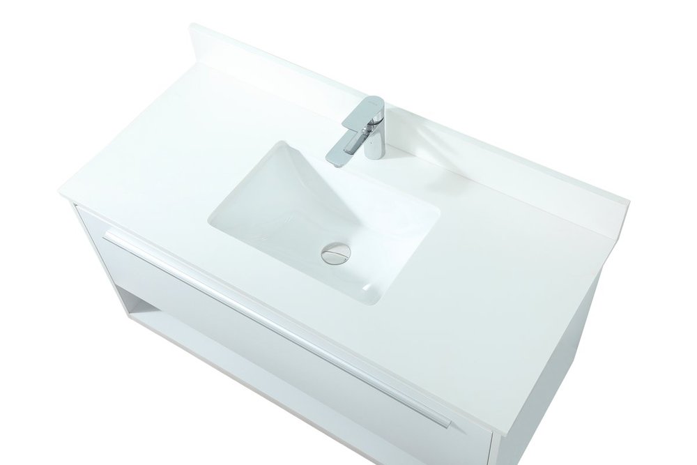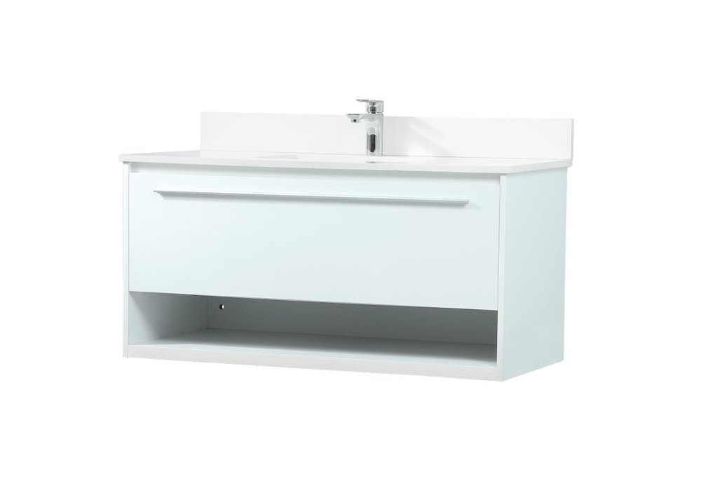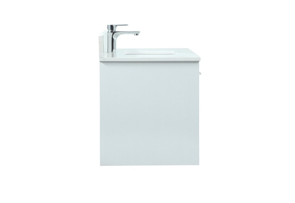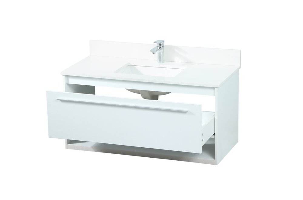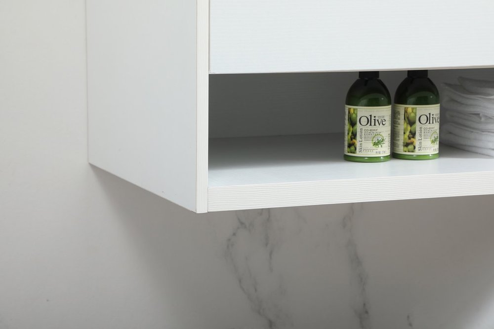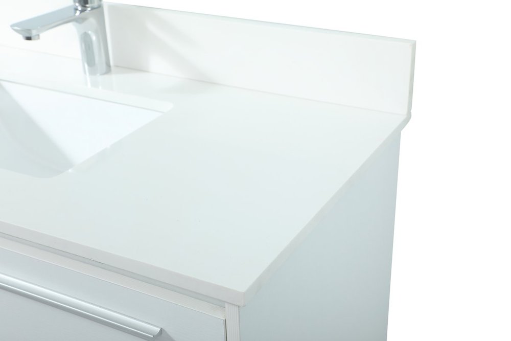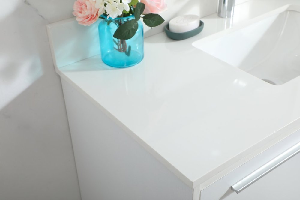 Save space and make your bathroom appear bigger with this floating vanity. Its minimal design will have you in awe, while its clean lines will leave your room feeling fresh and uncluttered. The Single u-drawer pulls out for storage while the open space below allows you to place extra towels or various other essentials. The ivory white engineered marble counter top with porcelain sink adds refined luxe while the aluminum barpull style handle adorn the vanity face. Comes with a matching backsplash to protect your walls.