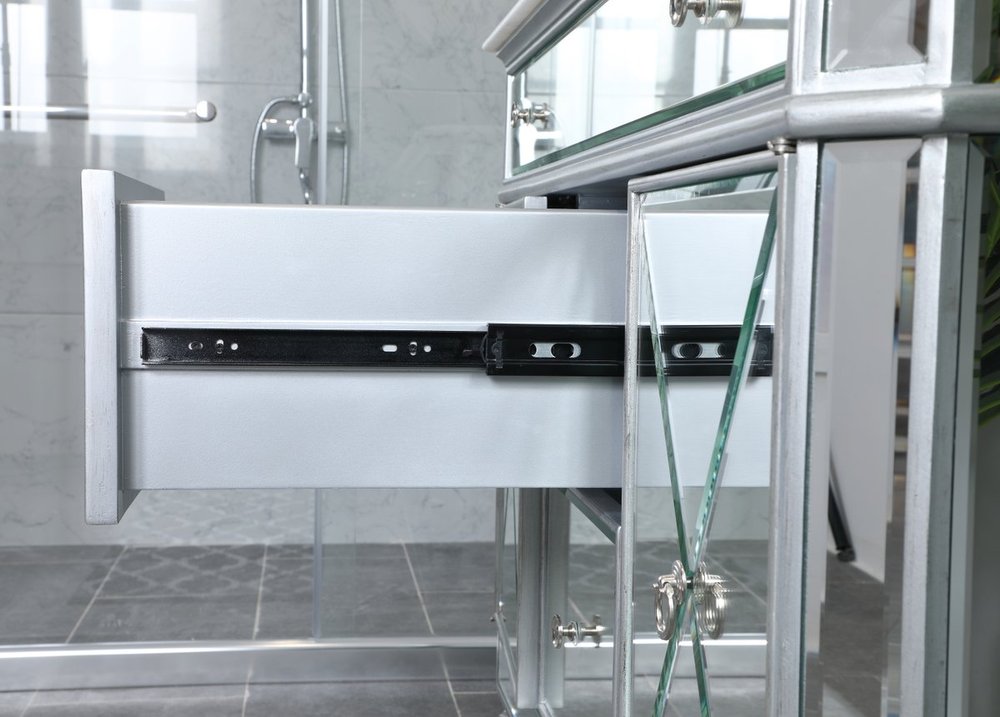 Radiance and opulence, the 42” camille collection vanity brings a tasteful statement to any home and office bathroom. Topping with a lustrous white marble, 2 center drawers and 2 side doors with shelving inside, in clear bevel-edged mirror, hand rubbed silver finish, brushed steel knobs, this contemporary vanity will add a clean, sharp contemporary look and destine to please. Measurements: W42”xD21”xH35”. White marble, due to the nature of natural stone, no two slabs of marble are the same.
