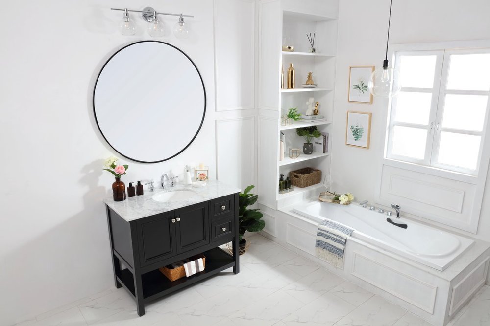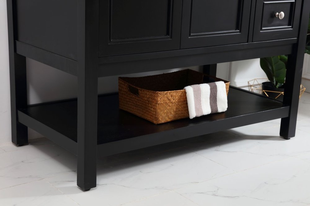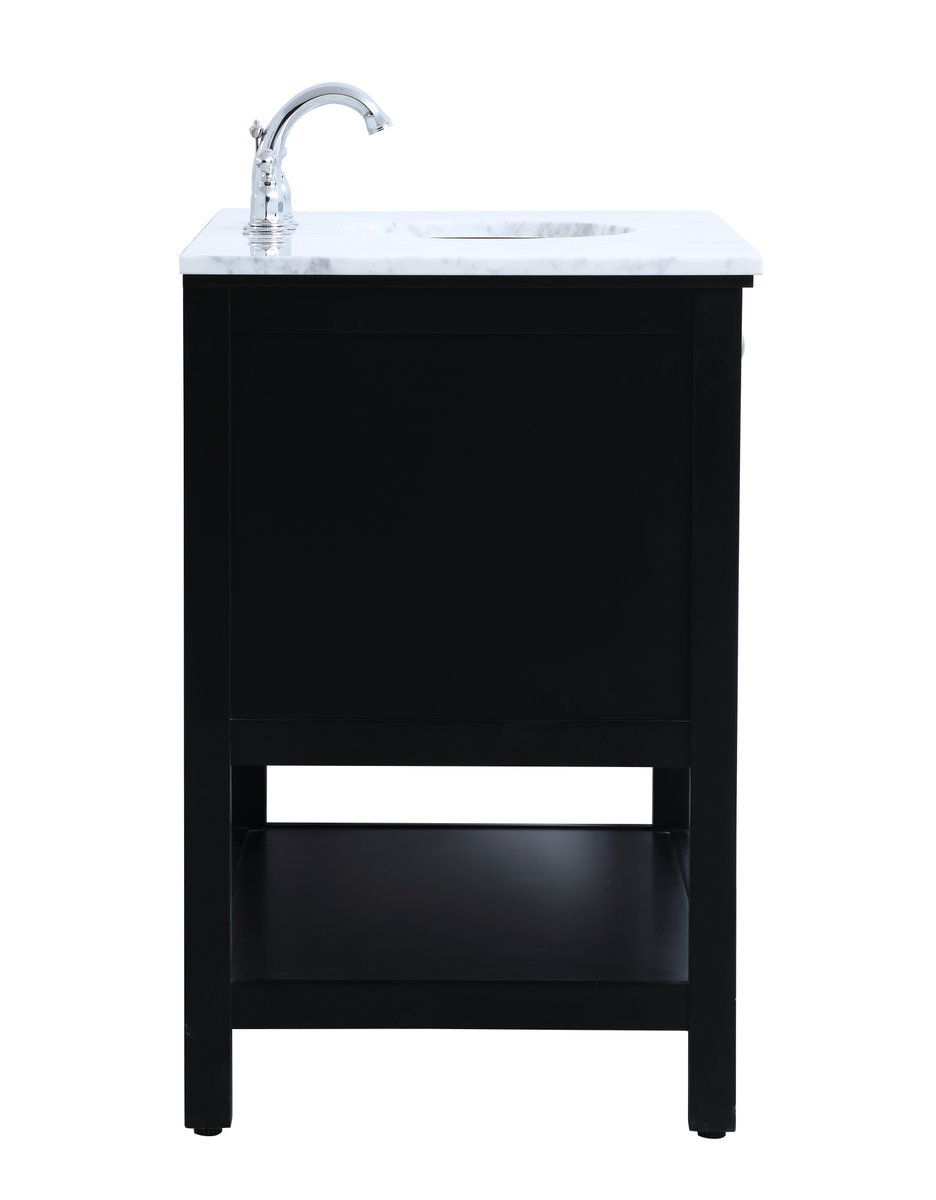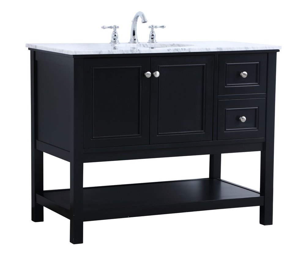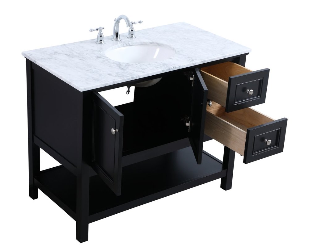 Create a refined and relaxing bath space with this contemporary design vanity, presenting its simplicity and clean straight lines in a minimalist appeal. The 42" black vanity, crafted of solid poplar wood, provides ample storage within its 2 soft-close drawers and double doors, all equipped with soft-closing mechanism and accentuated with gleaming chrome hardware. Rounding out the design is a luxurious Itallian Carrara white marble counter top and a white porcelain under-mount oval sink