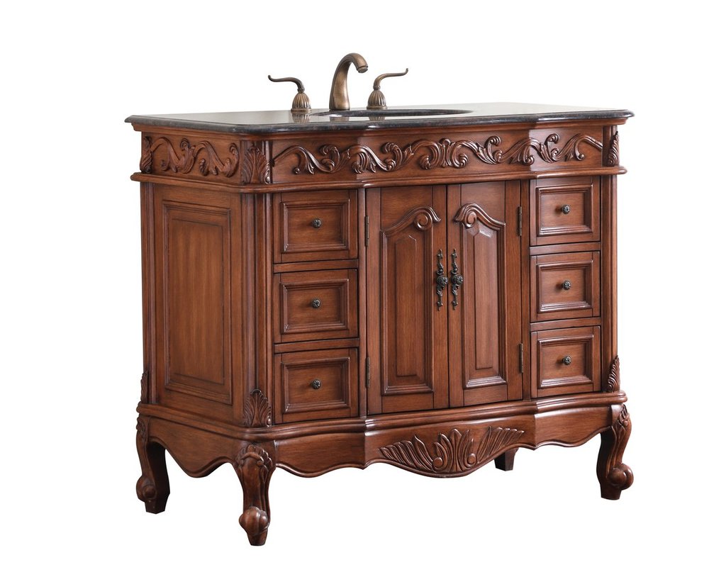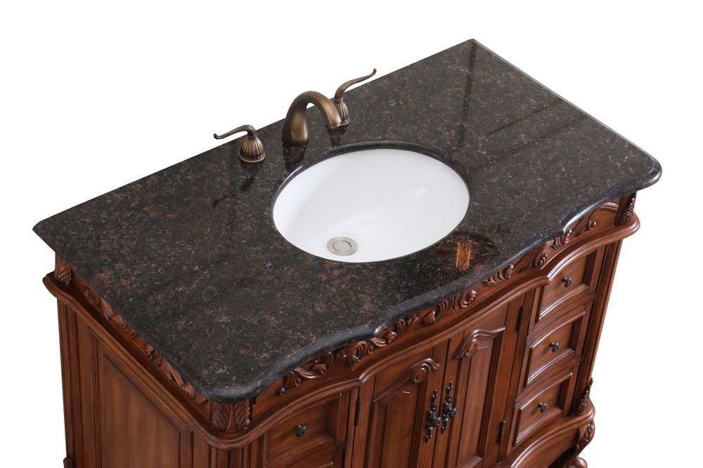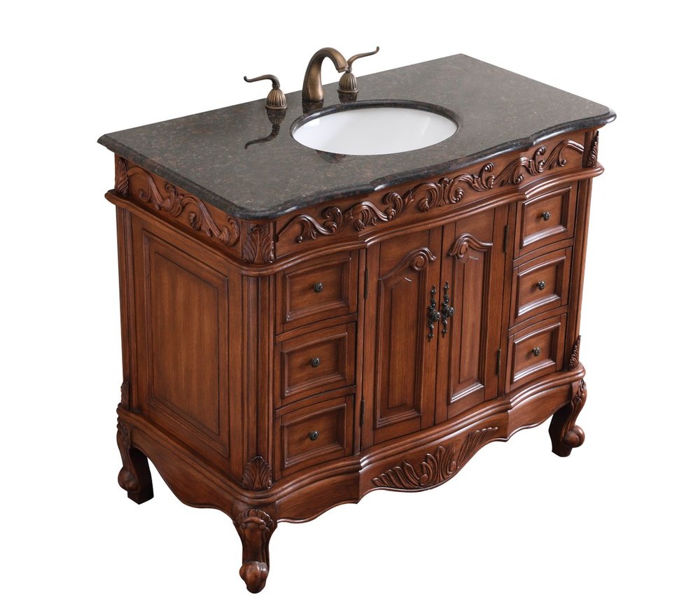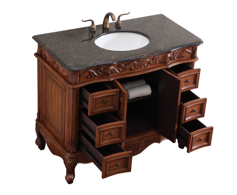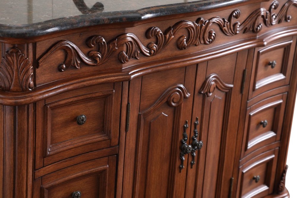 This superb balance of timeless tradition and opulent beauty in a granite-topped vanity will certainly enhance the aesthetics of any home or office bathroom! Featuring an exotic English cream granite countertop, complimenting the hand painted teak cabinet. With 2 doors and 6 drawers, as well as antique bronze finish door knobs, this superbly carved floral design, stands on stylishly carved solid wood French scroll feet made this a truly rich statement of luxury! Measurements: W42” x D22” x H35”, fully assembled.