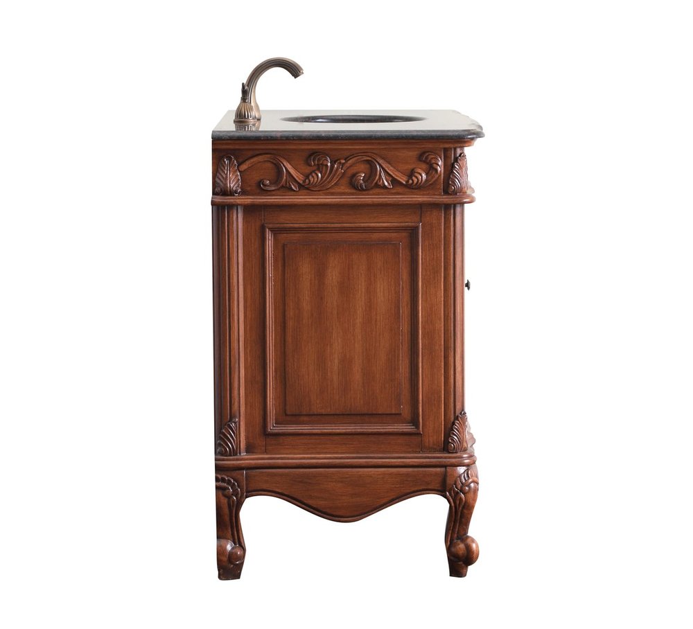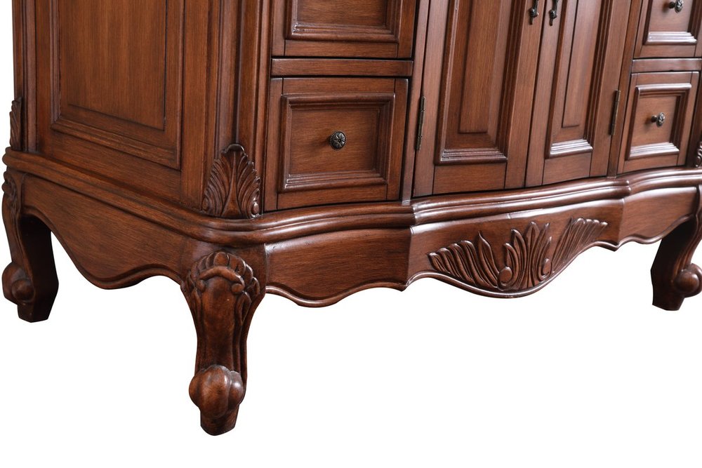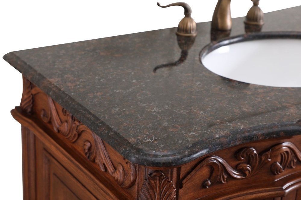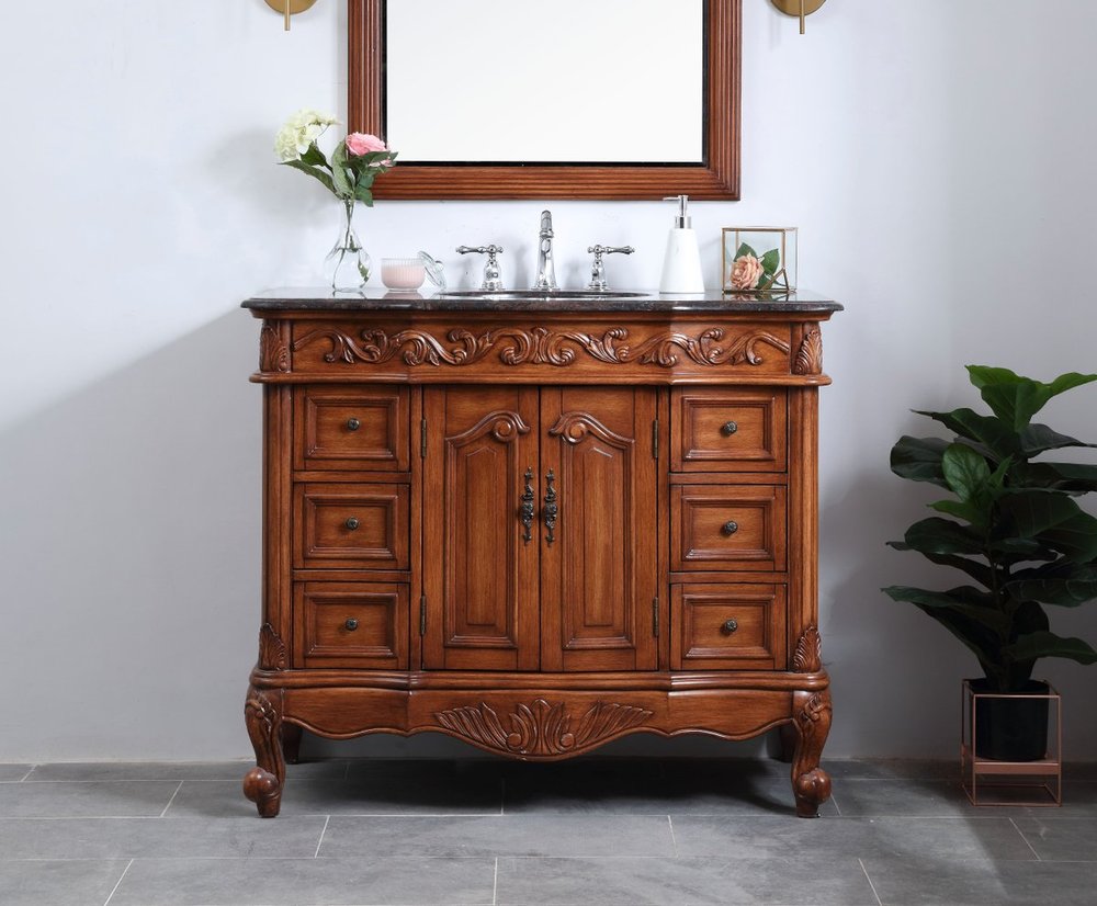 This superb balance of timeless tradition and opulent beauty in a granite-topped vanity will certainly enhance the aesthetics of any home or office bathroom! Featuring an exotic English cream granite countertop, complimenting the hand painted teak cabinet. With 2 doors and 6 drawers, as well as antique bronze finish door knobs, this superbly carved floral design, stands on stylishly carved solid wood French scroll feet made this a truly rich statement of luxury! Measurements: W42” x D22” x H35”, fully assembled.