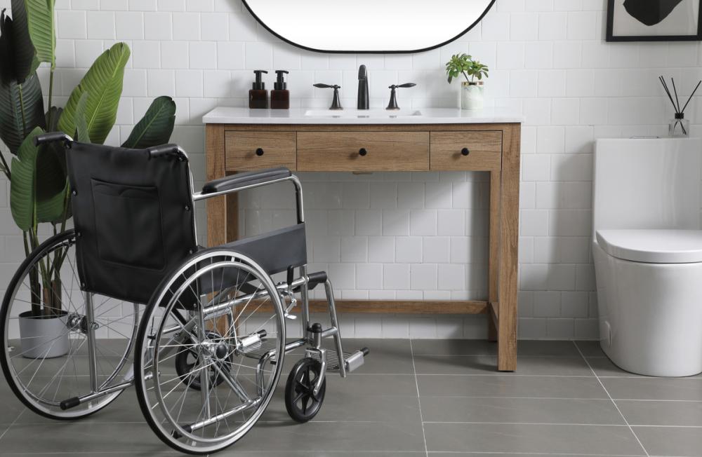 The sink vanity is thoughtfully crafted to accommodate wheelchair access, promoting inclusivity in your bathroom space.