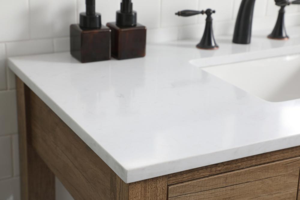 The vanity boasts a luxurious Calacatta look engineered marble stone top, combining timeless beauty with durability. This premium material adds a touch of opulence to your bathroom while combating to the rigors of daily use.