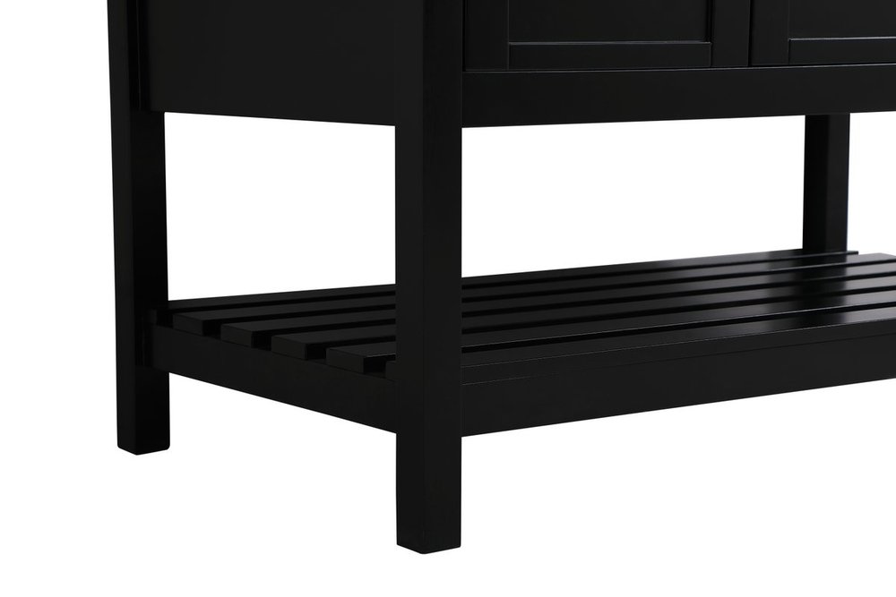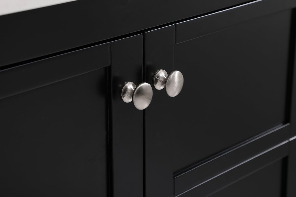 The subtle beauty of the Theo collection 42" vanity in a black finish exudes comfortable luxury. Its modern, yet traditional beauty will surely dress up your bathroom or powder room without any fuss. The white stone countertop and porcelain undermount sink shows quiet opulence, and the legs support upright without fail. Brushed Nickel hardware complements the trendy black finish, with pulls adorning the two cabinet doors and two drawers, showcasing ample storage space within. Slated shelf allows for additional space to organize your towels. Whether this vanity is in your bathroom or for guests, its presence will surely elevate the aesthetics of your room. Comes with a matching backsplash to complete the look and protects your wall.
