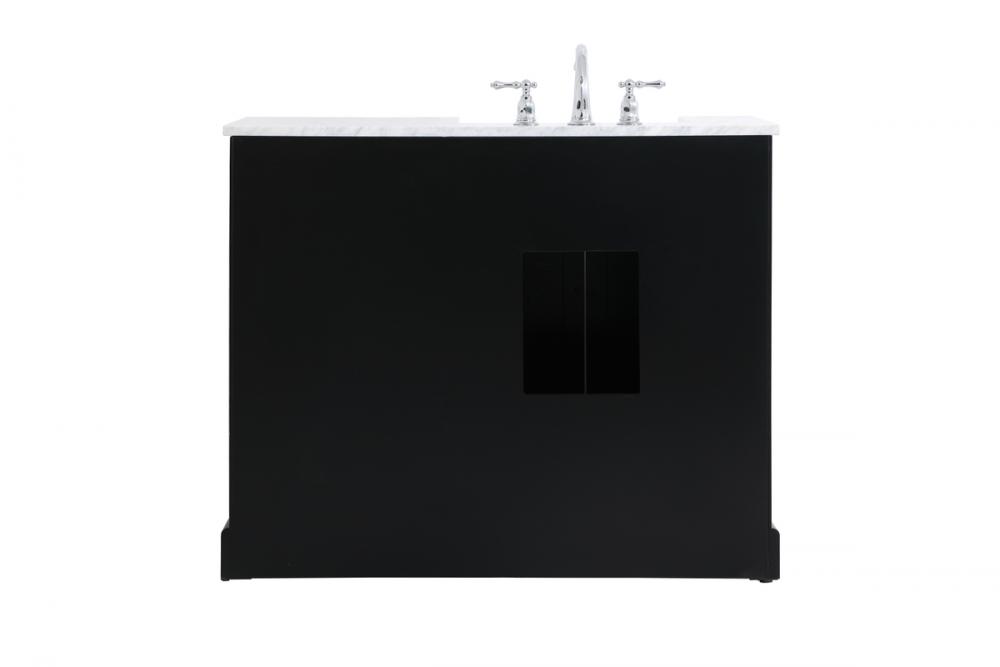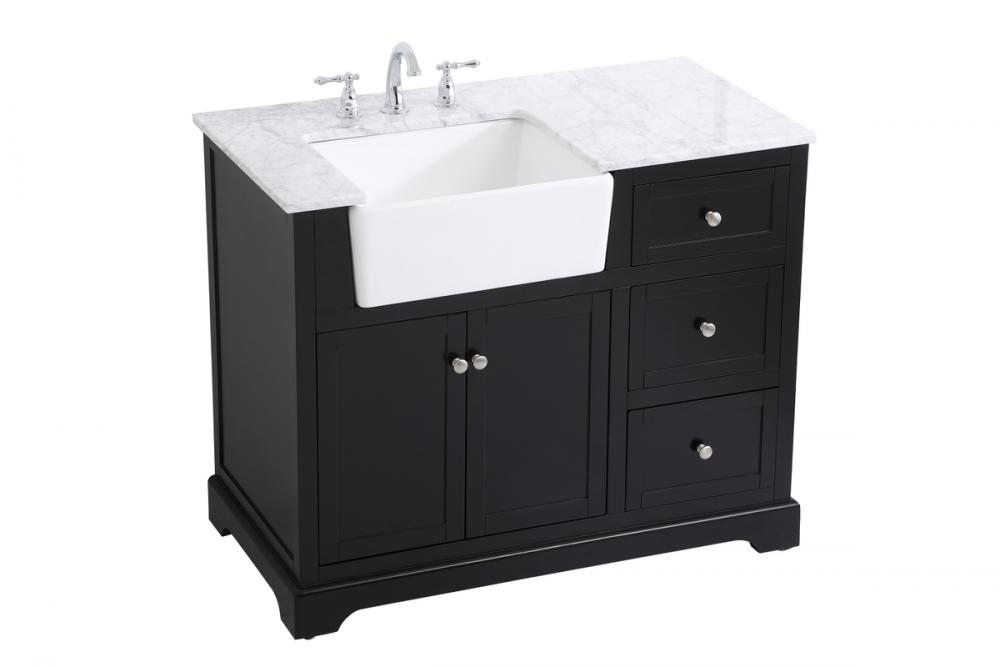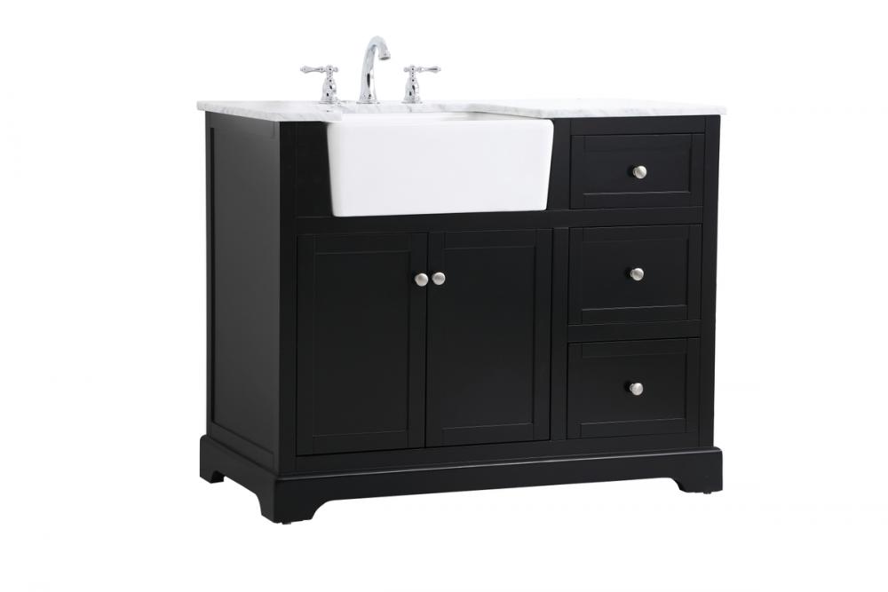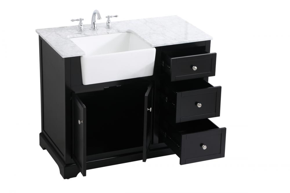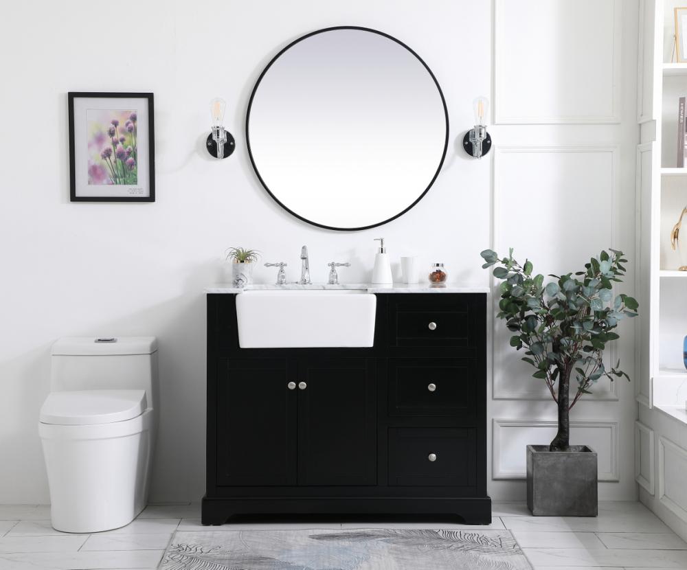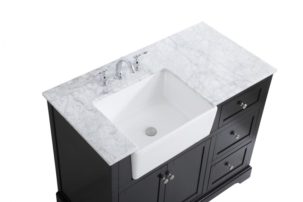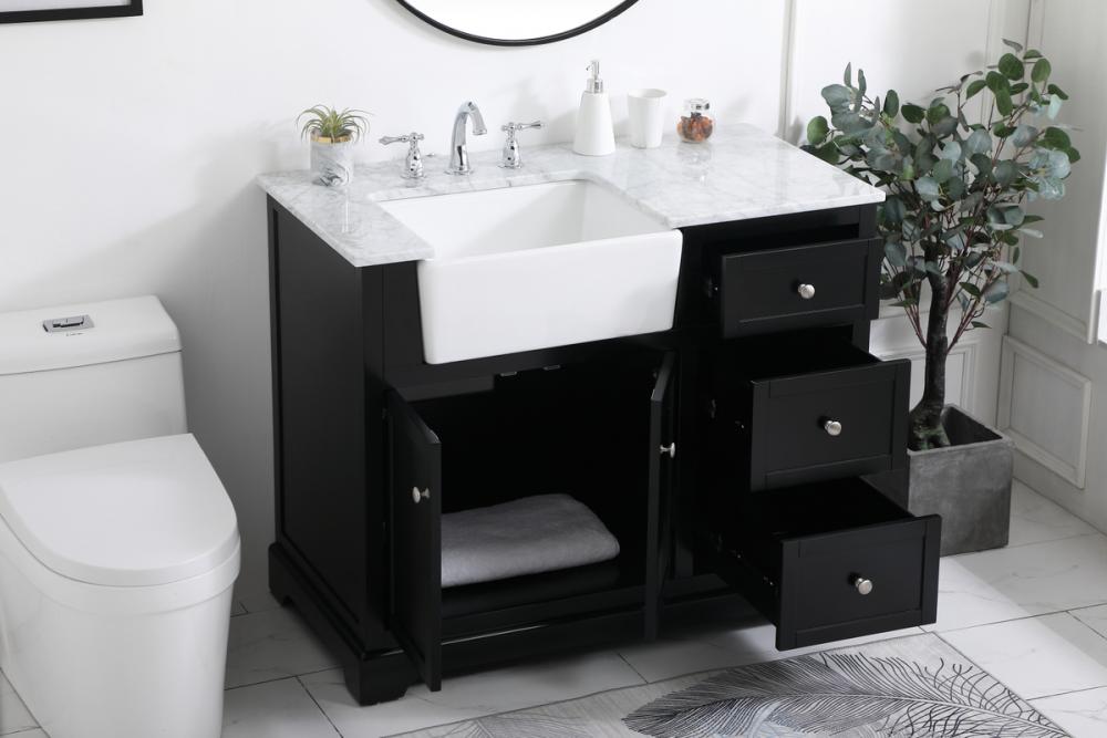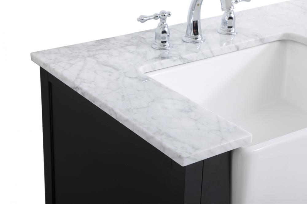 Make the most of your space with this farmhouse style bathroom vanity. Complements well with its beautiful finish, carrara white marble countertop, and the contemporary slender handle bar that sits on the functional drawers with soft closing mechanism, allowing you to store an assortment of bathroom essentials. This stylish vanity ensures both form and function in your bathroom for you and your guests.