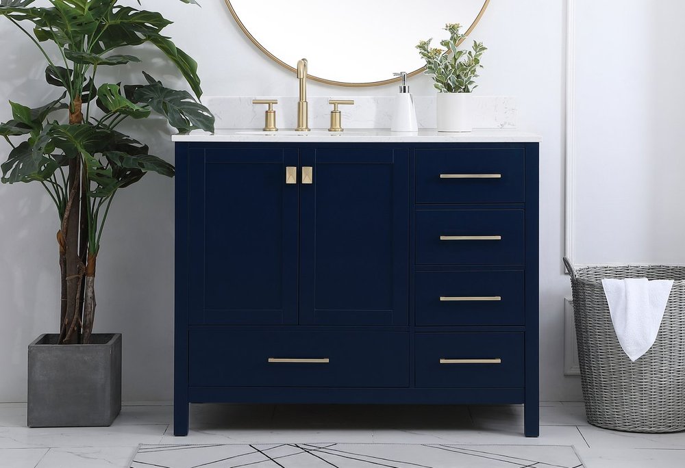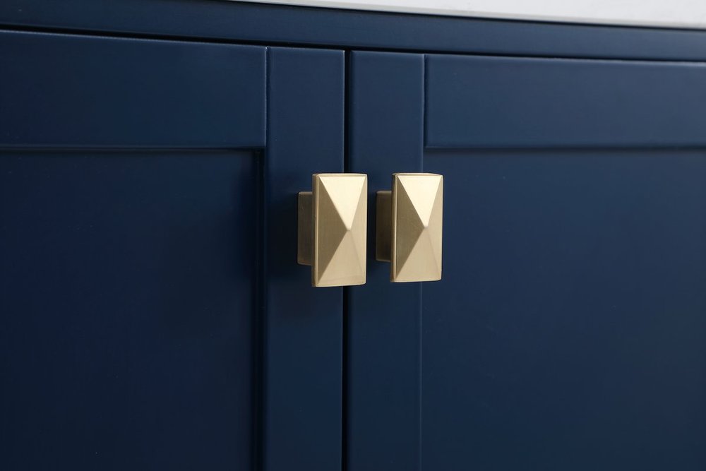 Never compromise beauty--the Irene collection stunning vanity in a blue finish will add lovely sophistication and complement any bathroom or powder room, while utilizing its charm and function to provide you with ample storage spaces. Satin gold pulls gently adorn the minimalist cabinet doors and drawers at the base, allowing for you to store away your bathroom essentials. The calacatta engineered marble countertop, porcelain undermount sink, dignified subtle engravings on the side edges, and squared legs all come together to create contemporary beauty. Work with your space, and design a beautiful room, no matter the size. Comes with a matching backsplash to complete the look and protects your wall.