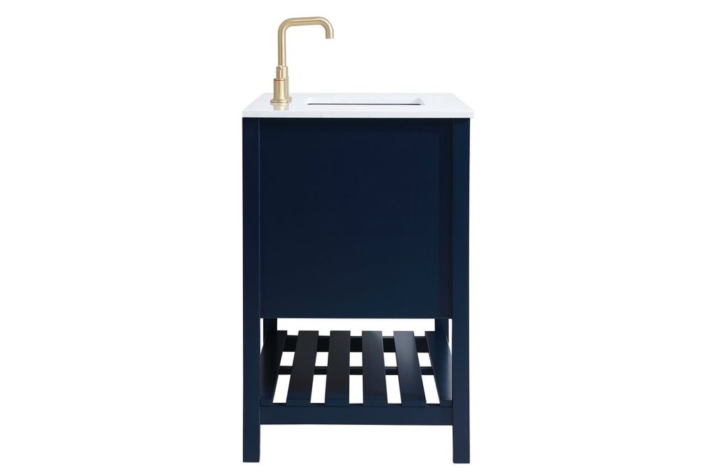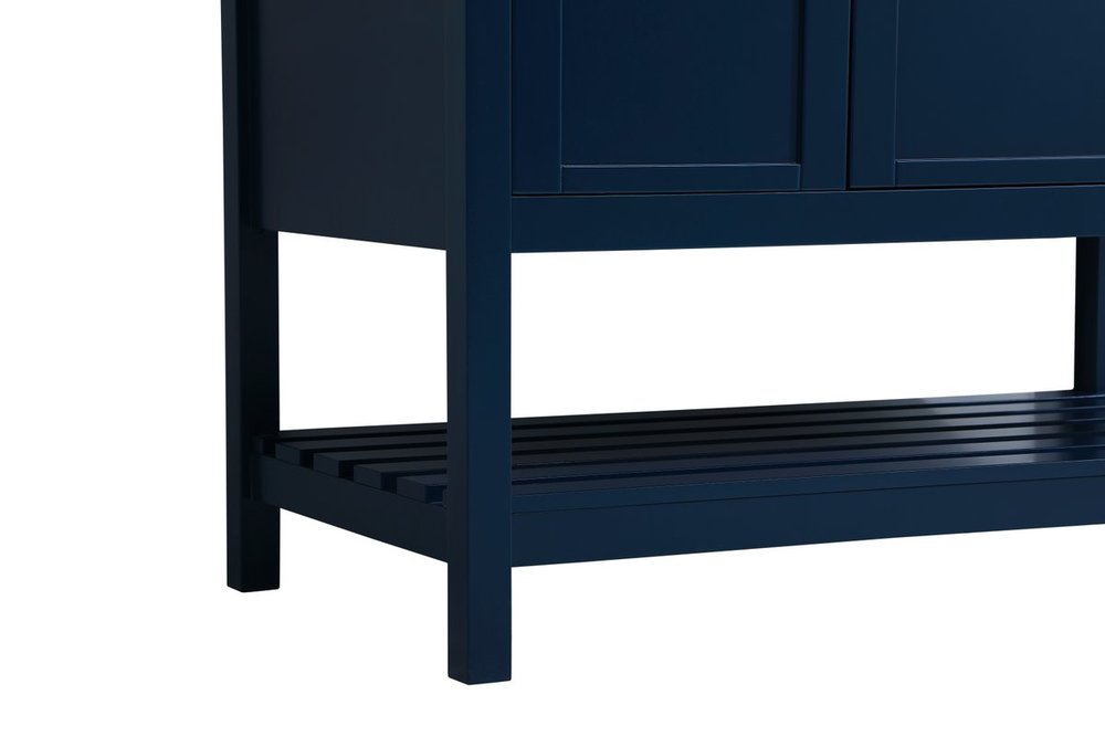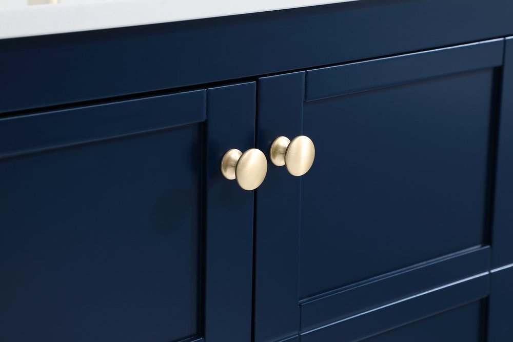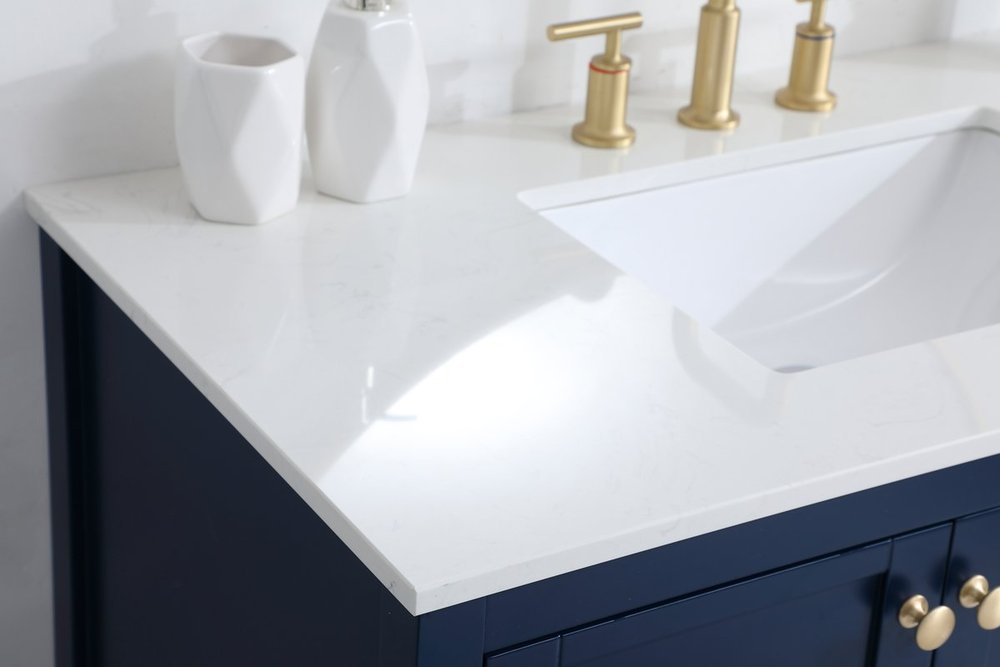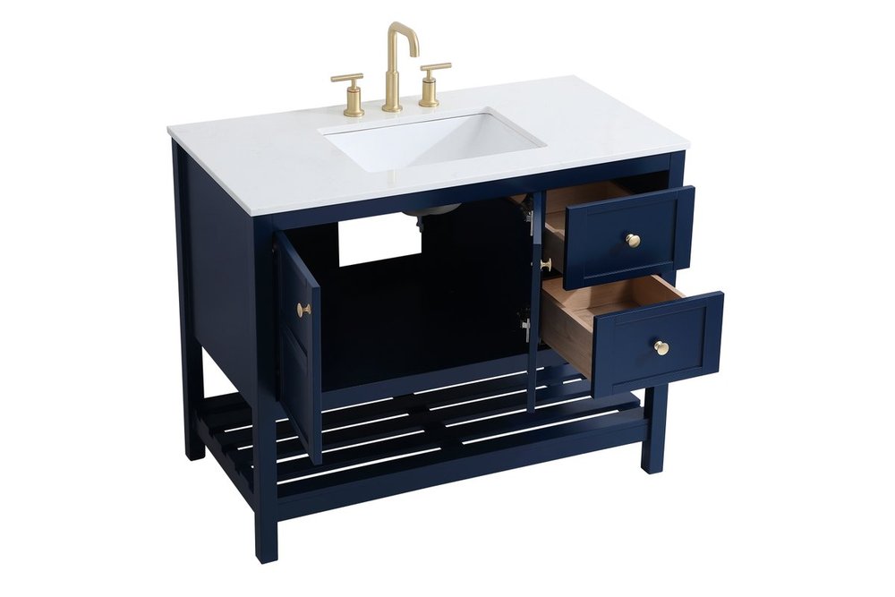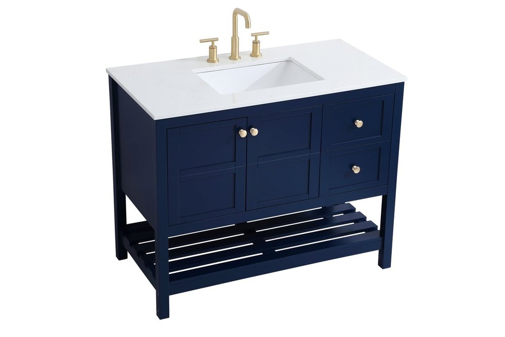 The subtle beauty of the Theo collection 42" vanity in a blue finish exudes comfortable luxury. Its modern, yet traditional beauty will surely dress up your bathroom or powder room without any fuss. The white stone countertop and porcelain undermount sink shows quiet opulence, and the legs support upright without fail. Gold hardware complements the trendy blue finish, with pulls adorning the two cabinet doors and two drawers, showcasing ample storage space within. Slated shelf allows for additional space to organize your towels. Whether this vanity is in your bathroom or for guests, its presence will surely elevate the aesthetics of your room.
