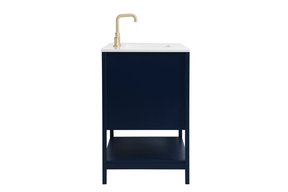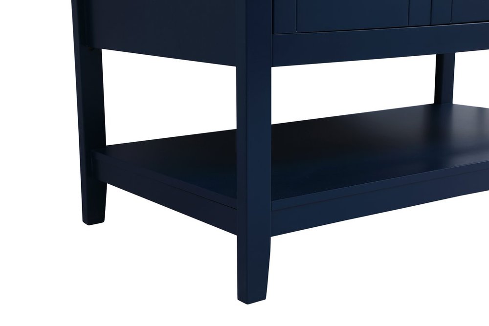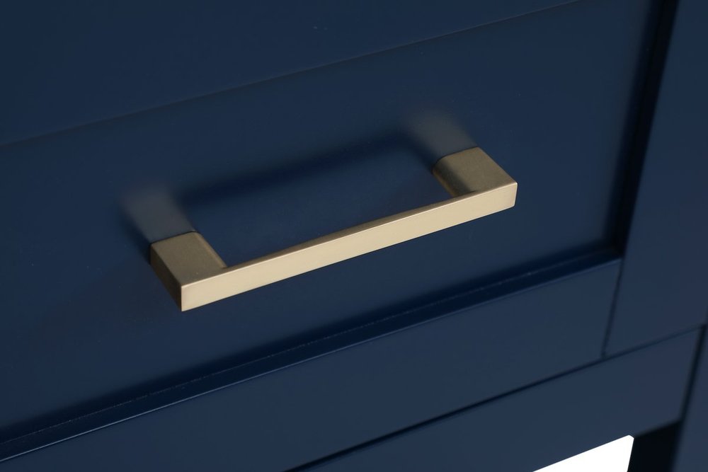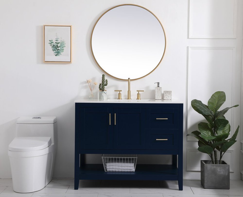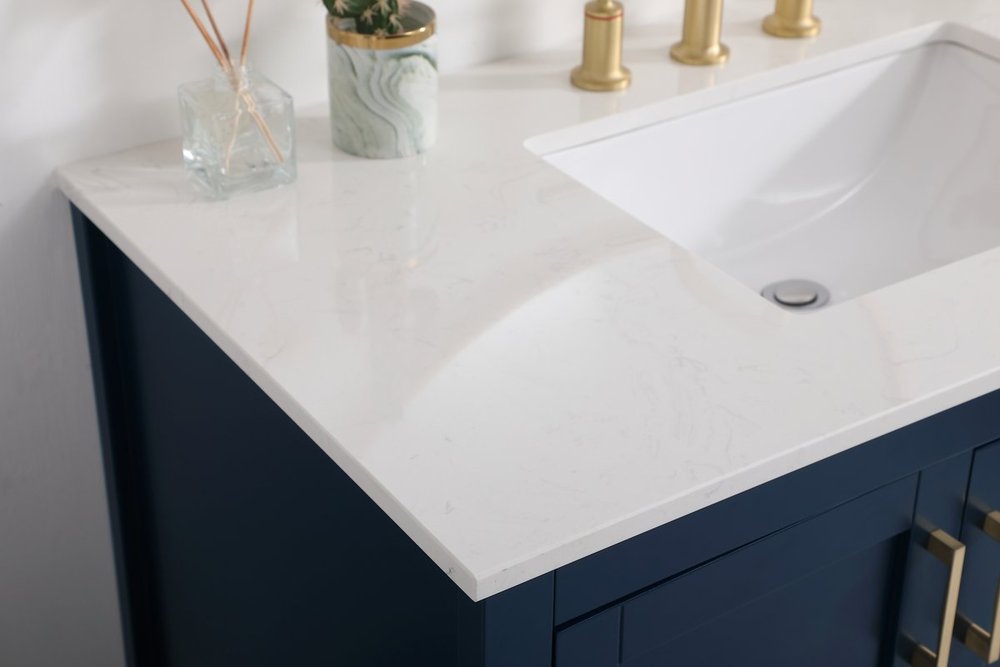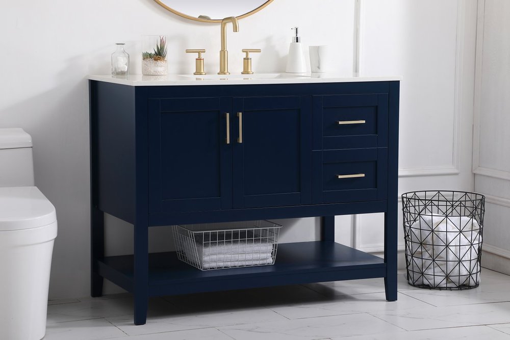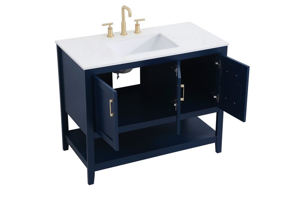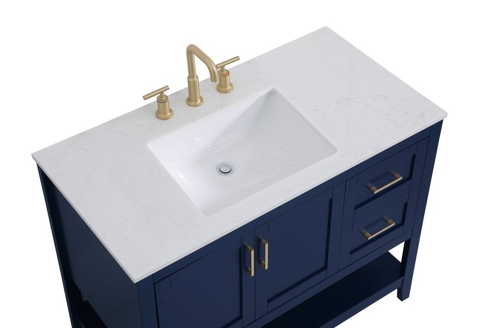The nonchalant attitude of this 42" traditional Blue finish vanity will have you wanting more. The slender gold handle bars open the 3 cabinet doors to reveal ample storage space to put away and store bathroom essentials, and the open space below allows for you to place clean towels on the rack. Topped with a Calacatta engineered marble countertop, you and your guests will enjoy this easy going vanity.