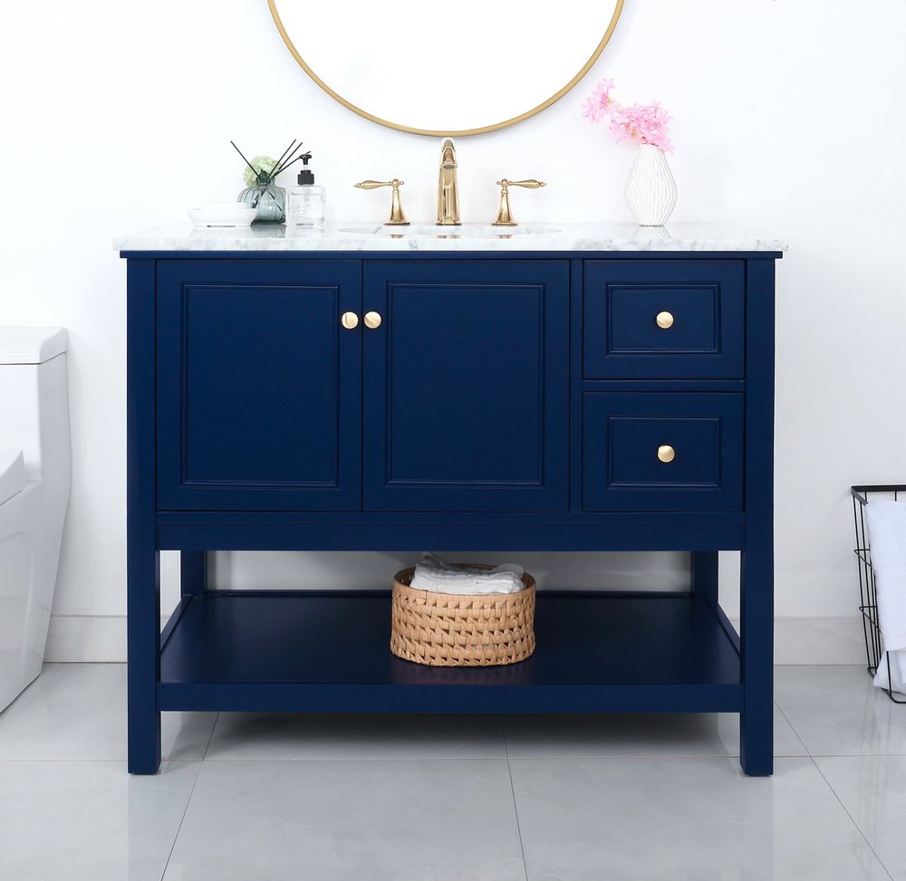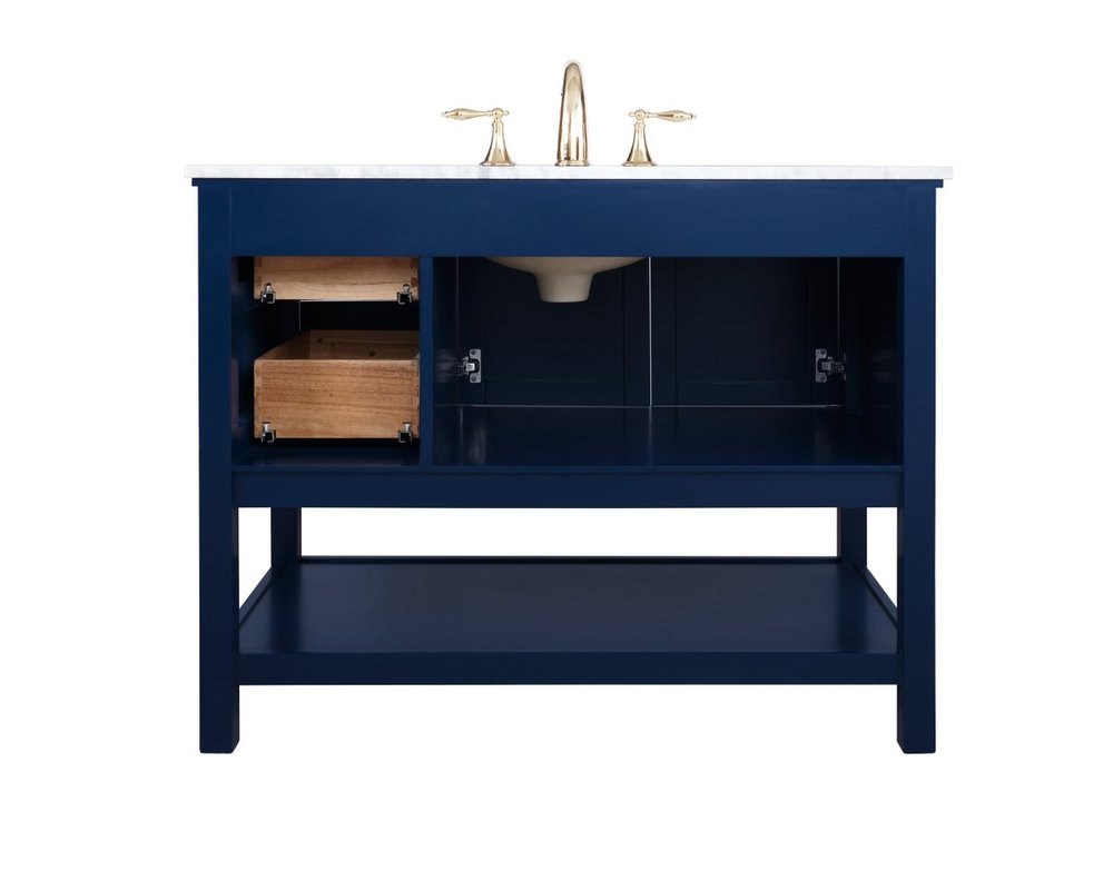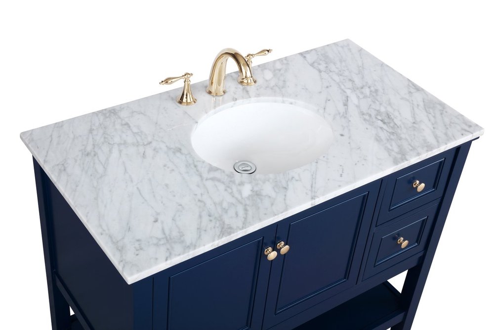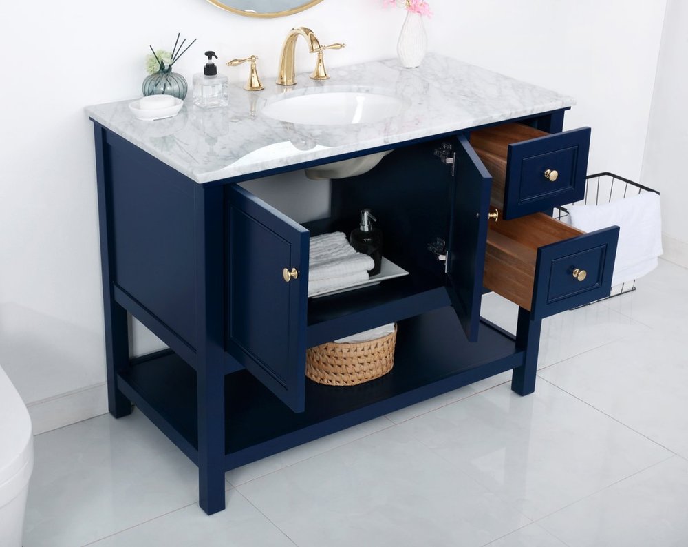 Create a refined and relaxing bath space with this contemporary design vanity, presenting its simplicity and clean straight lines in a minimalist appeal. The 42" vanity provides ample storage within its 2 soft-close drawers, double door and a open shelf base, accentuated with gleaming gold hardware. Rounding out the design is a luxurious Itallian Carrara white marble counter top and a white porcelain under-mount oval sink.