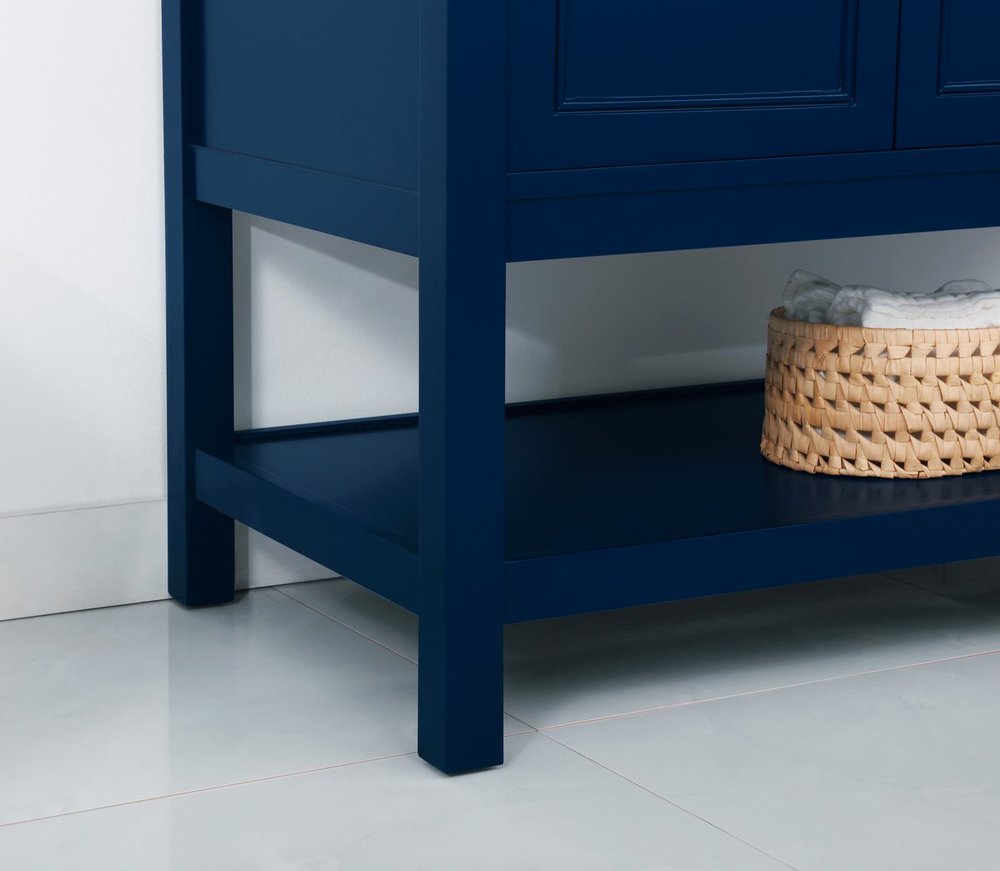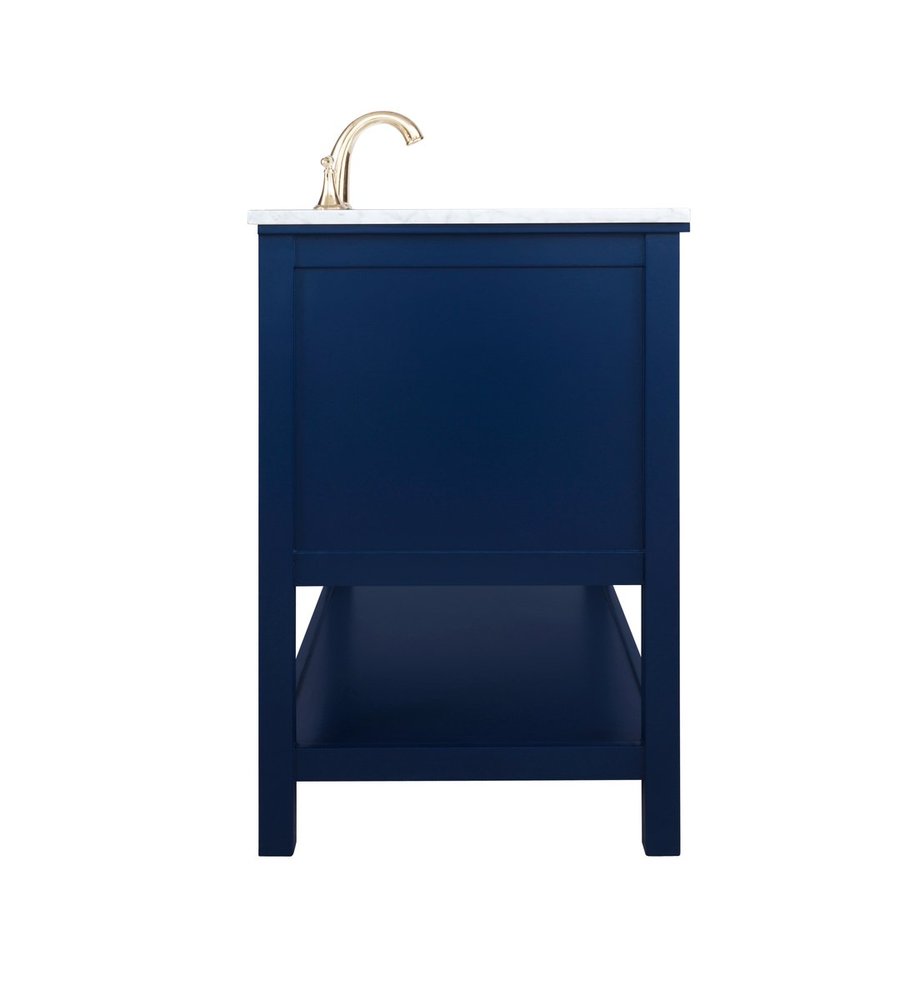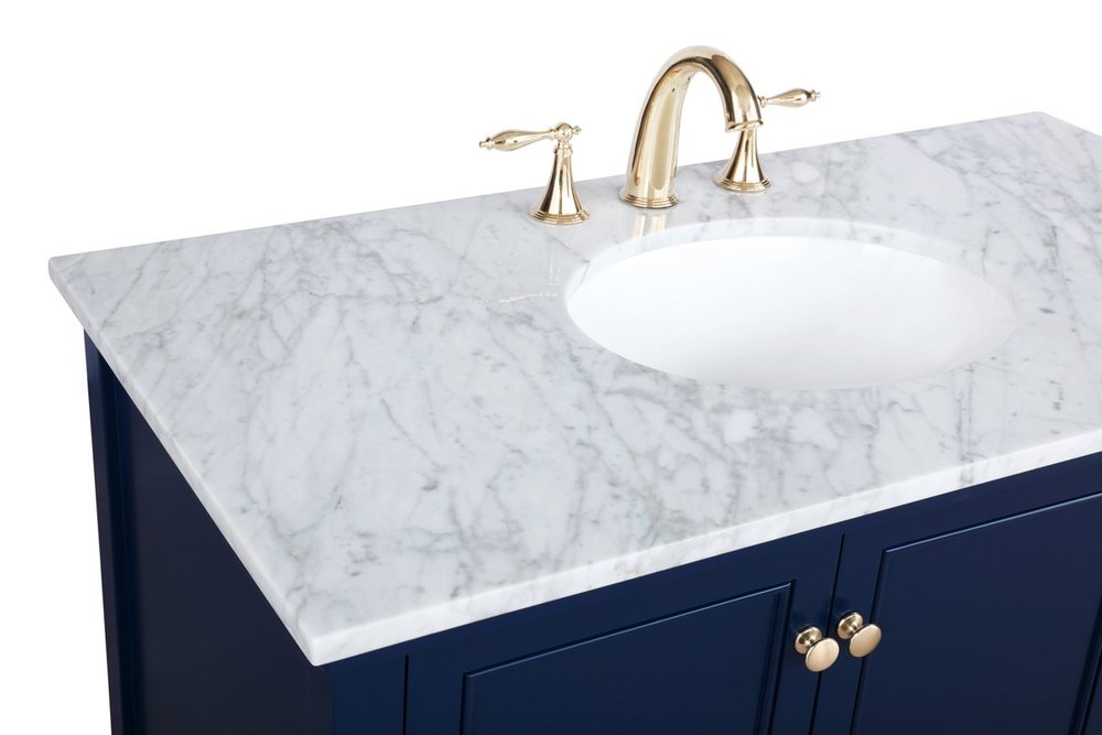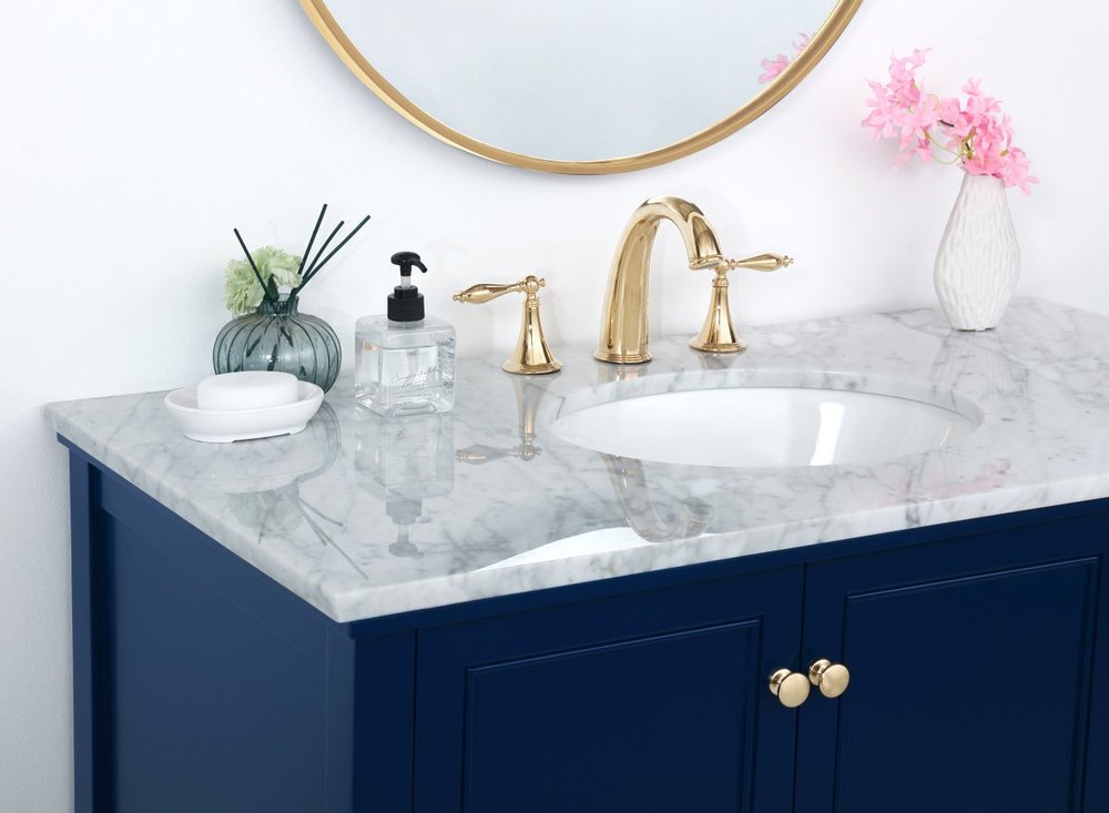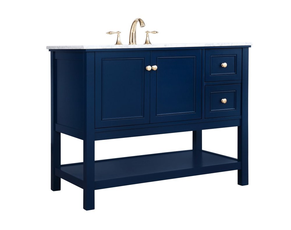 Create a refined and relaxing bath space with this contemporary design vanity, presenting its simplicity and clean straight lines in a minimalist appeal. The 42" vanity provides ample storage within its 2 soft-close drawers, double door and a open shelf base, accentuated with gleaming gold hardware. Rounding out the design is a luxurious Itallian Carrara white marble counter top and a white porcelain under-mount oval sink.