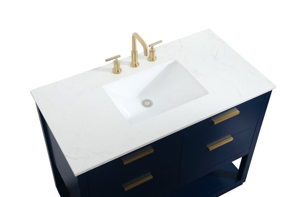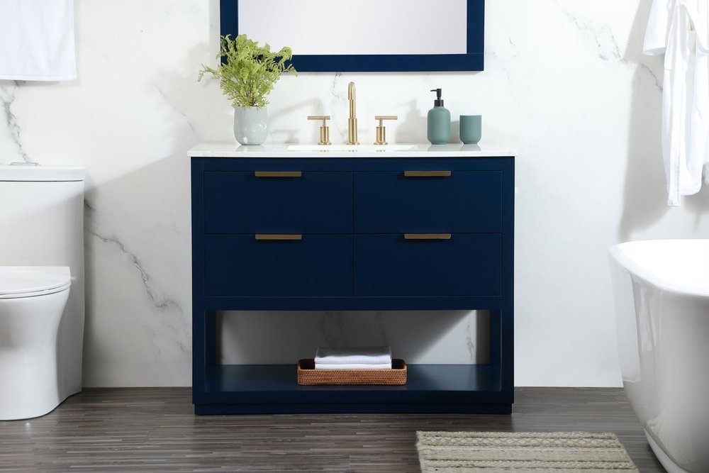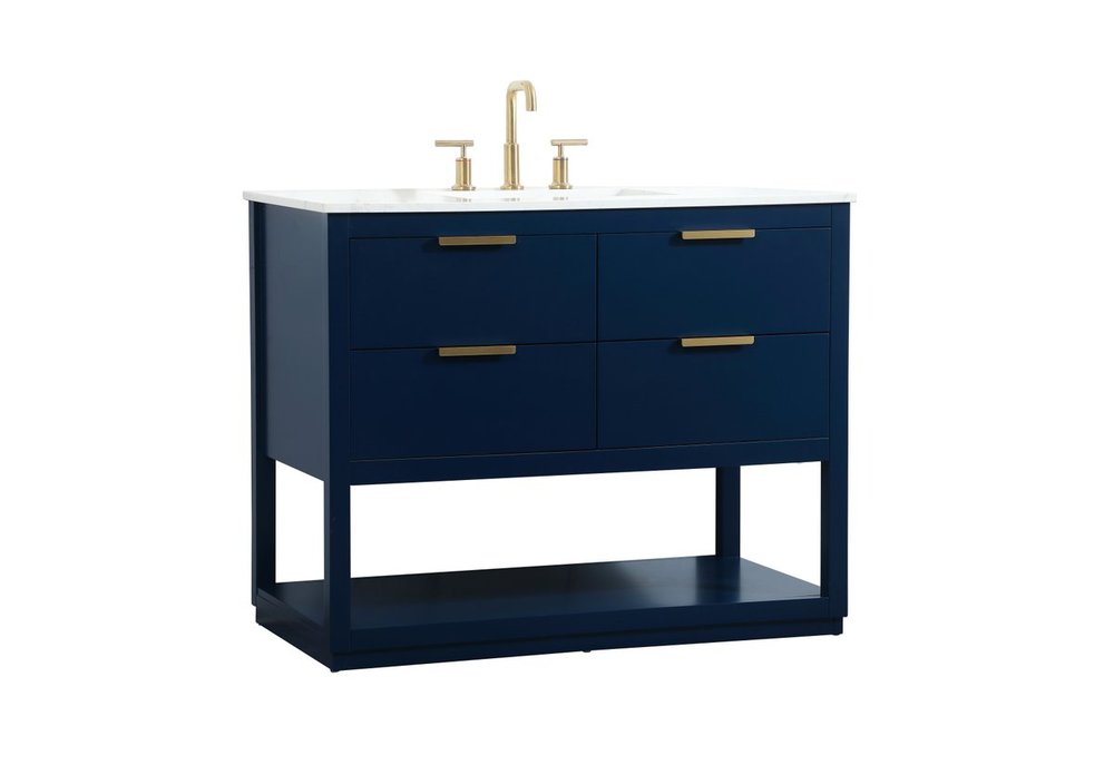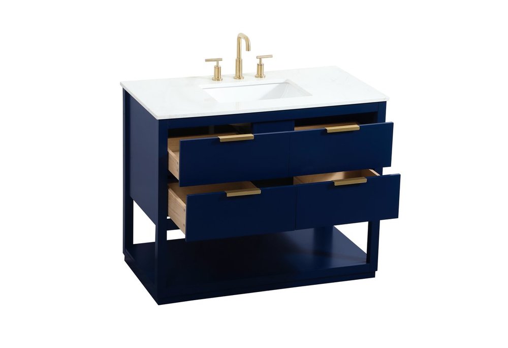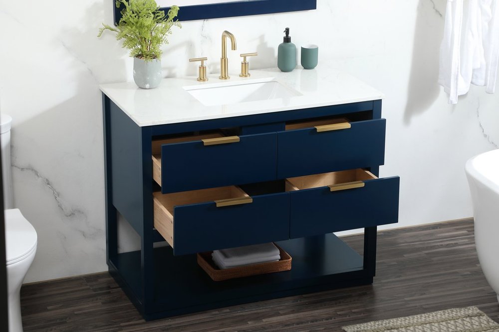 Live in modern comfort with this 42" blue finish vanity. Dressed in a blue and sleek gold metal hardware, its contemporary style will have your bathroom or powder room elevated in modern sophistication. The open shelf at the base and four drawers reveal ample storage space for your bathroom essentials and miscellany. Clean lines create its own visual interest, adding trendy looks to your already chic room.