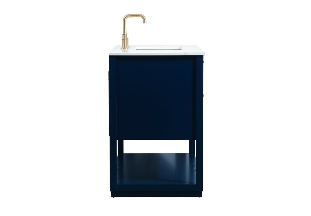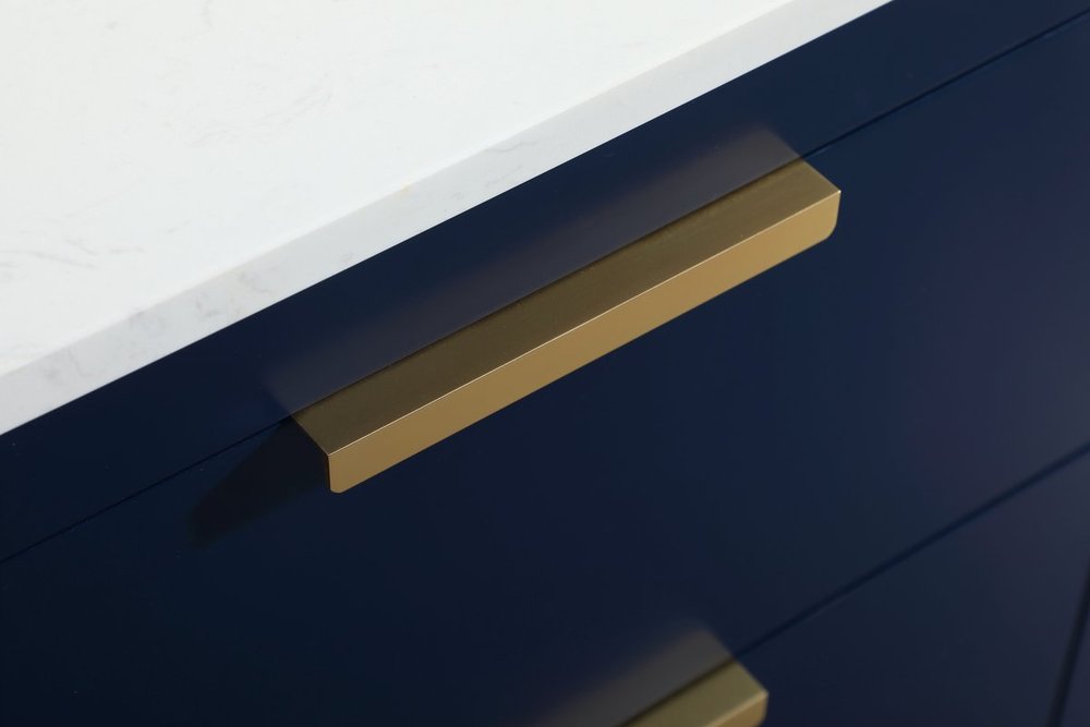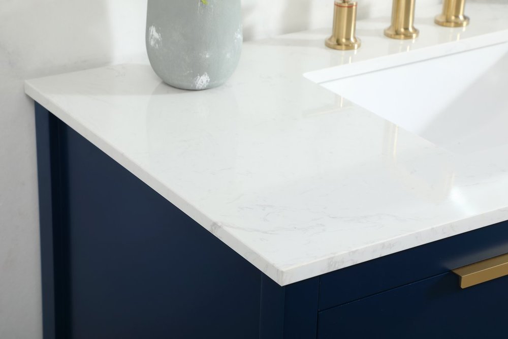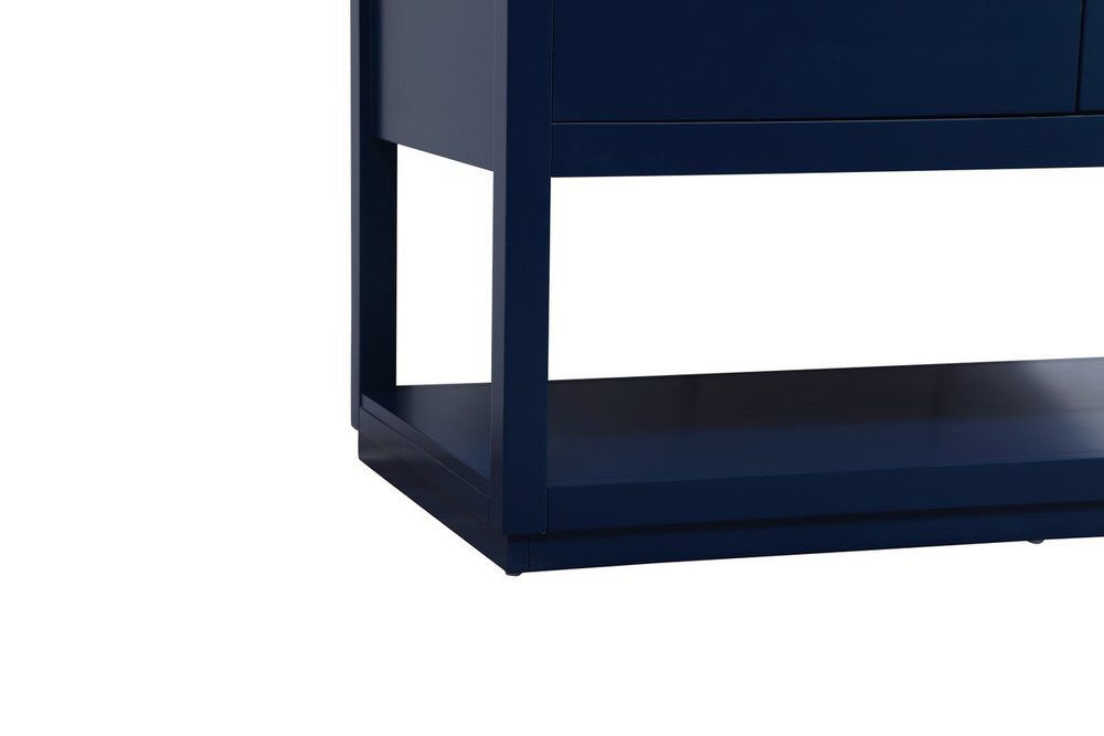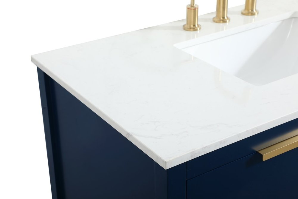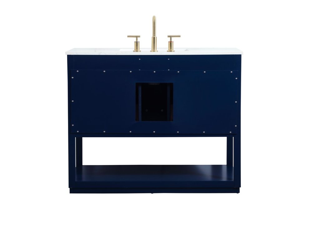 Live in modern comfort with this 42" blue finish vanity. Dressed in a blue and sleek gold metal hardware, its contemporary style will have your bathroom or powder room elevated in modern sophistication. The open shelf at the base and four drawers reveal ample storage space for your bathroom essentials and miscellany. Clean lines create its own visual interest, adding trendy looks to your already chic room.