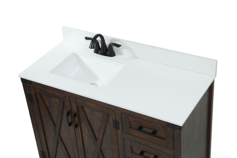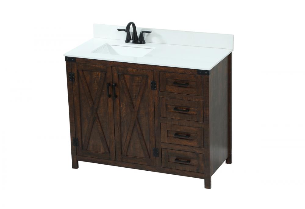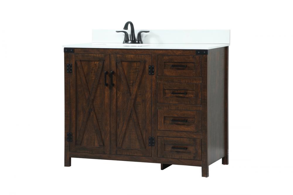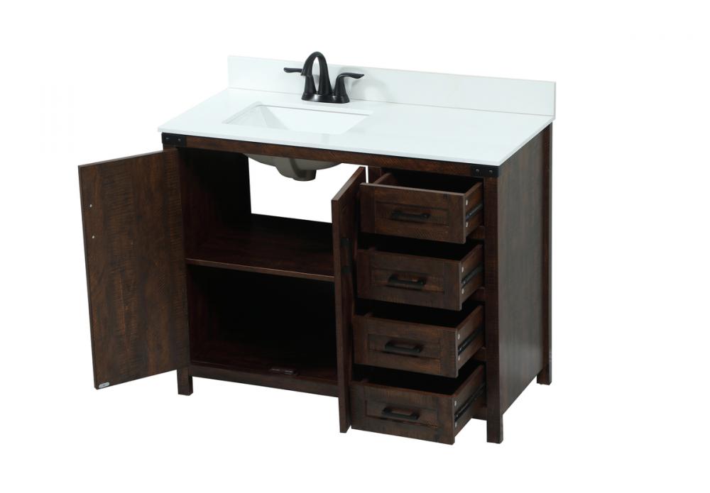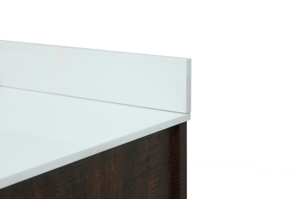 Reminiscent of barn doors, the two door cabinet and four drawers adds both stylistic charm and function with its plethora of storage options for all your bathroom essentials. Whether for your bathroom or the guests', everyone will marvel at its classic look for traditional and farmhouse aesthetics. A slab of engineered marble rounds out the piece up top, as well as the porcelain under mount sink and predrilled faucet holes. This vanity arrives fully assembled. Comes with a matching backsplash to complete the look and protects your wall.