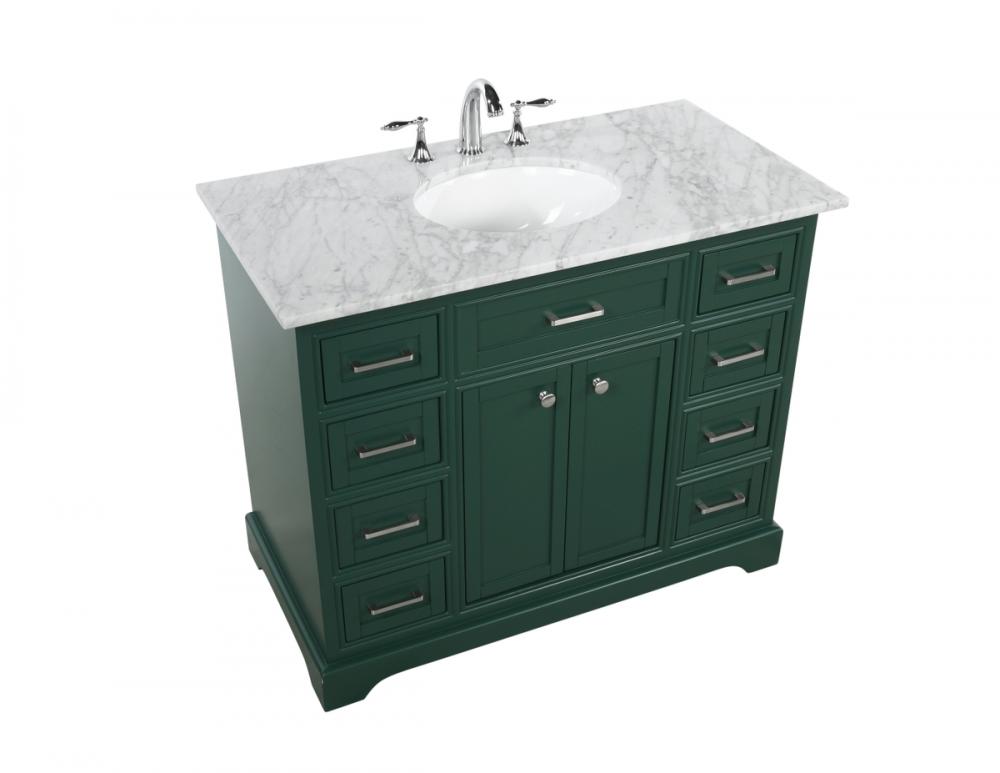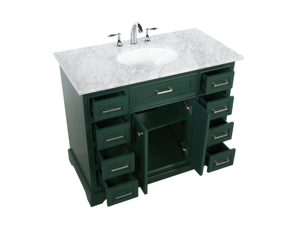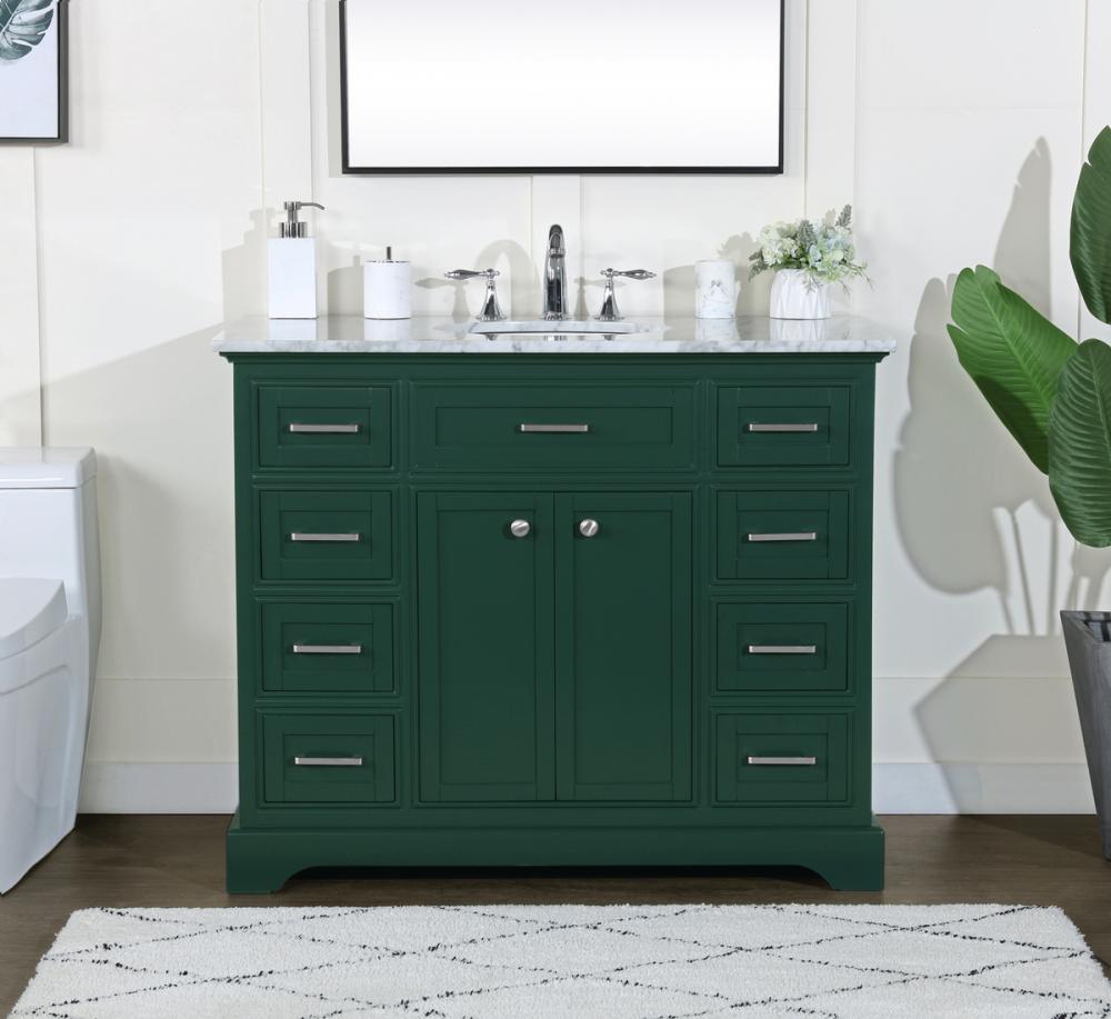 Comes with an undermount porcelain sink and a carrara white marble countertop