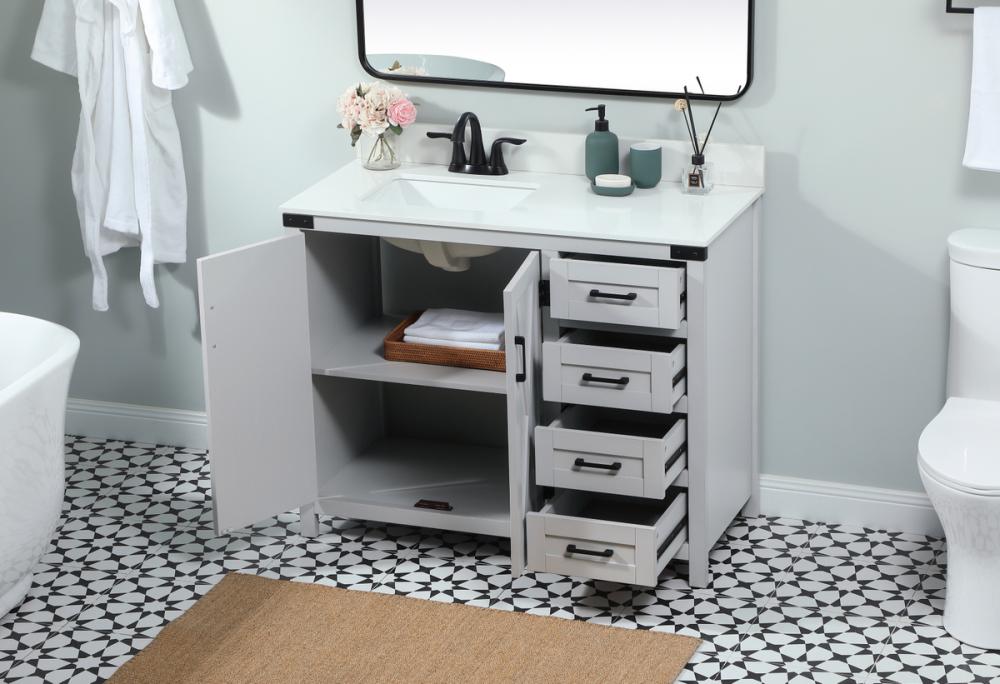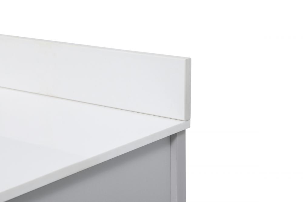 Reminiscent of barn doors, the two door cabinet and four drawers adds both stylistic charm and function with its plethora of storage options for all your bathroom essentials. Whether for your bathroom or the guests', everyone will marvel at its classic look for traditional and farmhouse aesthetics. A slab of engineered marble rounds out the piece up top, as well as the porcelain under mount sink and predrilled faucet holes. This vanity arrives fully assembled. Comes with a matching backsplash to complete the look and protects your wall.