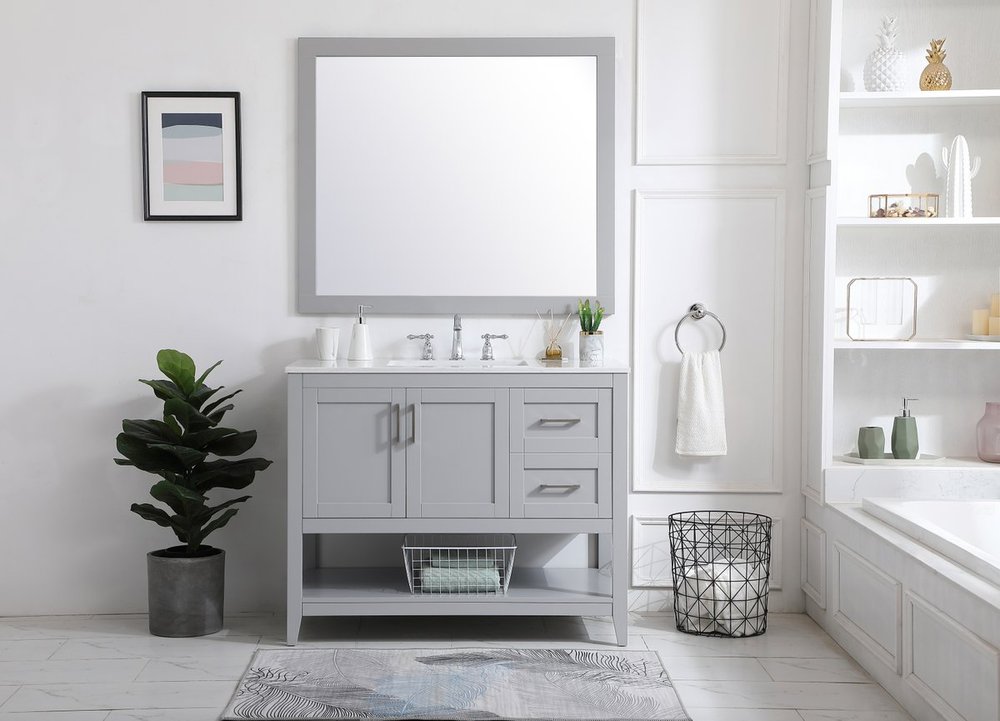 The nonchalant attitude of this 42" traditional grey finish vanity will have you wanting more. The slender brushed nickel handle bars open the 3 cabinet doors to reveal ample storage space to put away and store bathroom essentials, and the open space below allows for you to place clean towels on the rack. Topped with a Calacatta engineered marble countertop, you and your guests will enjoy this easy going vanity.