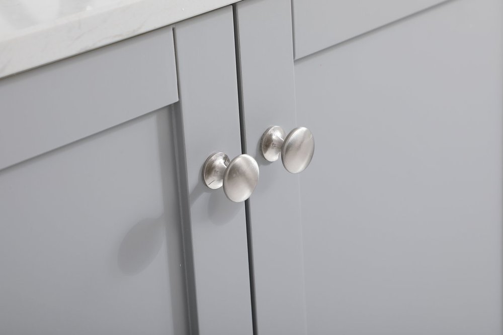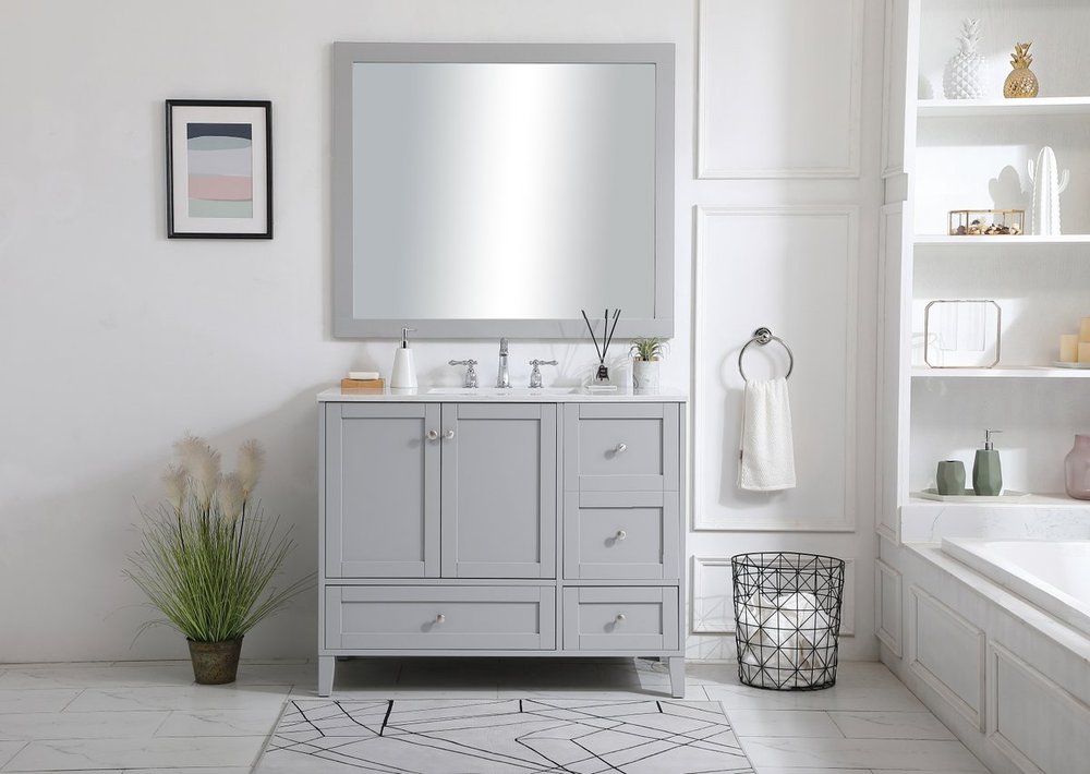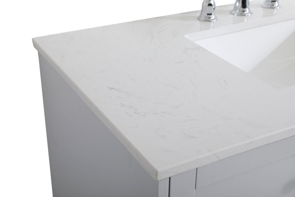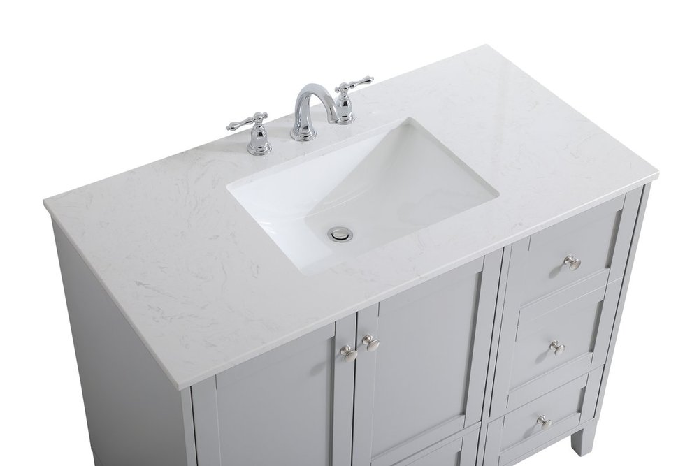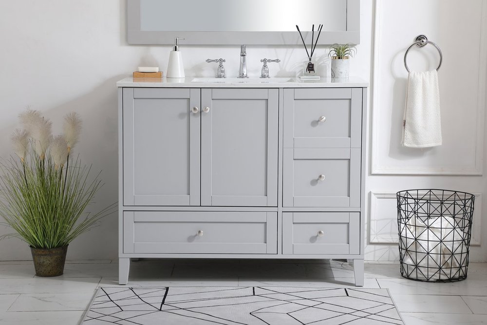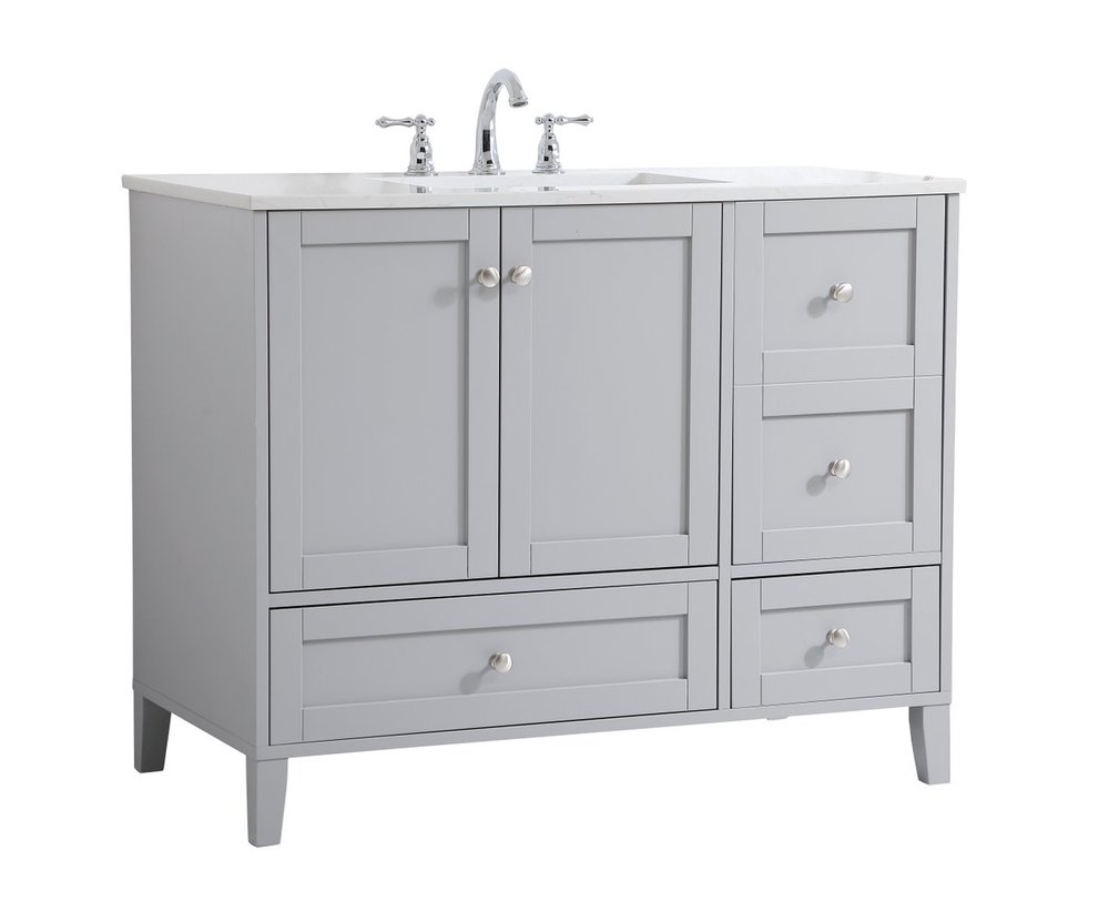 While unassuming, this 42" vanity in a grey finish sure knows how to redefine luxury. The sleek brushed nickel knobs adorn the double cabinet doors and 3 drawers which allow you to store your bathroom toiletries and necessities. Standing strong on oblique legs and dressed with a Calacatta engineered marble countertop, this vanity will surely create beauty and casual elegance in your bathroom or powder room.