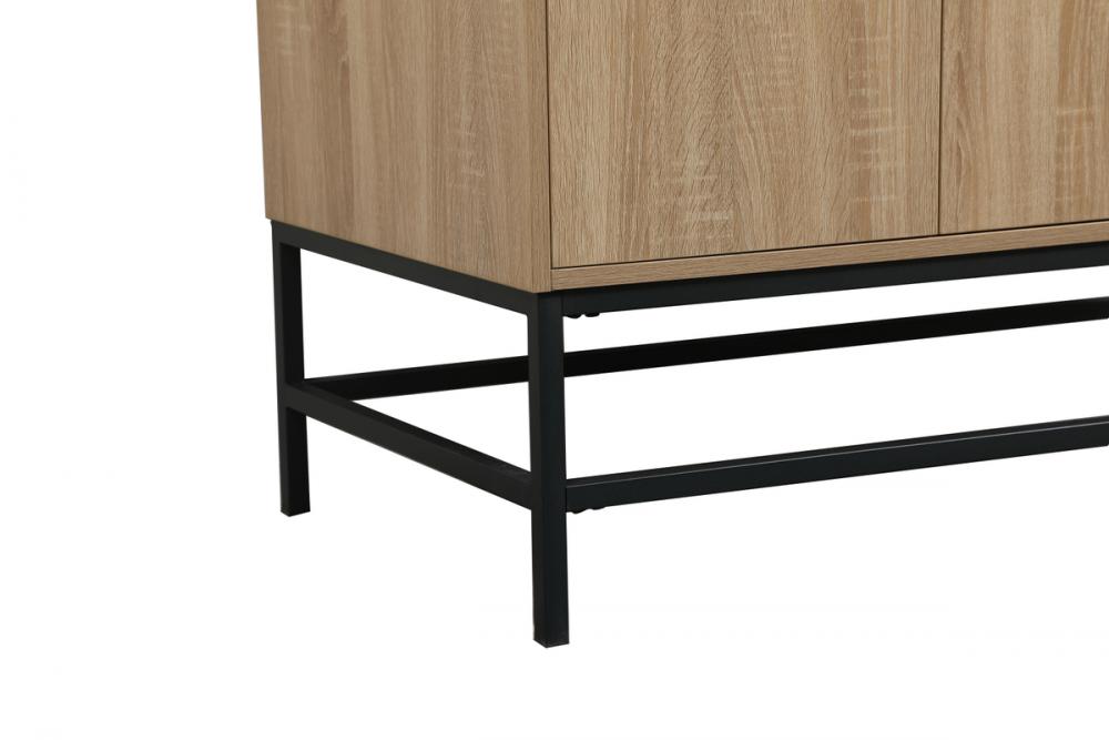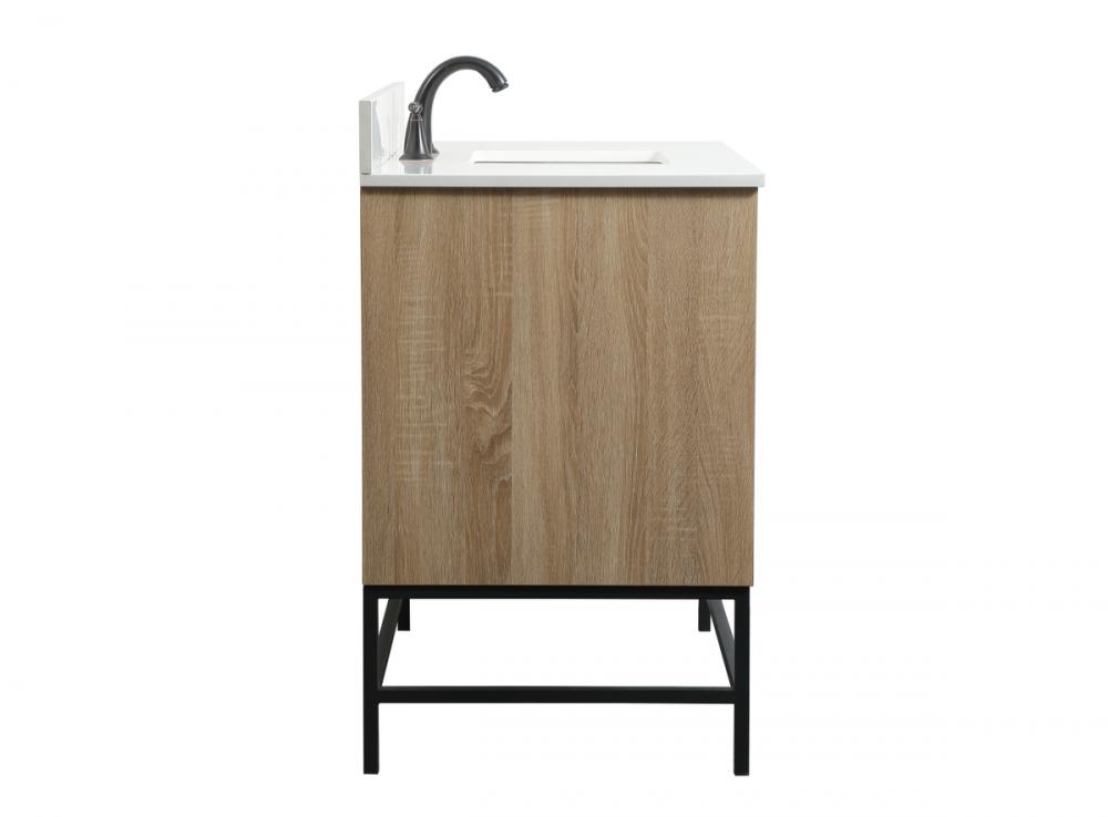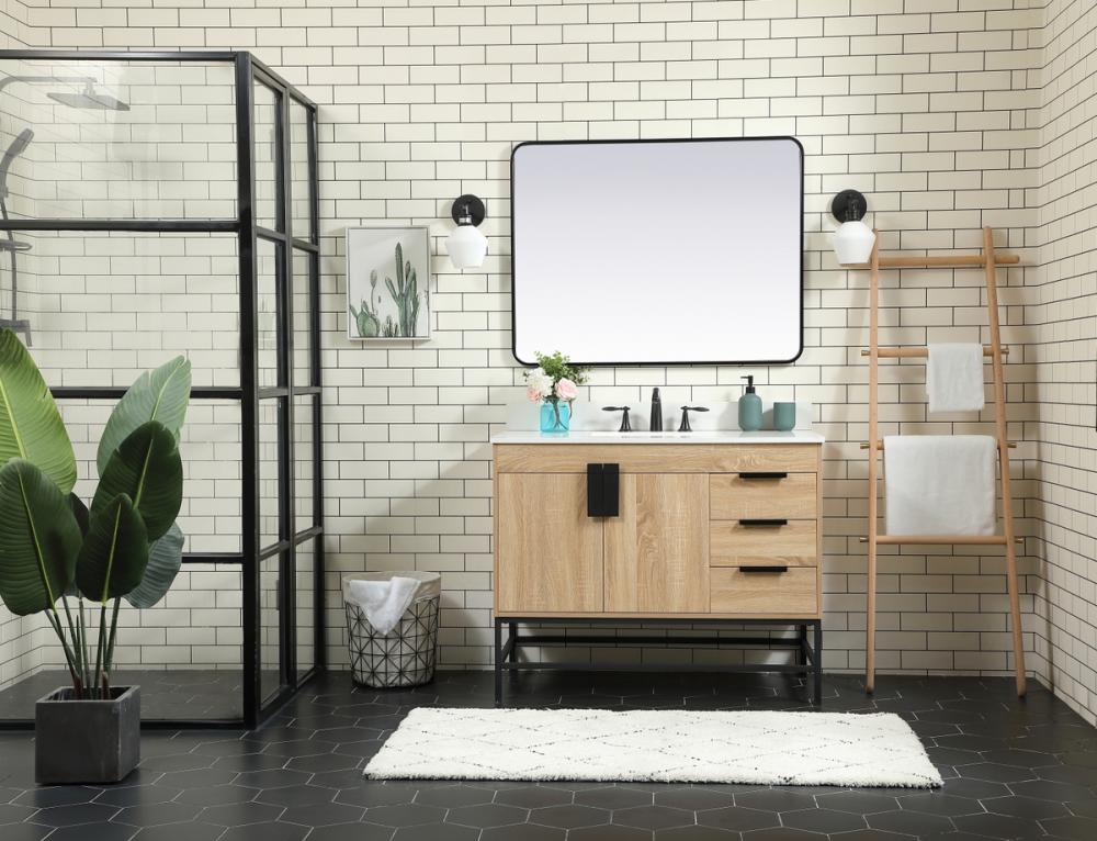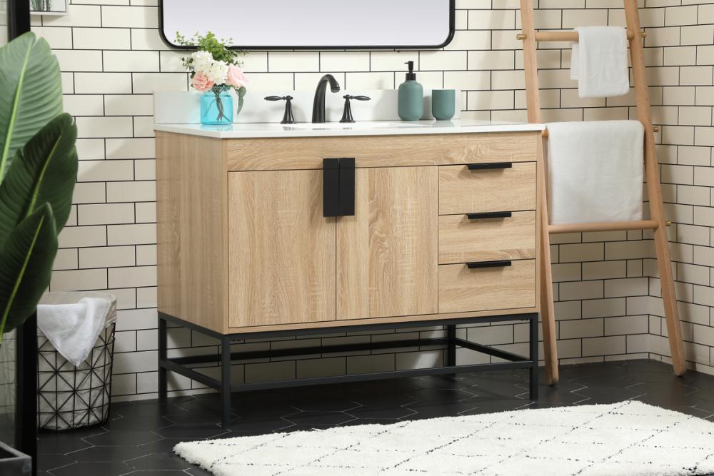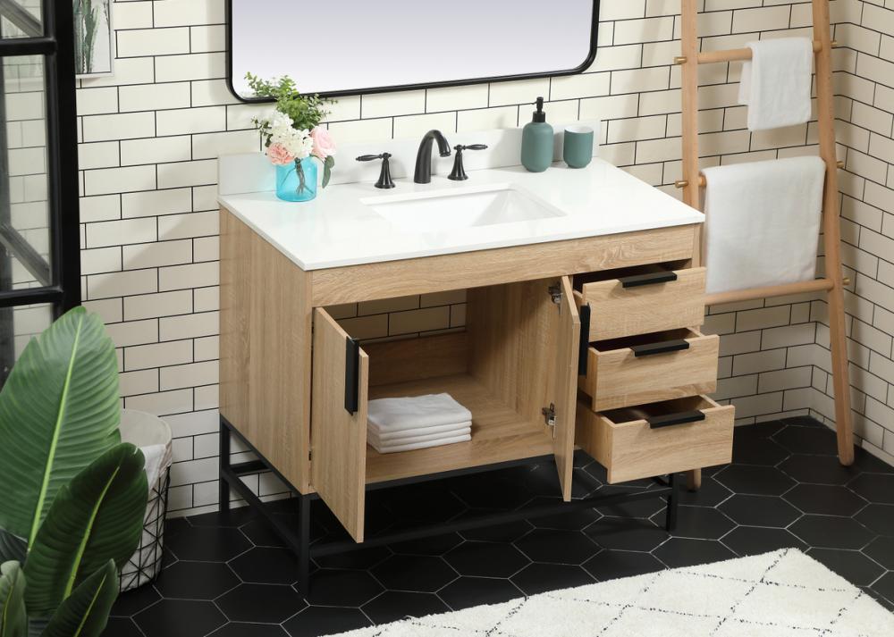 This vanity is a sleek-looking piece of bathroom furniture that is easy to incorporate into your design scheme. The cabinet features a smooth door panel with an oversized steel handle and soft close hinges provide ample room for accessories. Constructed of engineered wood, the powder-coated metal rod legs are an urban industrial look that we love. Minor assembly of the metal legs needed to get this vanity up and running. Comes with a matching backsplash to complete the look and protects your wall.