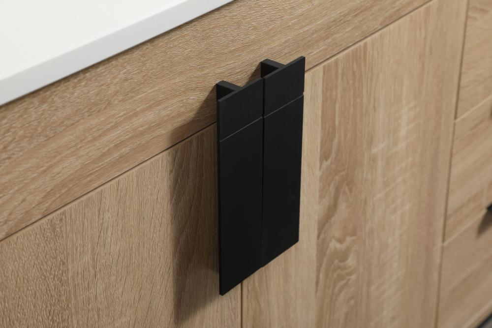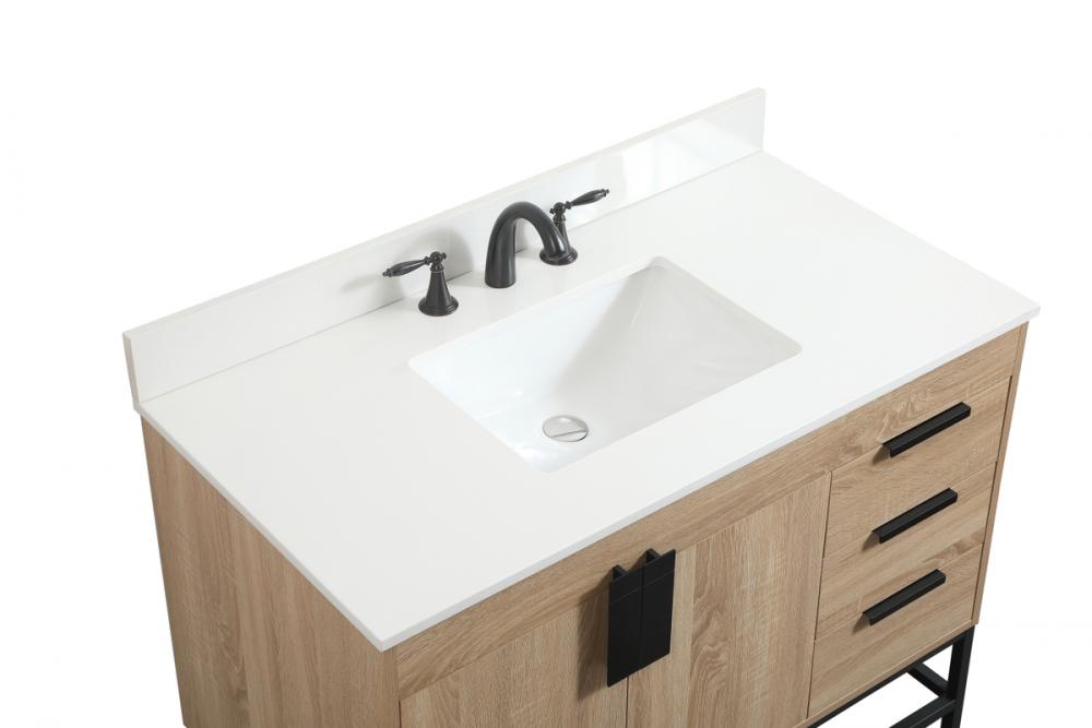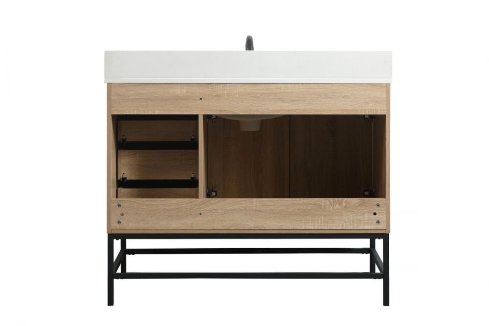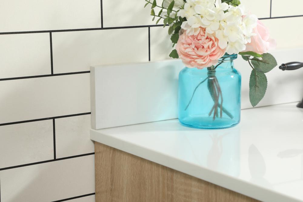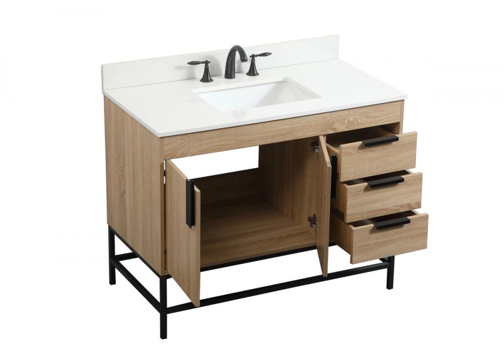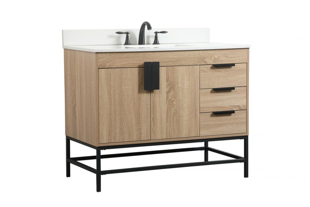 This vanity is a sleek-looking piece of bathroom furniture that is easy to incorporate into your design scheme. The cabinet features a smooth door panel with an oversized steel handle and soft close hinges provide ample room for accessories. Constructed of engineered wood, the powder-coated metal rod legs are an urban industrial look that we love. Minor assembly of the metal legs needed to get this vanity up and running. Comes with a matching backsplash to complete the look and protects your wall.