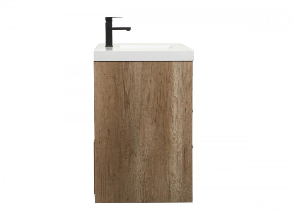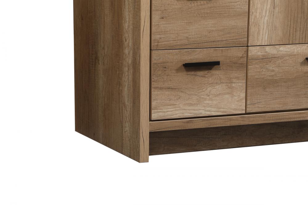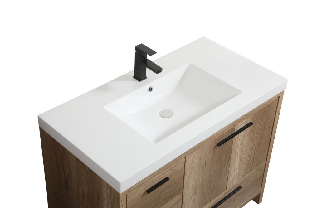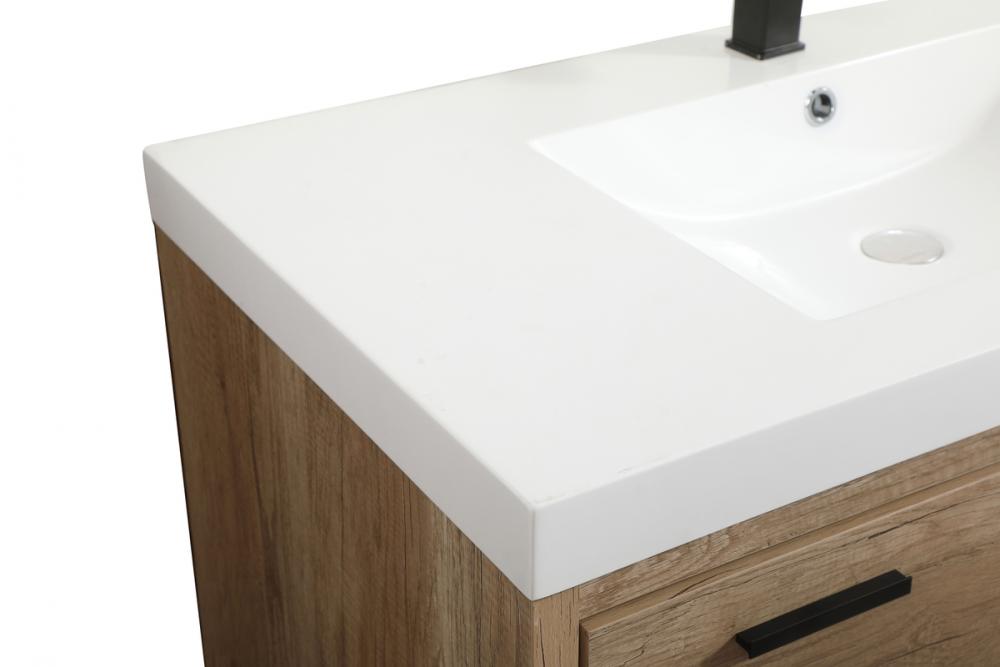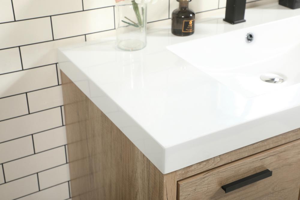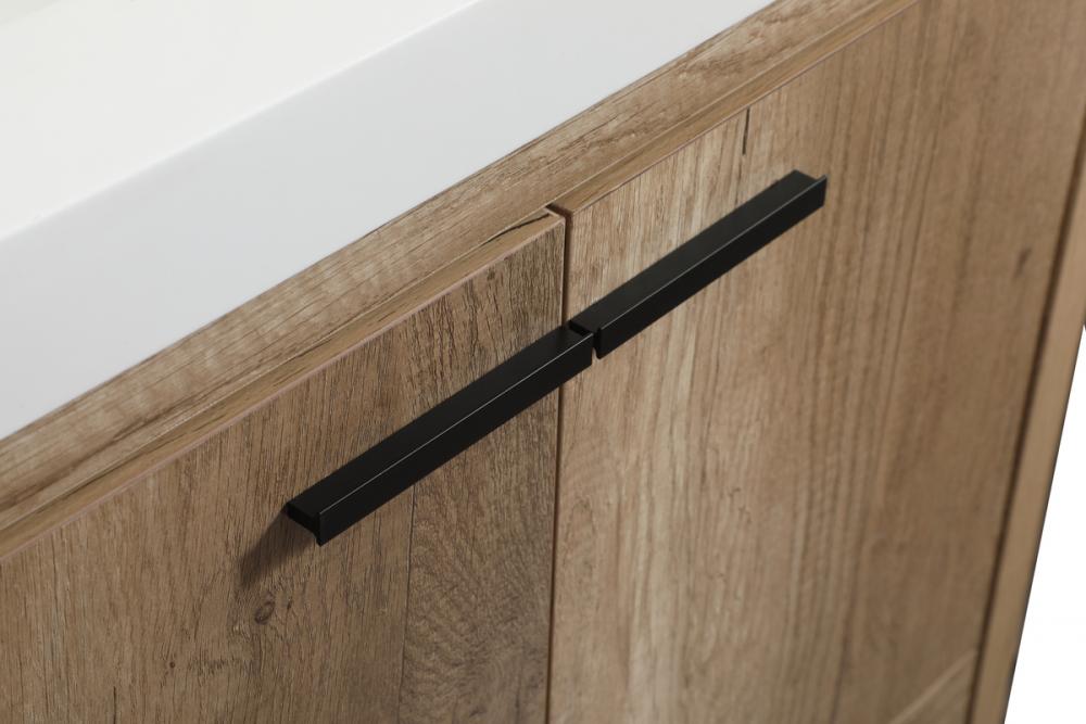 Modern sophistication is defined within the wood finish look and black barpulls of this vanity. Its length makes it the perfect addition to any sized home, and saves space with its storage area hidden behind the double cabinet doors and one bottom drawers. Topped with a highly durable thick resin white counter top and an integrated sink, this modern design will add everlasting class to your bathroom and powder room.