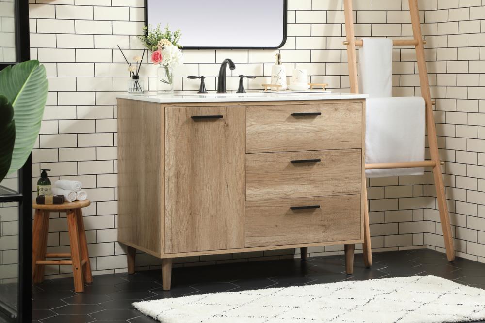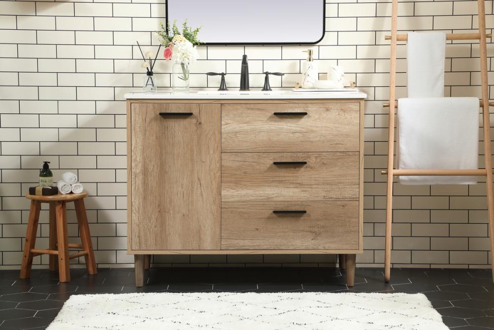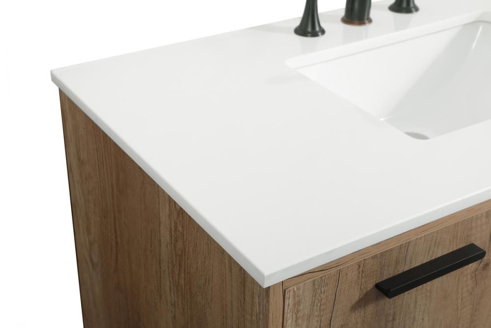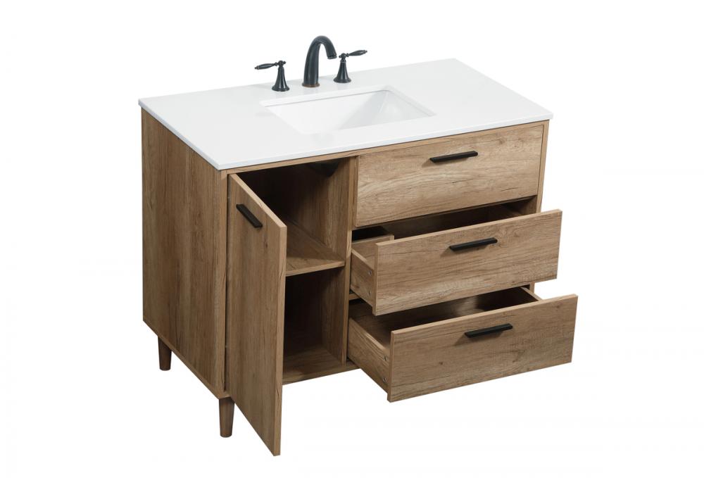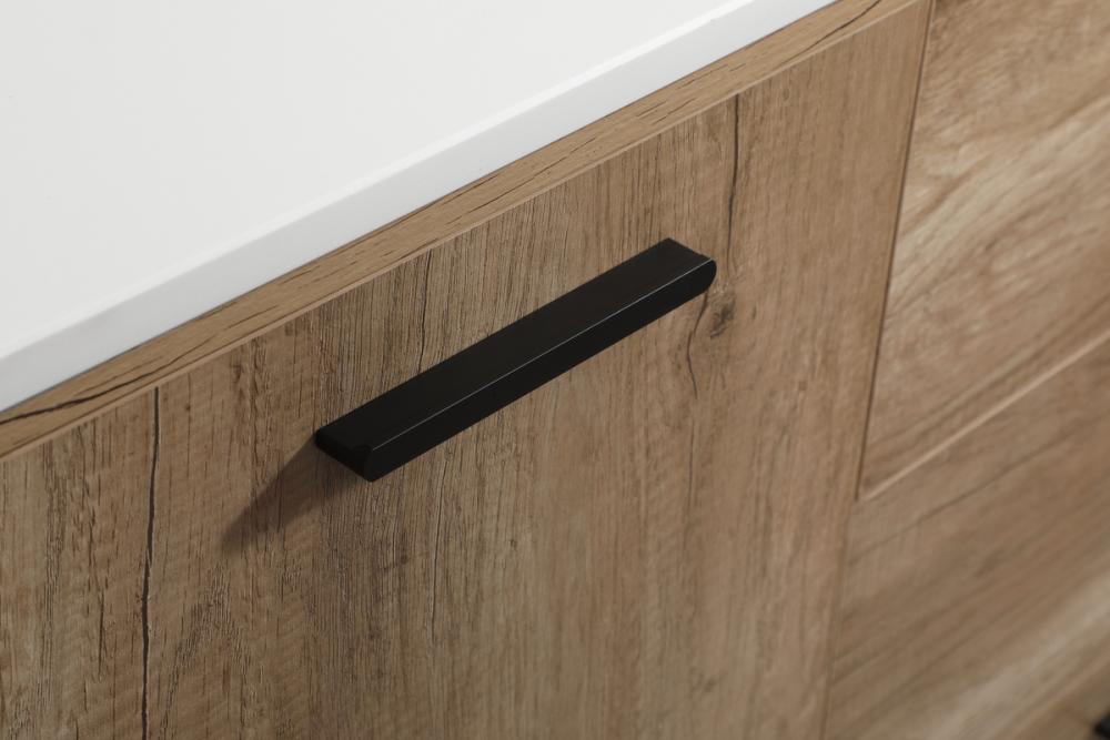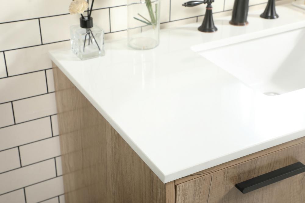 Exquisite modern sophistication is defined with the wood look and black barpulls of this vanity and slender tapered legs. Its length makes it the perfect addition to any sized home, and saves space with its storage area hidden behind the Single cabinet doors and two functional drawers. Topped with a highly durable engineered marble countertop and a porcelain undermount sink, this modern design will become your focal point of your bathroom or powder room. Equipped with soft-closing drawer and doors adds a quiet functional touch.