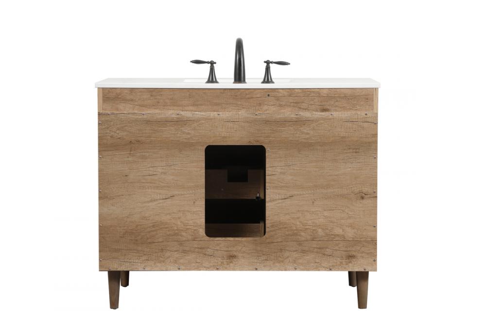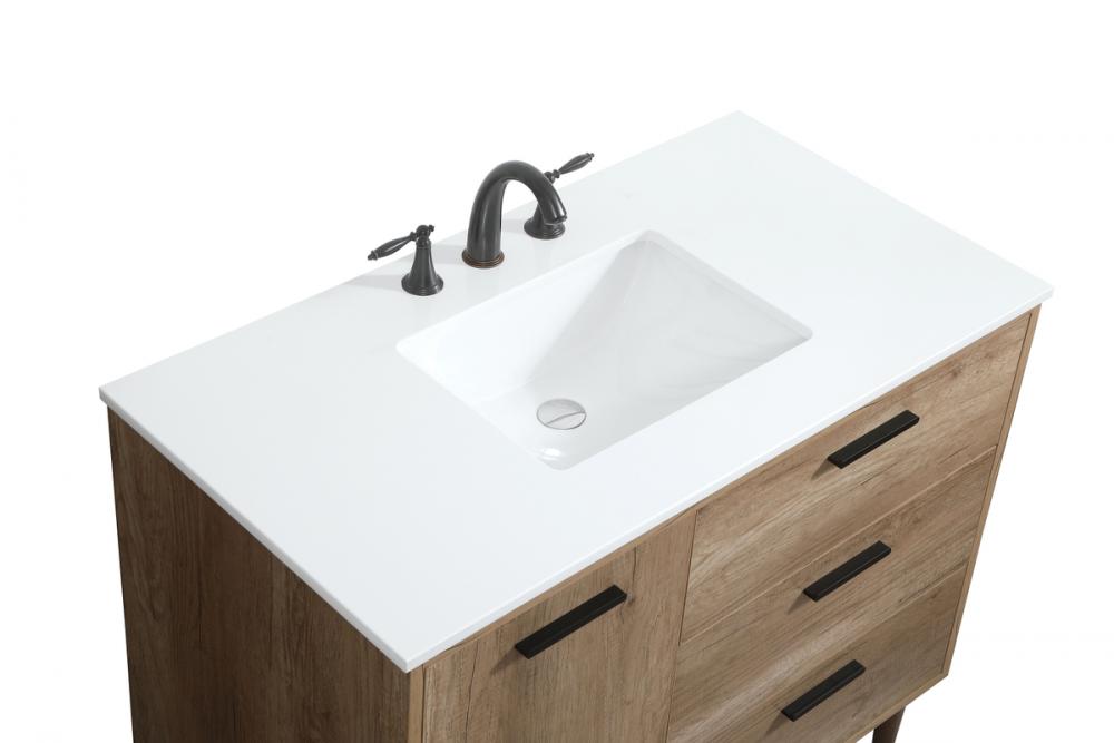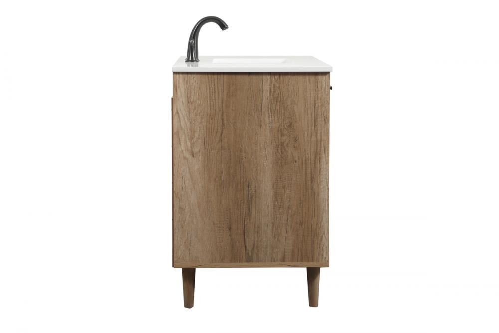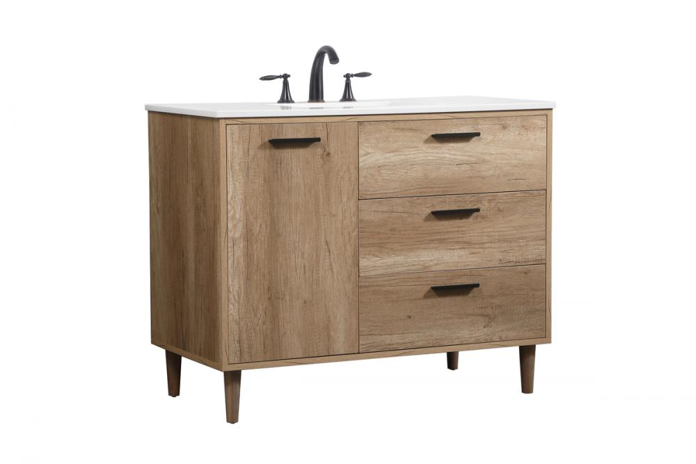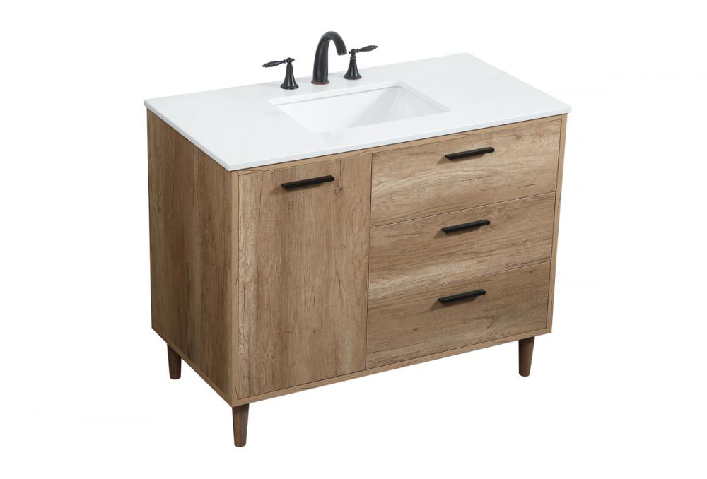 Exquisite modern sophistication is defined with the wood look and black barpulls of this vanity and slender tapered legs. Its length makes it the perfect addition to any sized home, and saves space with its storage area hidden behind the Single cabinet doors and two functional drawers. Topped with a highly durable engineered marble countertop and a porcelain undermount sink, this modern design will become your focal point of your bathroom or powder room. Equipped with soft-closing drawer and doors adds a quiet functional touch.