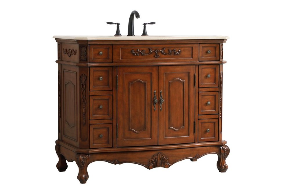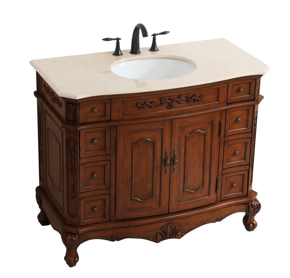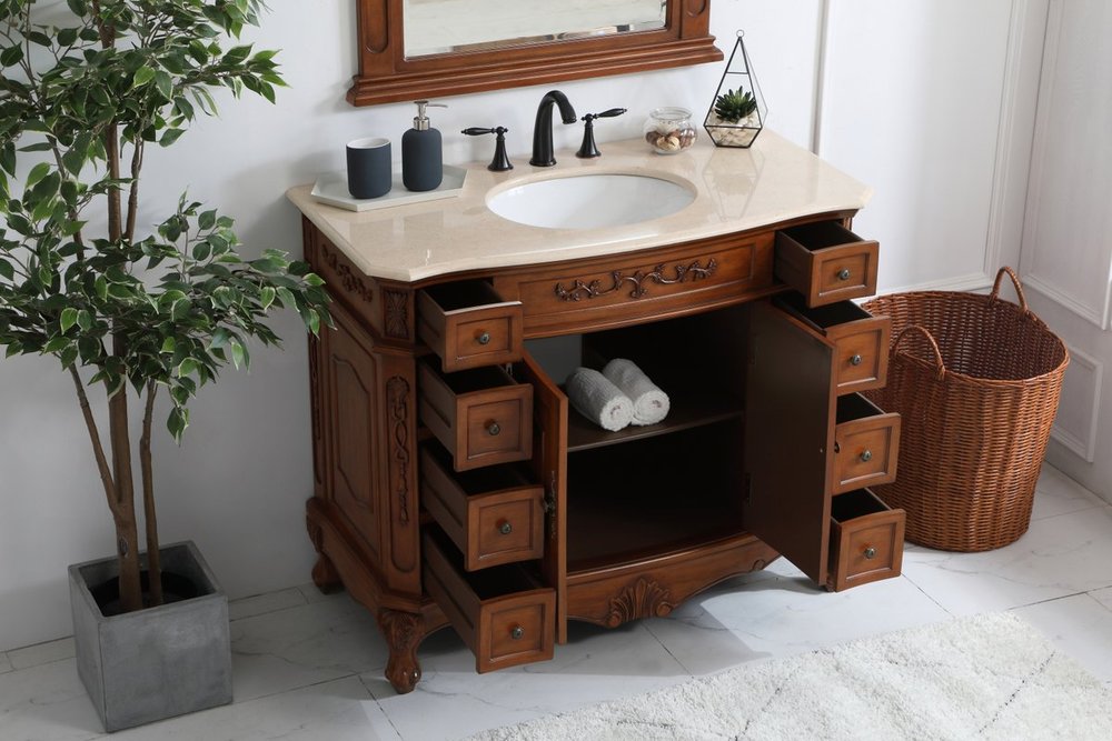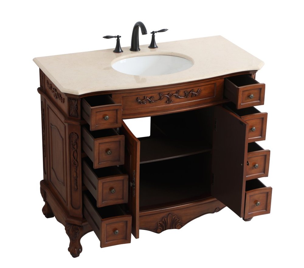 The Danville collection 42" vanity in a teak finish brings about traditional beauty. Decorated with ornate filigrees and engravings throughout, your bathroom or powder room will exude refined beauty. Don't let the design fool you, the cream marble countertop and porcelain undermount sink allows for space to get ready, while the antique bronze hardware allows you to discover storage spaces with ease. The simple knobs allows you to glide the 8 side drawers out, while the ornate knobs help you open the two center cabinet doors. You and your guests will marvel at this vanity that will both store away your bathroom essentials and enhance the aesthetics of your room.