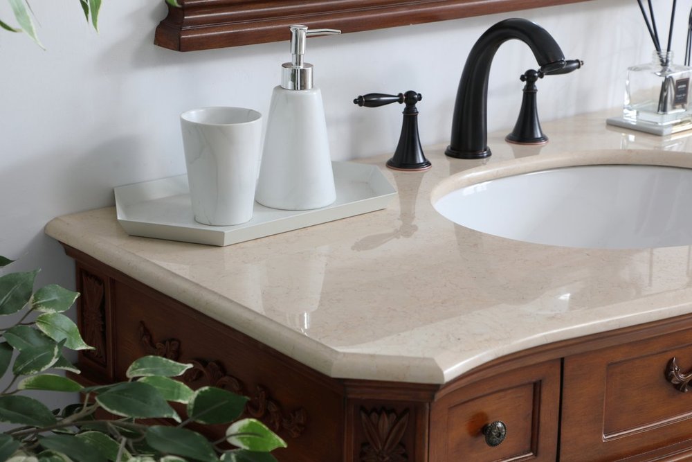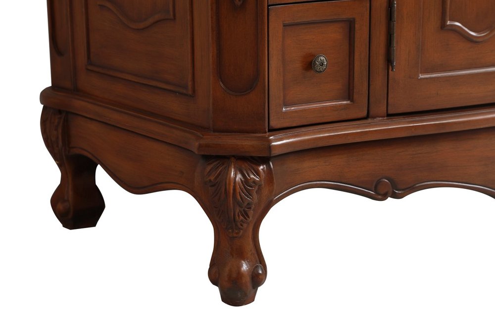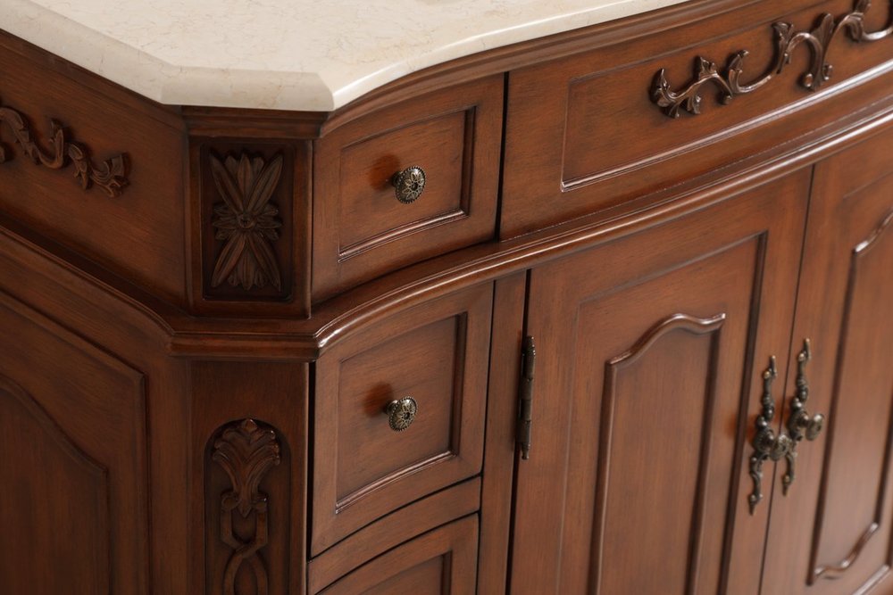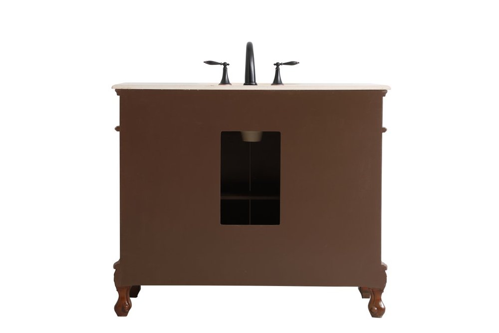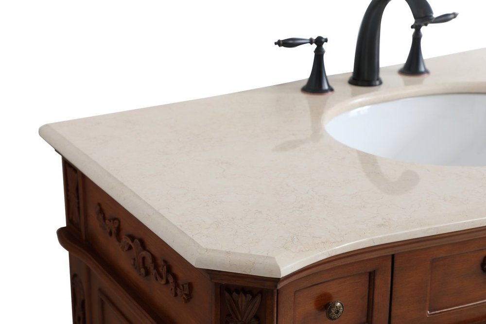 The Danville collection 42" vanity in a teak finish brings about traditional beauty. Decorated with ornate filigrees and engravings throughout, your bathroom or powder room will exude refined beauty. Don't let the design fool you, the cream marble countertop and porcelain undermount sink allows for space to get ready, while the antique bronze hardware allows you to discover storage spaces with ease. The simple knobs allows you to glide the 8 side drawers out, while the ornate knobs help you open the two center cabinet doors. You and your guests will marvel at this vanity that will both store away your bathroom essentials and enhance the aesthetics of your room.
