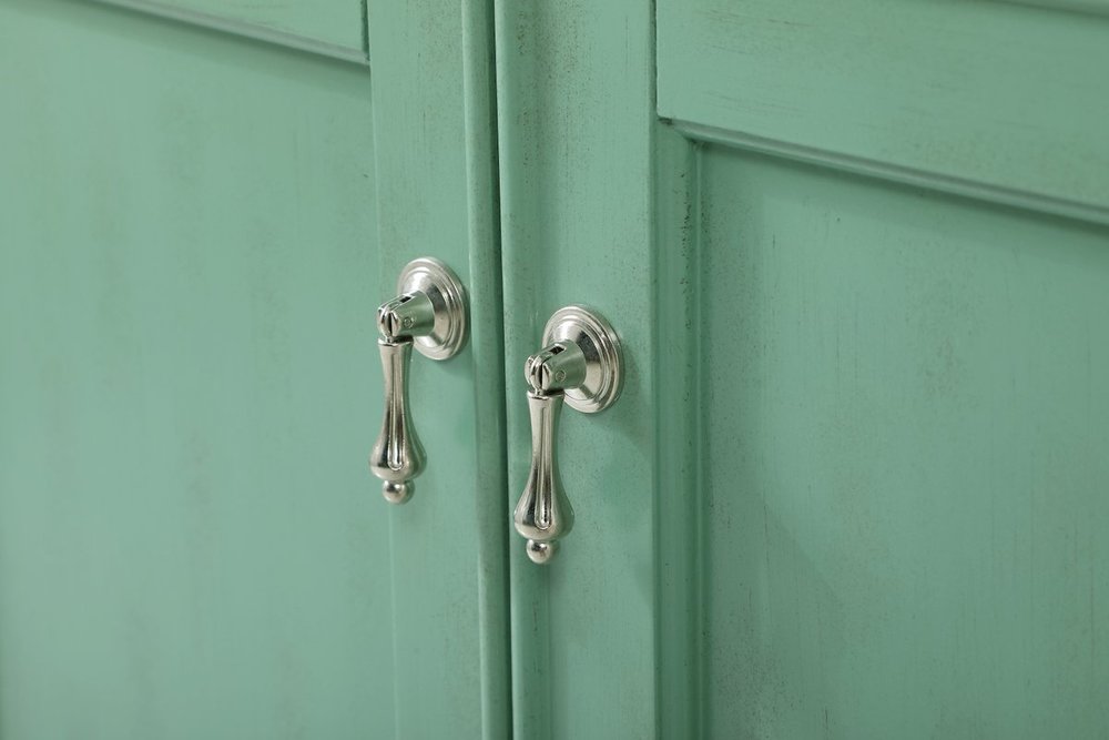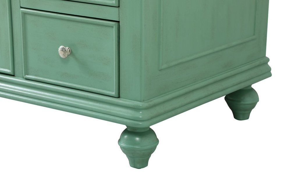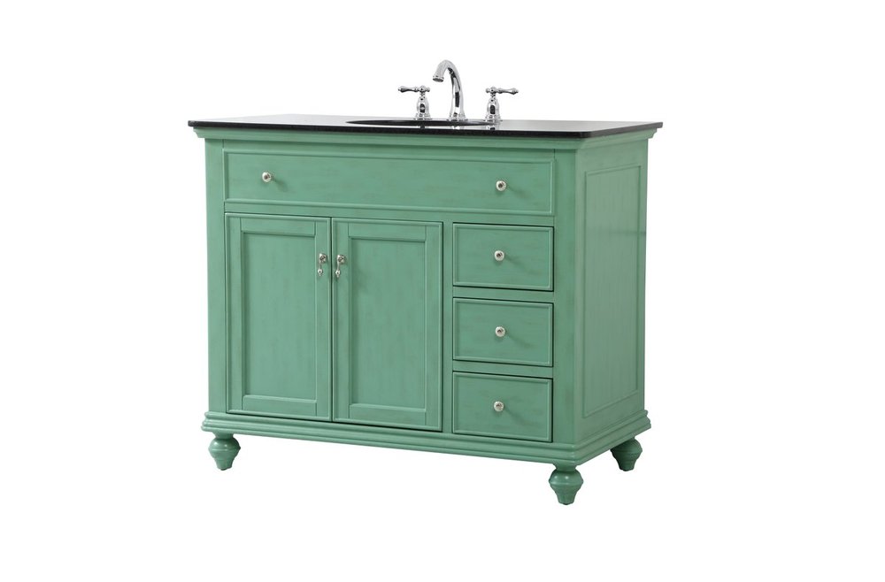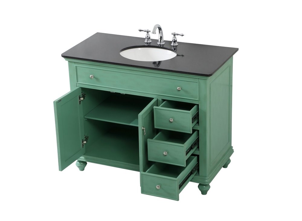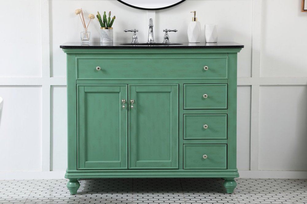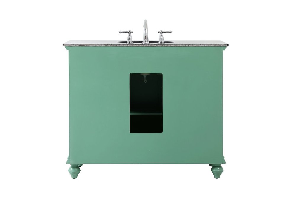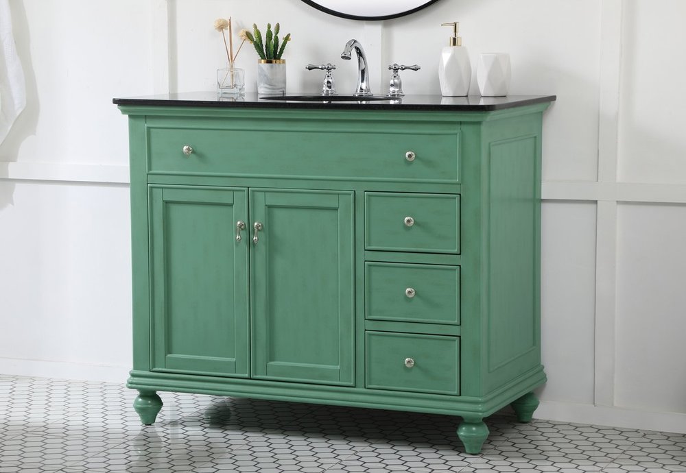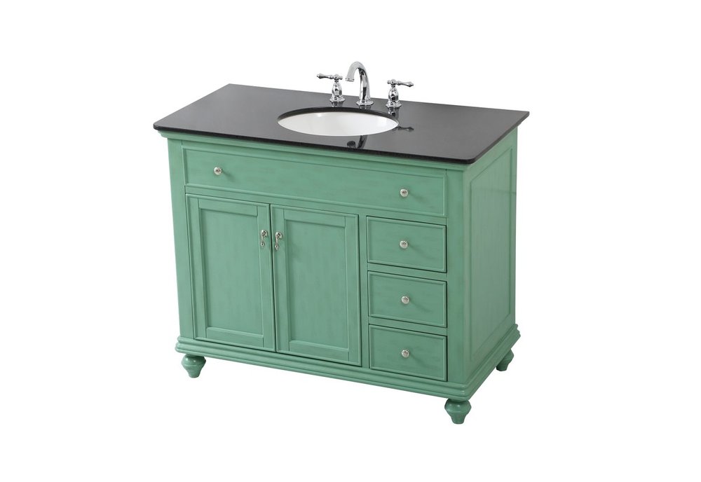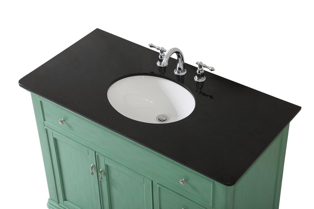 Create a refined and relaxing bath space with this contemporary design vanity, presenting its simplicity and clean straight lines in a minimalist appeal. This vanity, crafted of solid poplar wood and engineered wood panels, provides ample storage within its soft-close cabinet door, accentuated with metal hardware. Rounding out the design is a black granite top with a white porcelain under-mount oval sink. Convenient access for plumbing installation with cut out back panel. Hand painted finish with distressing application to provide an antique effect.