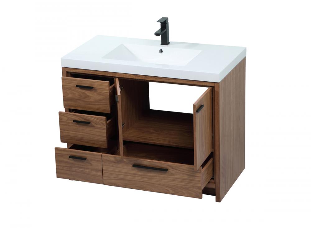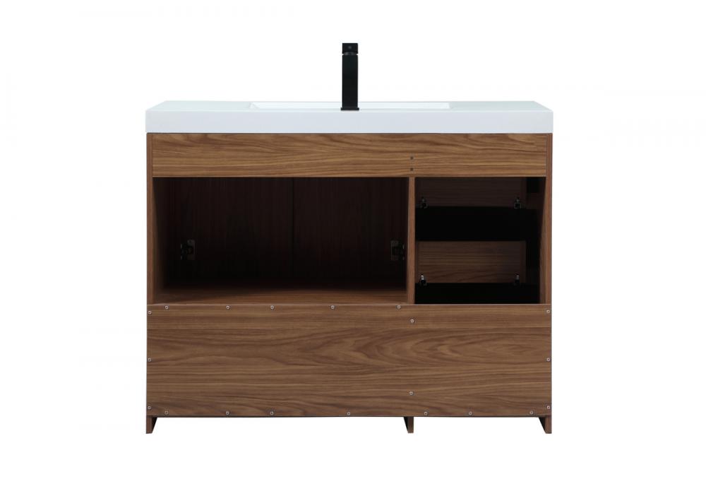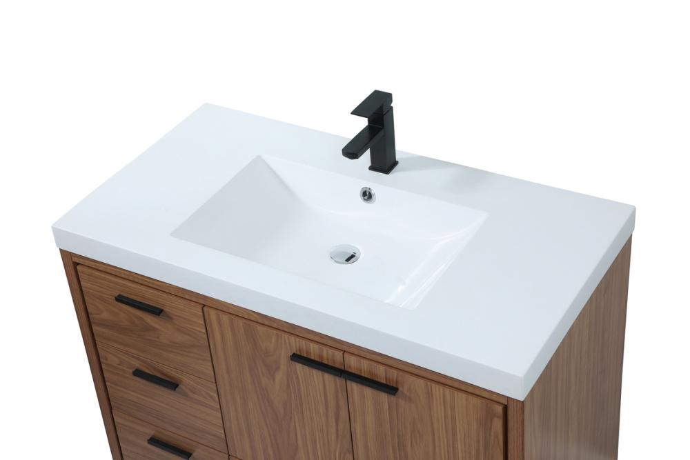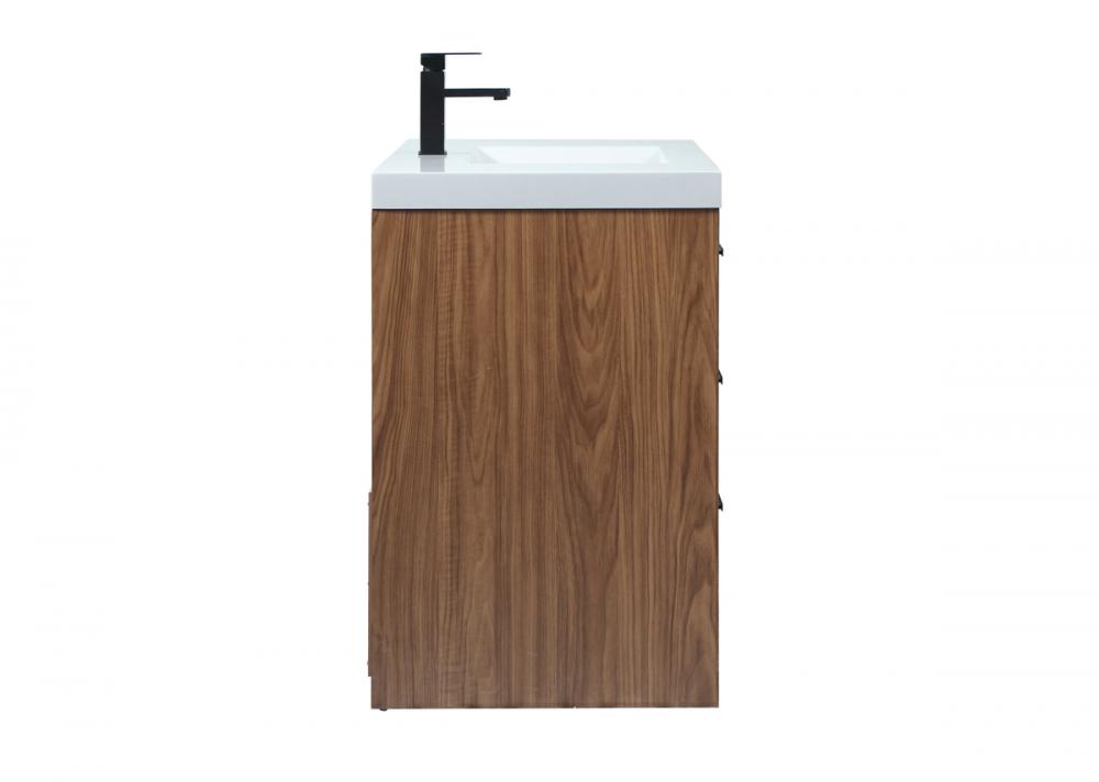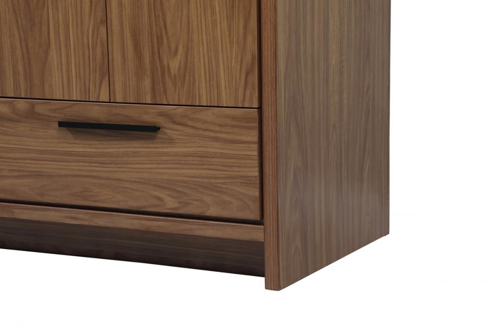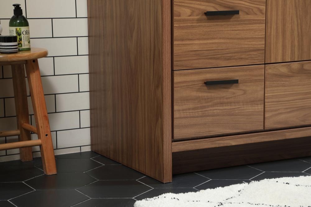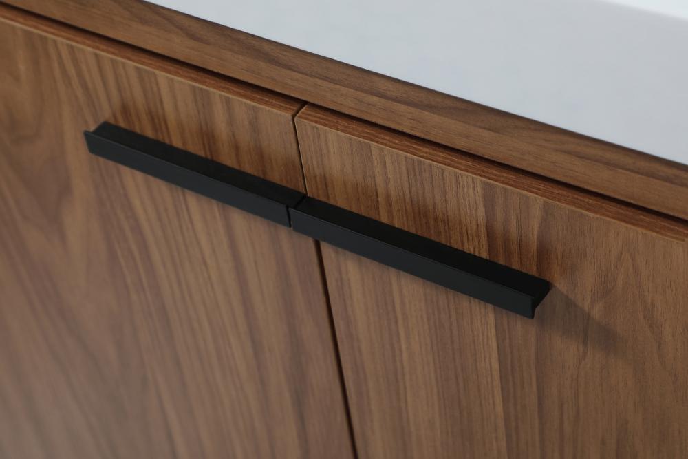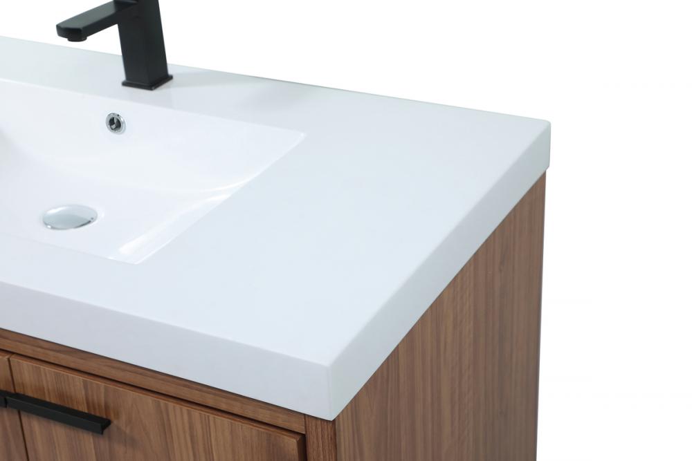 Modern sophistication is defined within the wood finish look and black barpulls of this vanity. Its length makes it the perfect addition to any sized home, and saves space with its storage area hidden behind the double cabinet doors and one bottom drawers. Topped with a highly durable thick resin white counter top and an integrated sink, this modern design will add everlasting class to your bathroom and powder room.