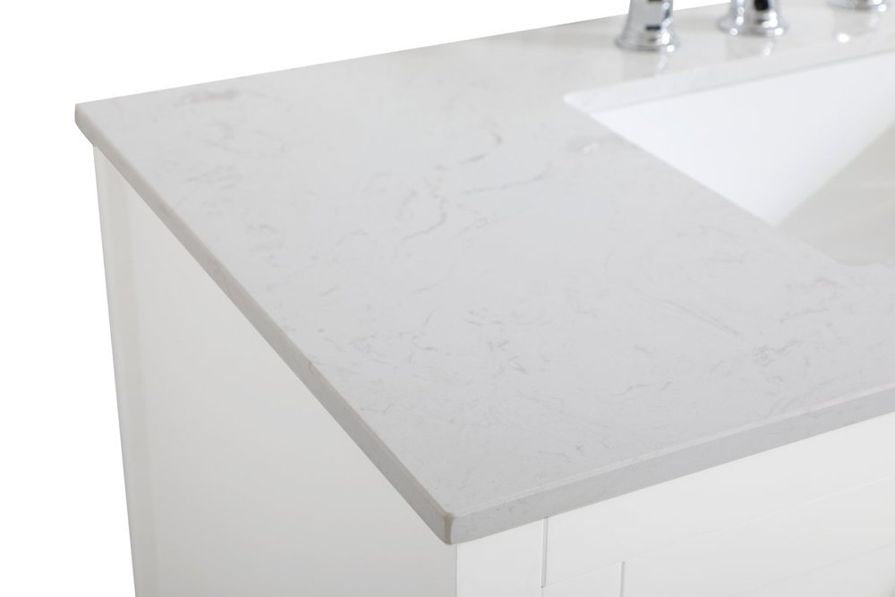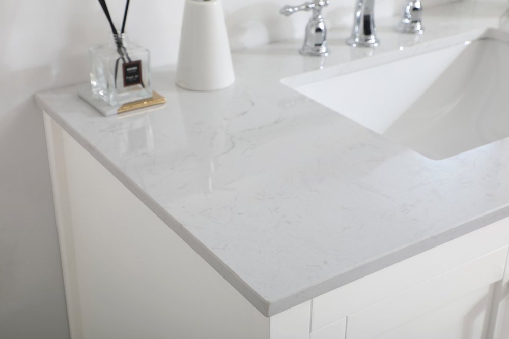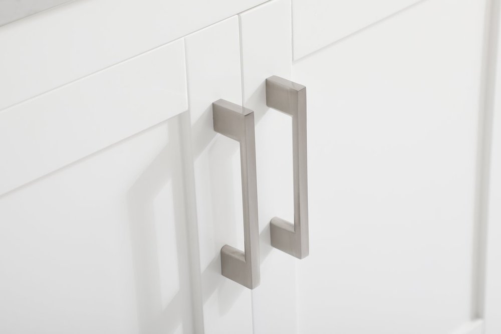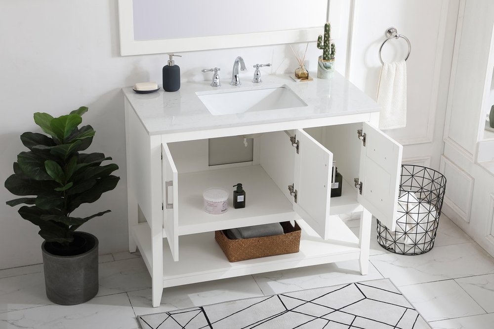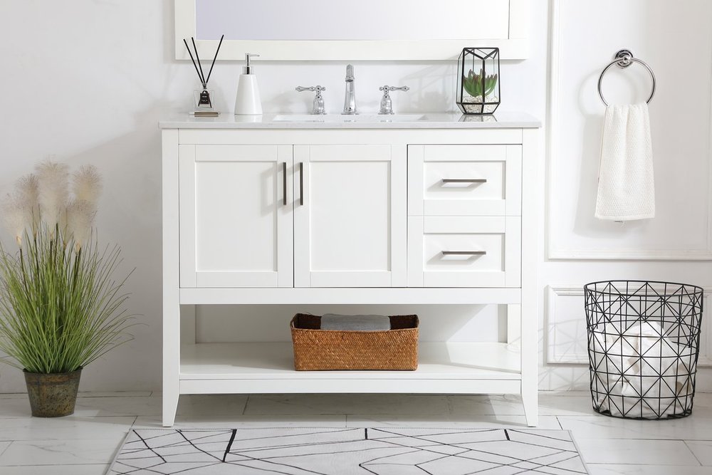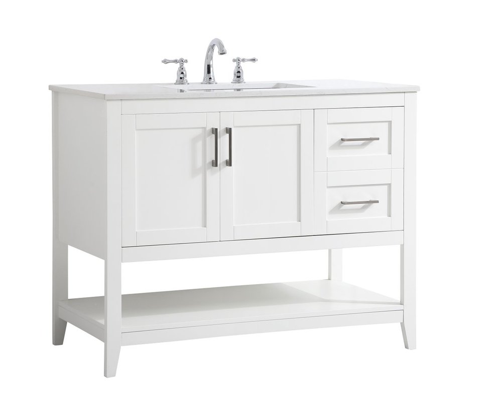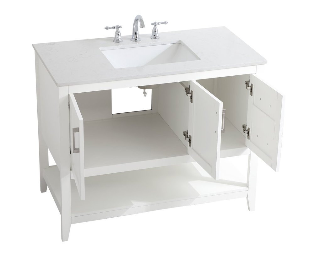 The nonchalant attitude of this 42" traditional white finish vanity will have you wanting more. The slender brushed nickel handle bars open the 3 cabinet doors to reveal ample storage space to put away and store bathroom essentials, and the open space below allows for you to place clean towels on the rack. Topped with a Calacatta engineered marble countertop, you and your guests will enjoy this easy going vanity.