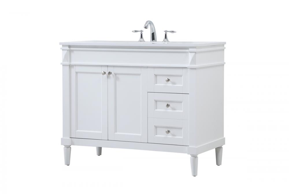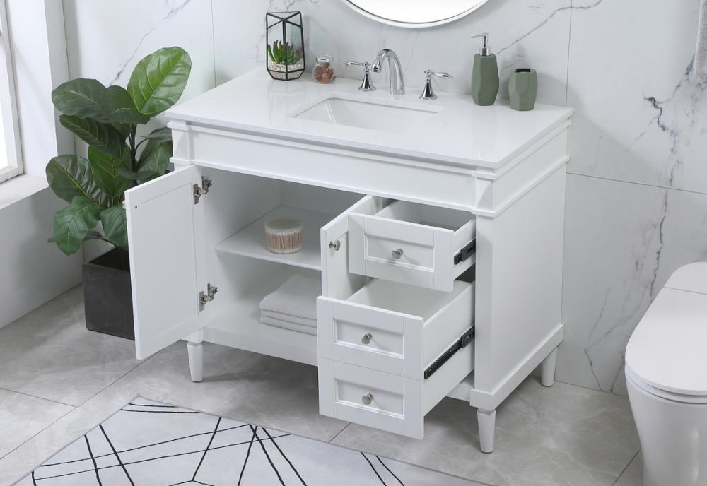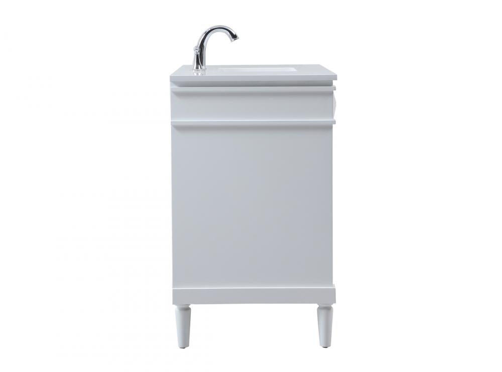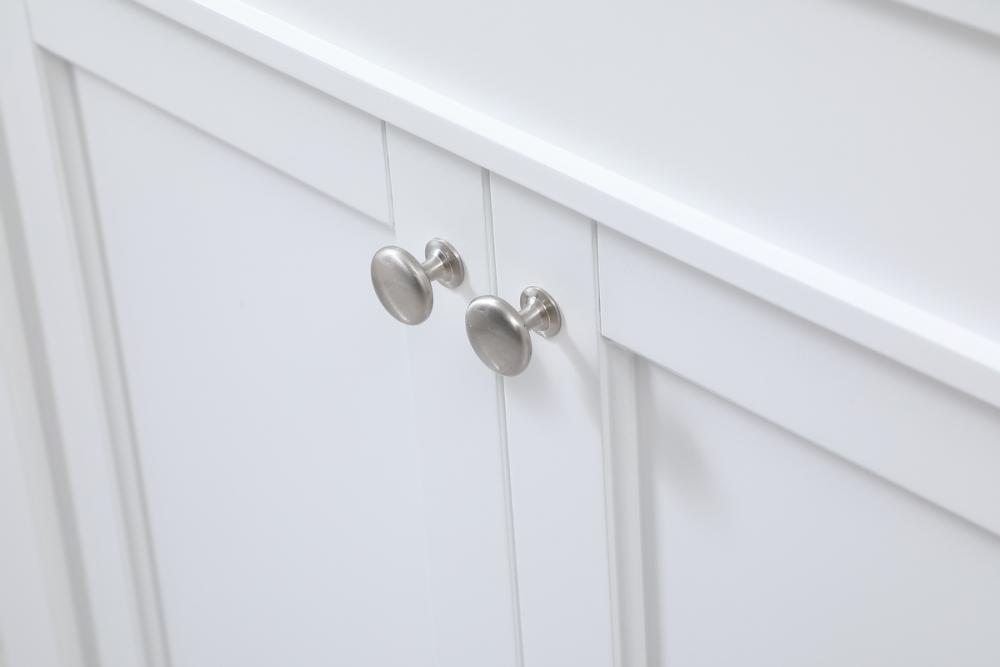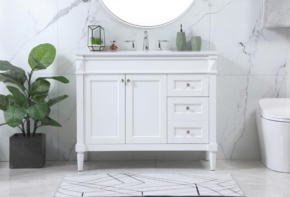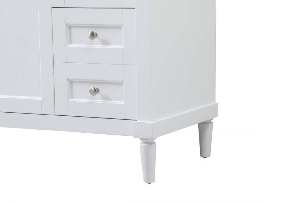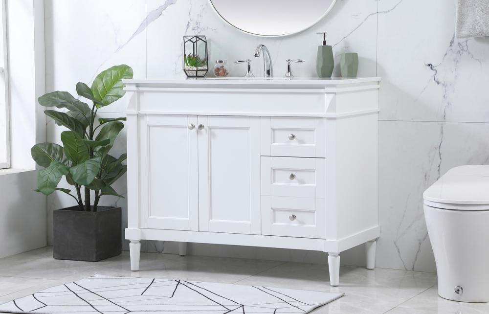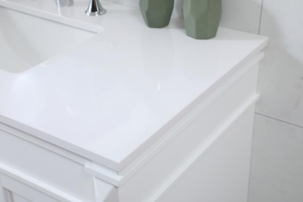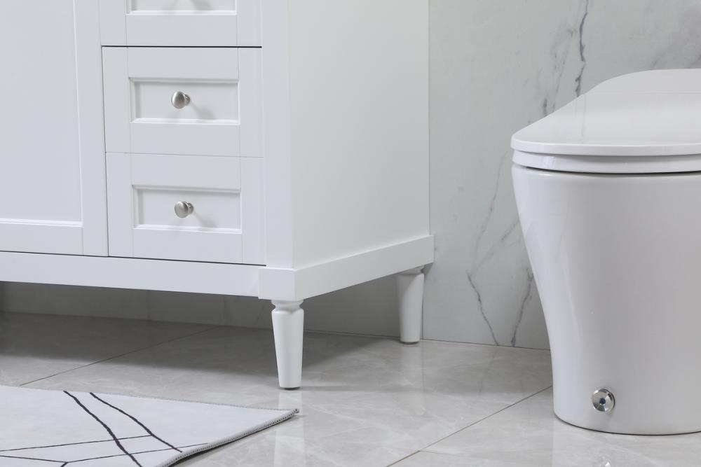 This transitional vanity is a beautiful piece of bathroom furniture will look amazing in your design scheme. The cabinet features a shaker style smooth door panel with simple round knobs and soft close hinges provide ample room for accessories. Packed with multiple side drawers with soft close glides for added comfort and full access to bath supplies. Convenient deep drawer stores all of your tall bath essentials. Constructed of engineered wood and solid wood legs with hand painted finish. The durable engineered marble countertop is a versatile material in an ivory white finish. Minor assembly of the legs needed to get this vanity up and running.