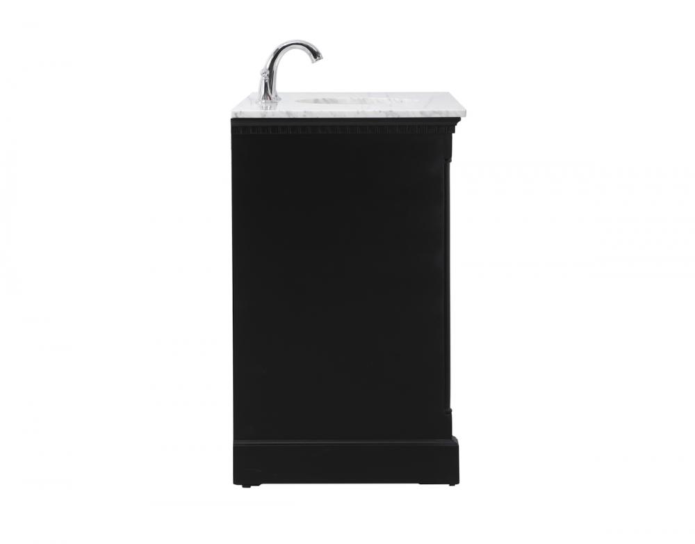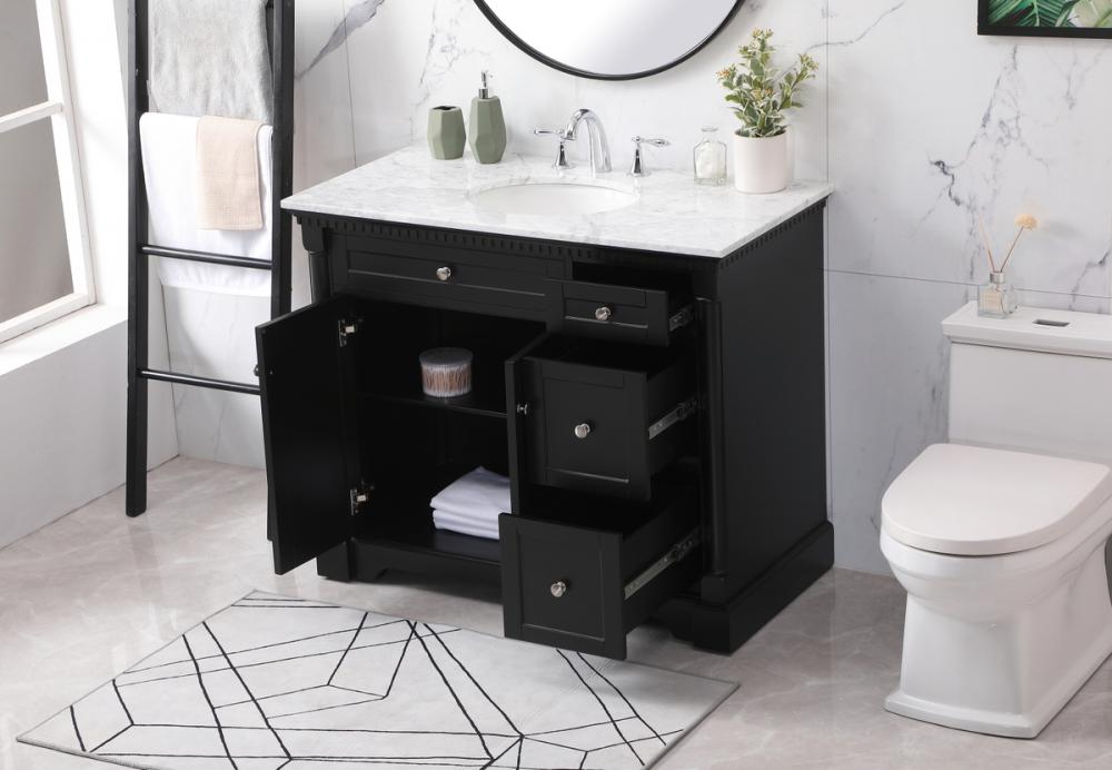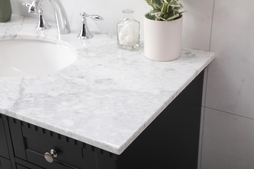 Make the most of your space with this traditional style bathroom vanity. Its traditional style is able to complement many aesthetics, natural marble countertop, and the round brushed nickel knobs that sits above the soft closing doors, allowing you to store an assortment of bathroom essentials. The lower shelf makes it the perfect space to hold new towels for your guests. This compact vanity ensures both form and function in your bathroom or powder room for you and your guests.