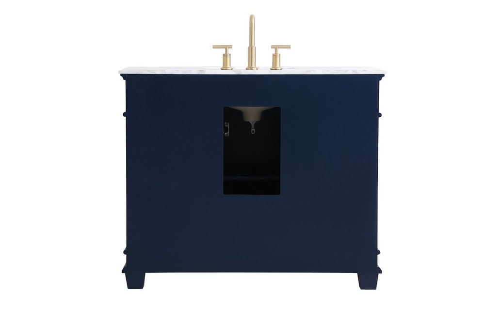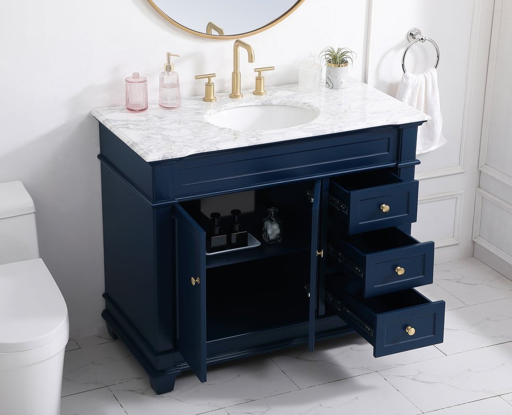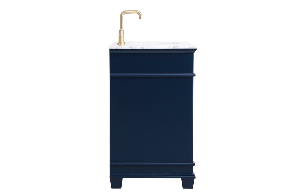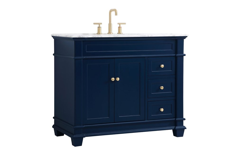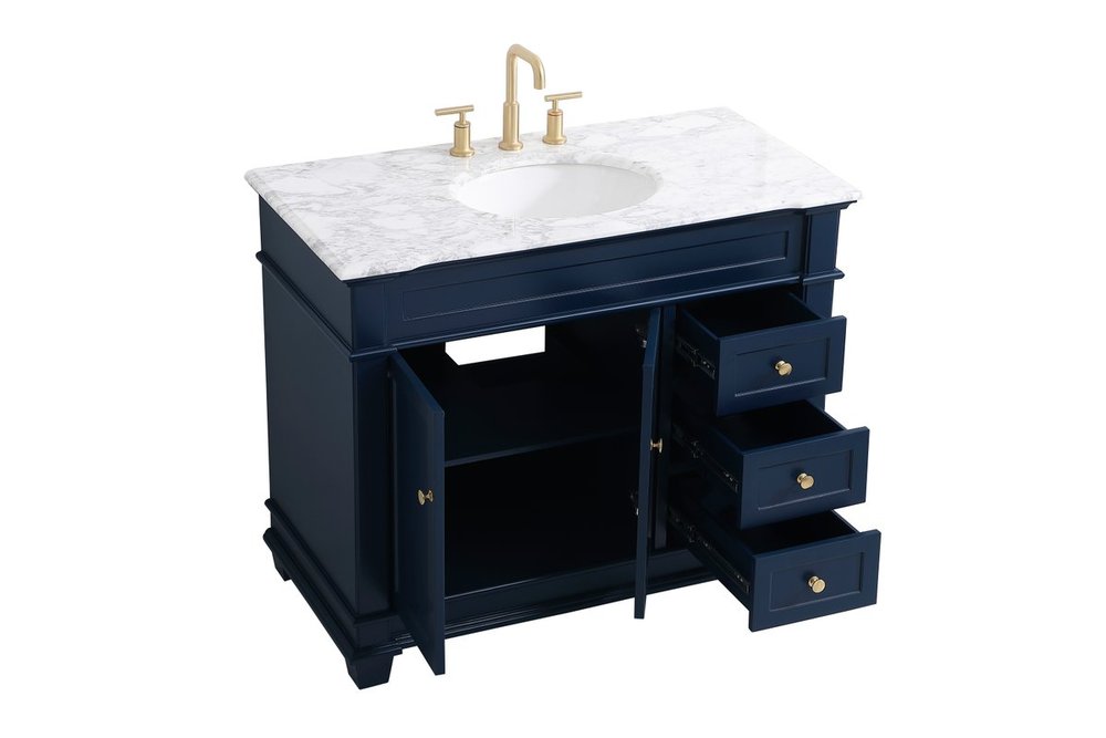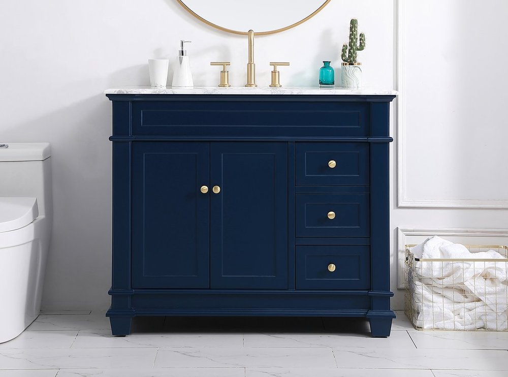 The Wesley Collection vanity cabinet will bring a settle pop of color into your bathroom. The navy blue is a cool color which creates a calming atmosphere in the room. The gold knobs bring a vibrant touch to balance the vanity. With the detailed engravings, the cabinet catches eyes with its beautiful lining work. Open the cabinet doors to store what you desire and make use of the spacious area. To top it off, the Carrara white marble adds a luxury and modern finish to the countertop.