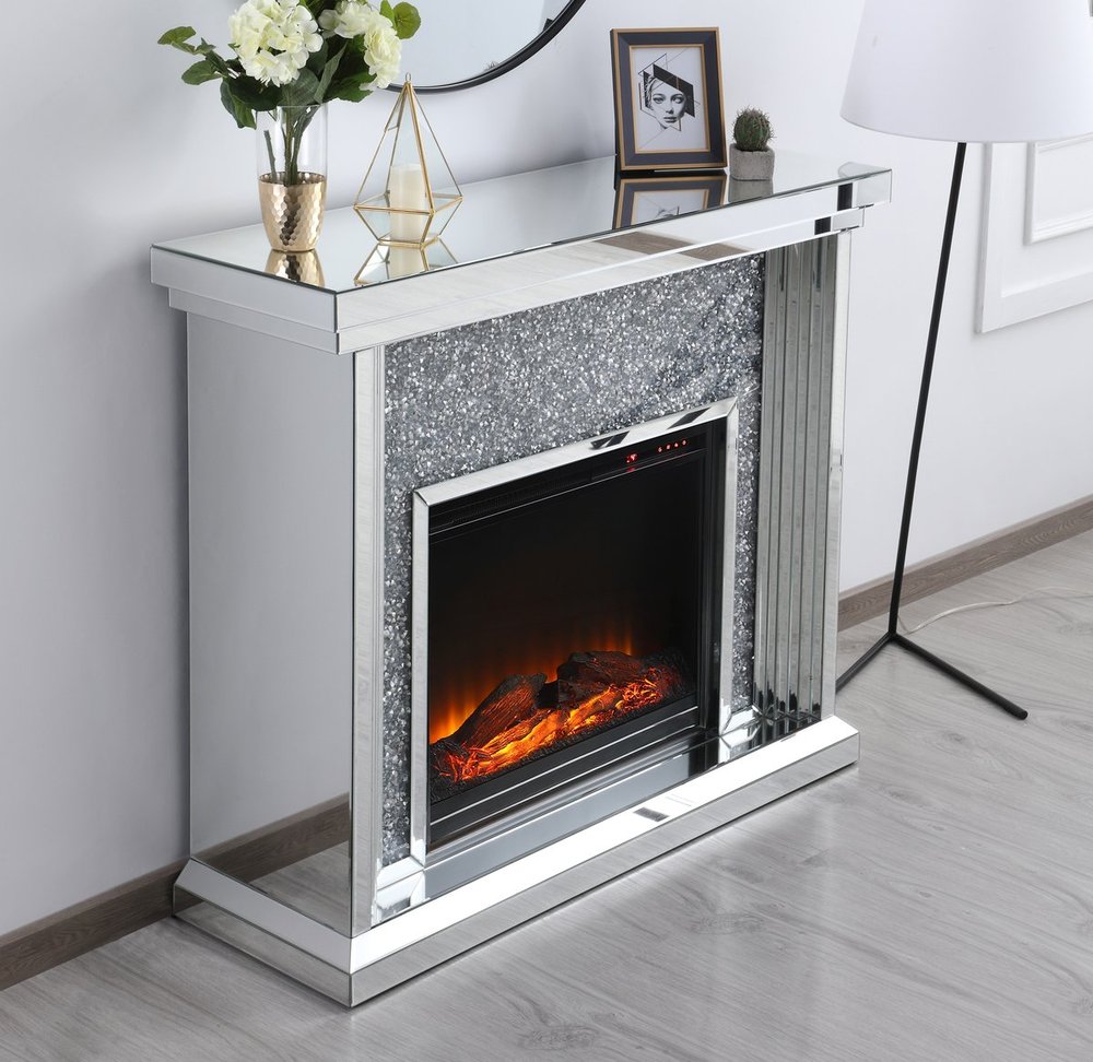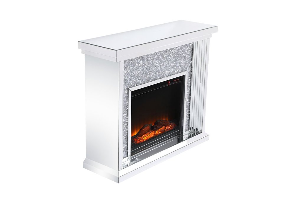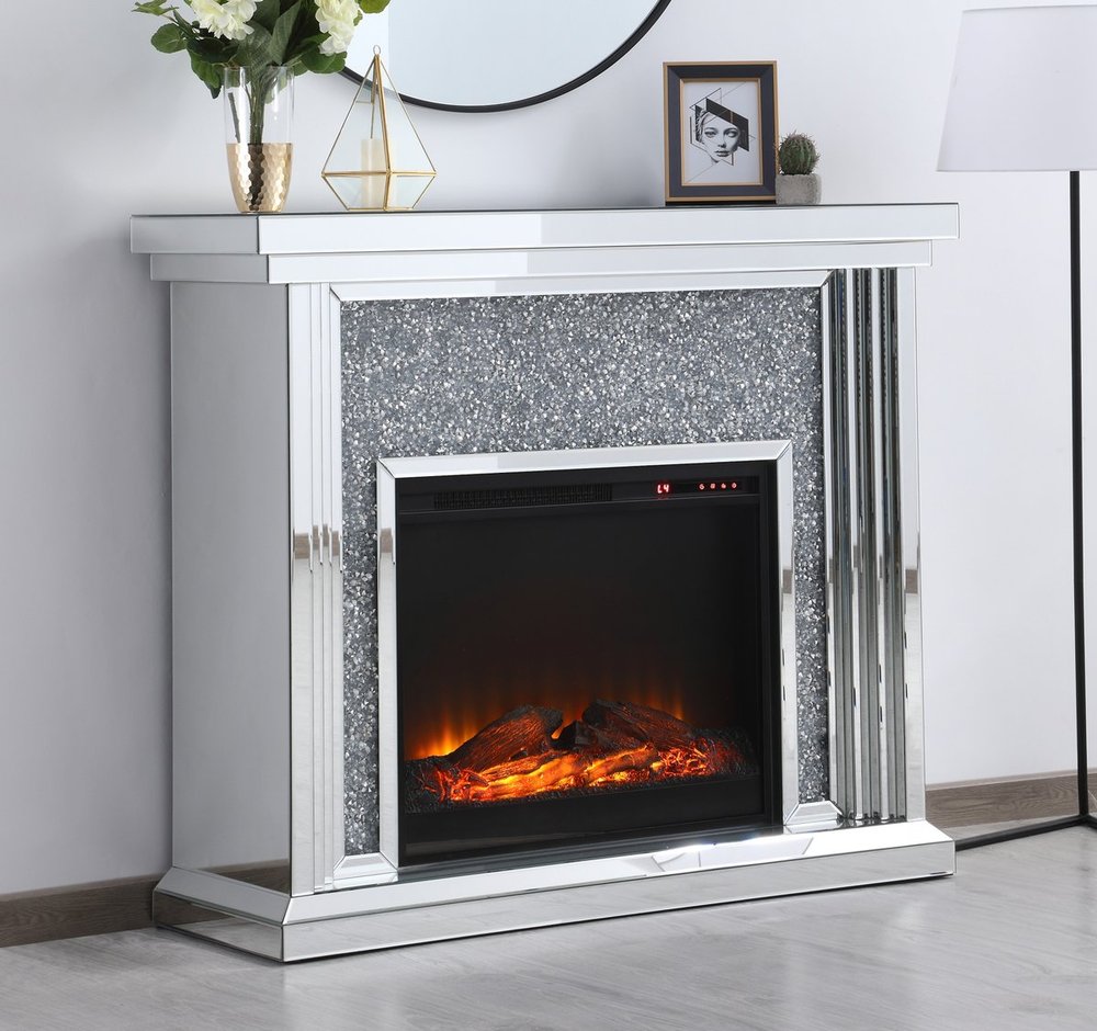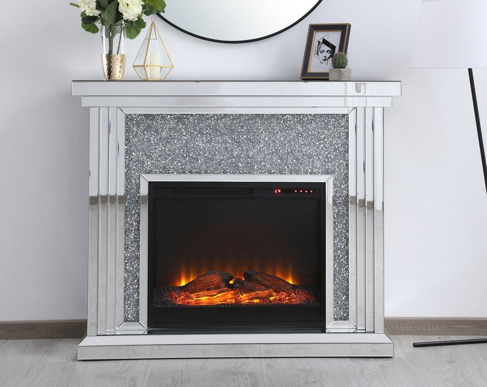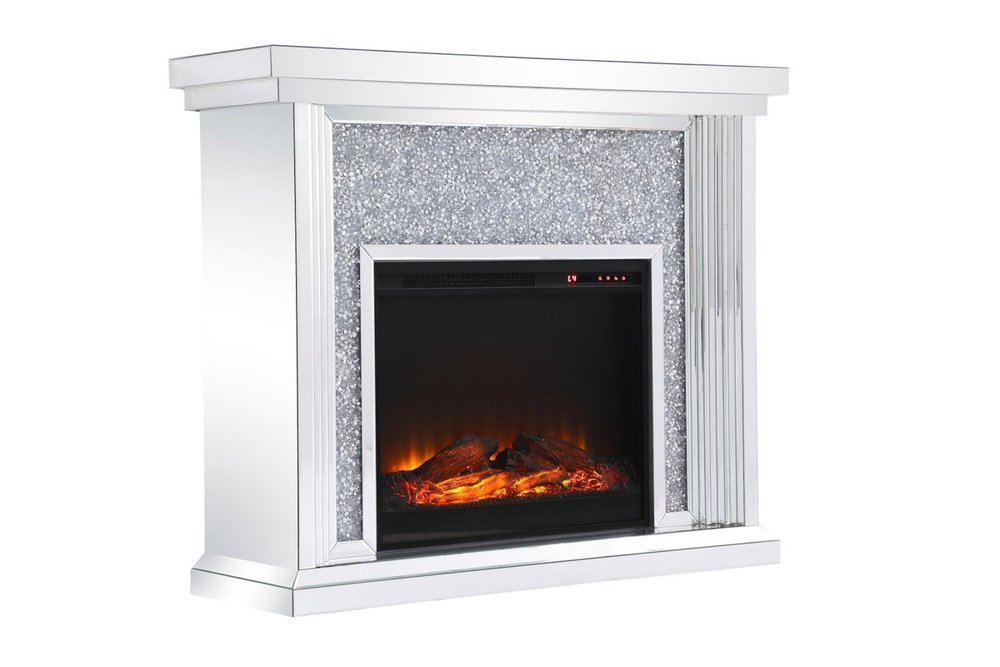 Dressed in a galaxy of dazzling Silver crystals and accentuated with gleaming mirror panels, this fireplace is never one to shy away from the spotlight. Whether you are hosting a formal dinner party with associates or a casual get together with your loved ones, the comfort of the crackling fire in the wood log insert will put all your guests in a relaxed and merry mood. Show off your own personality by decorating the mantle with your treasures--family portraits, prized works of art, or fragrant flowers.
