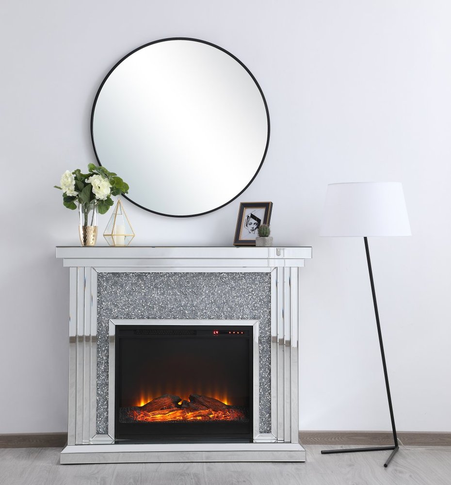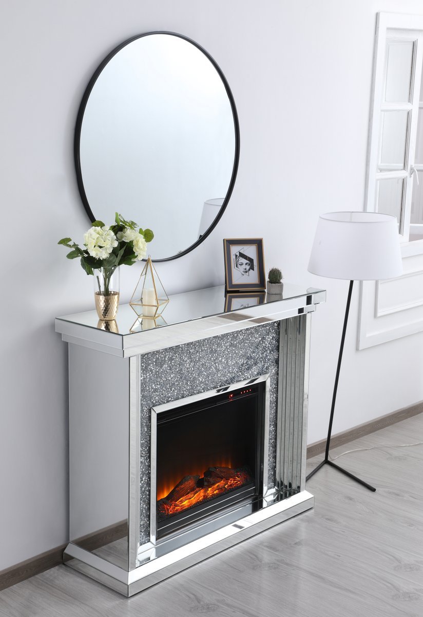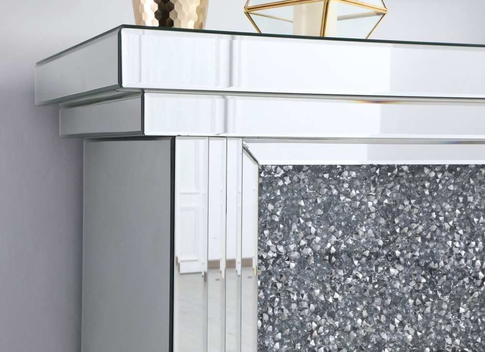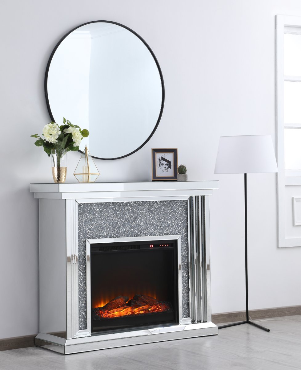 Dressed in a galaxy of dazzling Silver crystals and accentuated with gleaming mirror panels, this fireplace is never one to shy away from the spotlight. Whether you are hosting a formal dinner party with associates or a casual get together with your loved ones, the comfort of the crackling fire in the wood log insert will put all your guests in a relaxed and merry mood. Show off your own personality by decorating the mantle with your treasures--family portraits, prized works of art, or fragrant flowers.