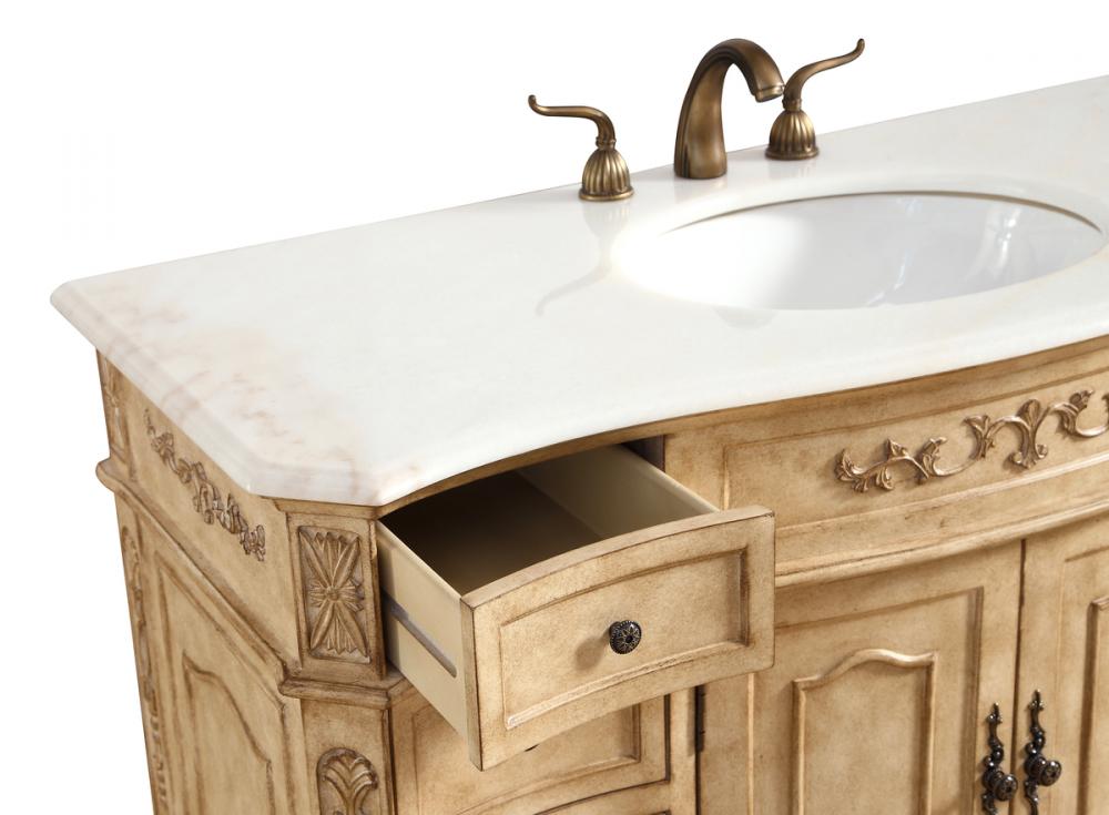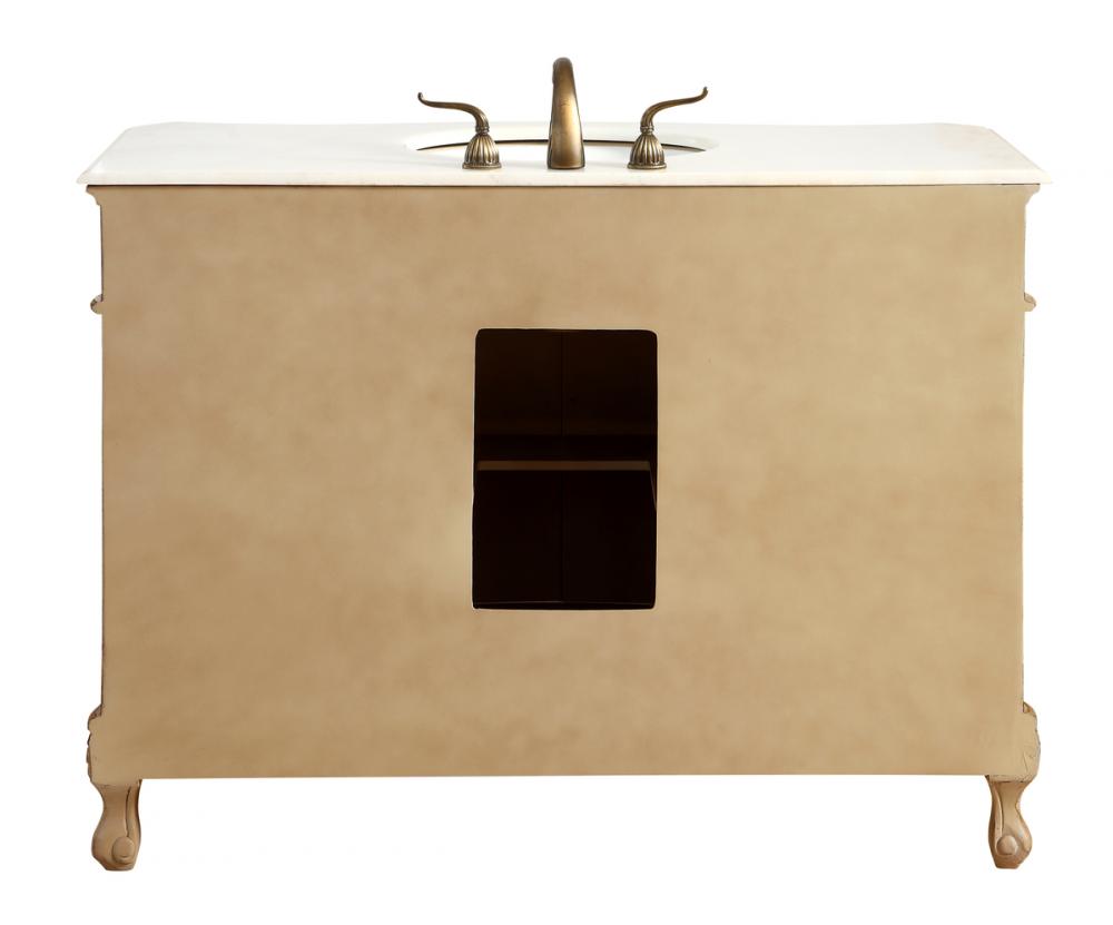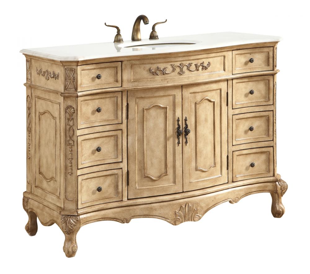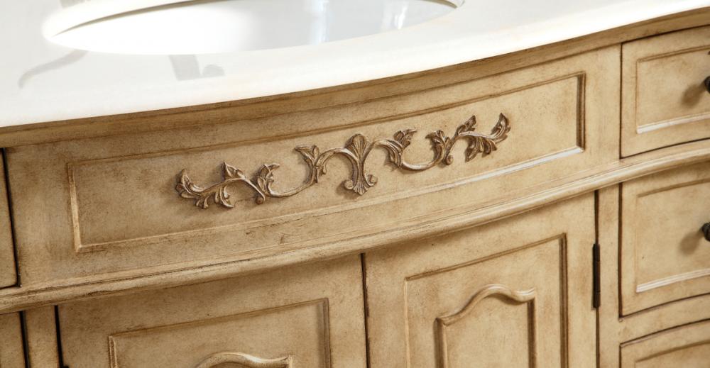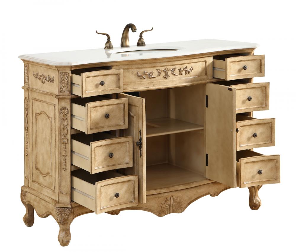 This superb balance of timeless tradition and opulent beauty in a marble-topped vanity will certainly enhance the aesthetics of any home or office bathroom! Featuring an authentic natural white marble countertop—occasionally with light brown veining, complimenting the hand painted antique beige cabinet—oval white porcelain under mount sink, 2 doors and 8 drawers, as well as antique bronze finish door knobs, a superbly carved floral design, stands on stylishly carved solid wood French scroll feet. A truly rich statement of luxury! Measurements: W48” x D21” x H35”, fully assembled.